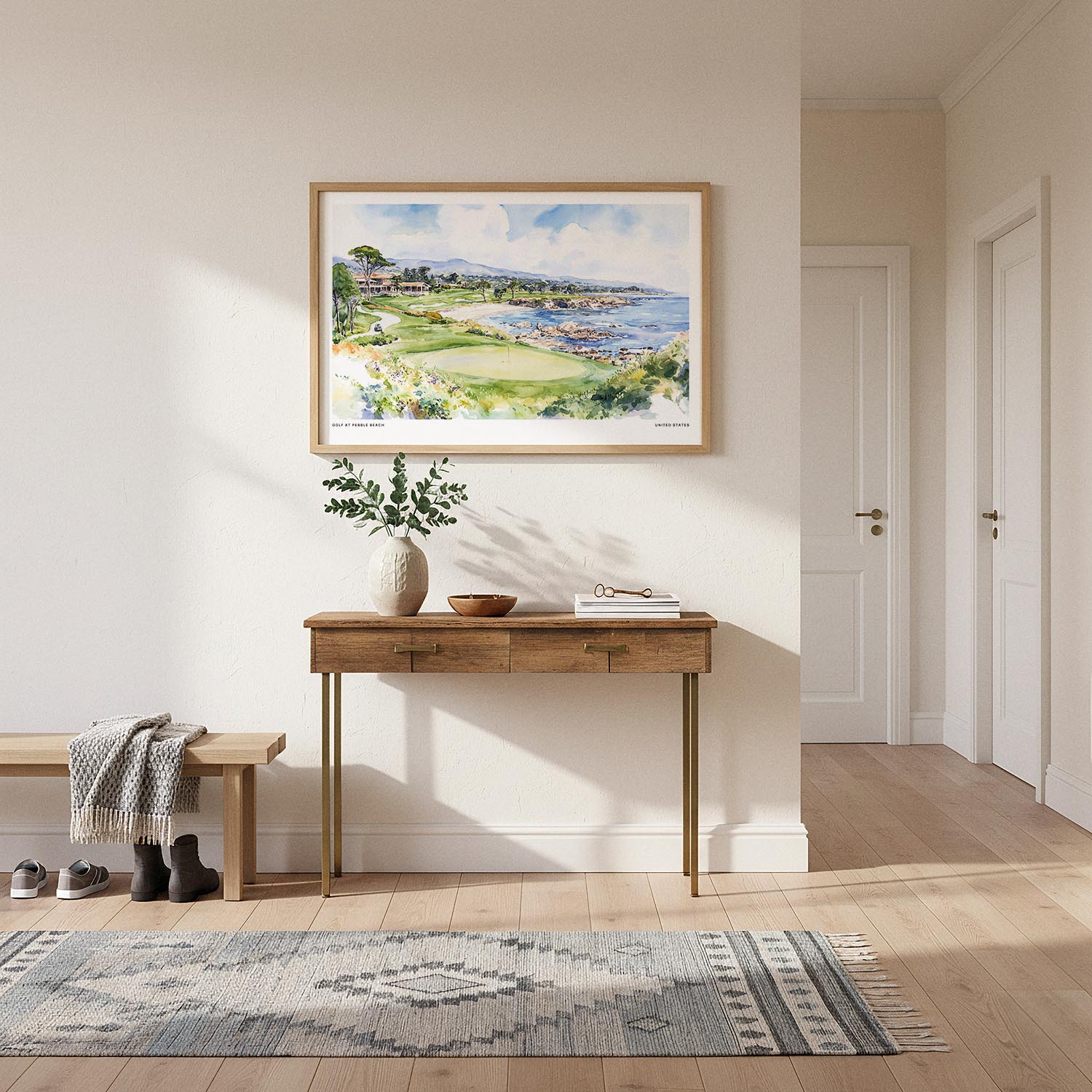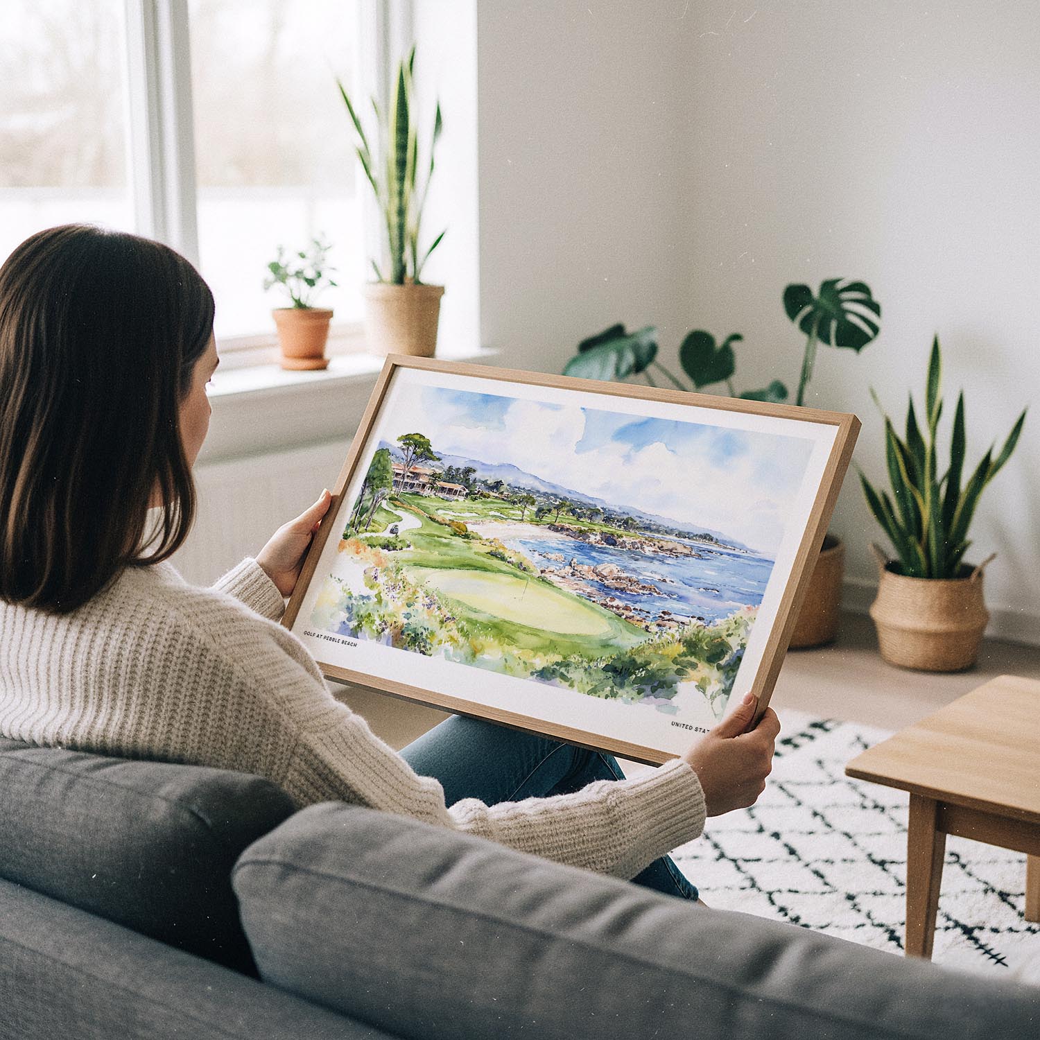 Capture the beauty of Pebble Beach with this watercolor art print. Featuring sweeping coastal views, it’s an ideal piece for golf lovers and anyone who dreams of the ocean.