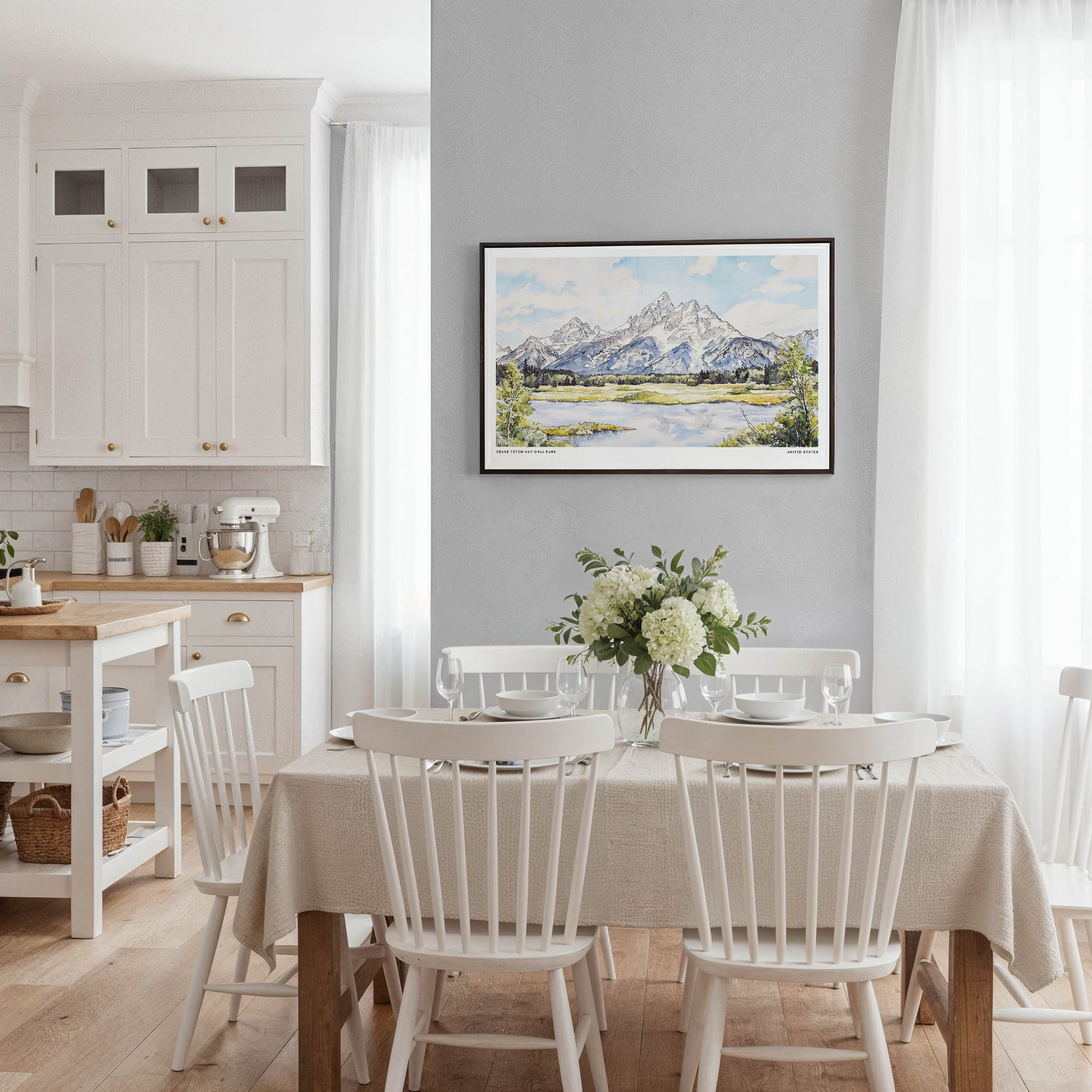 Experience the captivating scenery of Grand Teton National Park with this watercolor canvas print, featuring majestic peaks and tranquil waters. The soft hues create an inviting atmosphere, making it a wonderful addition to your living room or office. Constructed on a hand-stretched canvas with fade-resistant inks, it’s ready to hang and enjoy. This piece is an ideal gift or personal treasure for anyone who appreciates natural beauty.