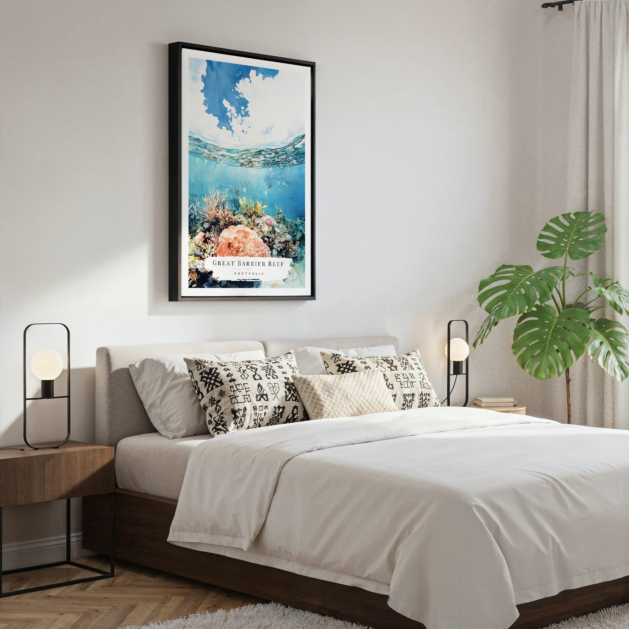 This artwork highlights the stunning hues of the Great Barrier Reef, featuring vibrant corals and shimmering waters that bring life to your walls. The calming blues and lively marine colors create a refreshing atmosphere, ideal for any modern space. Printed on high-quality canvas with fade-resistant inks, it arrives ready to hang and complements living rooms, bedrooms, or offices. It’s a delightful choice for personal enjoyment or as a gift for ocean lovers.