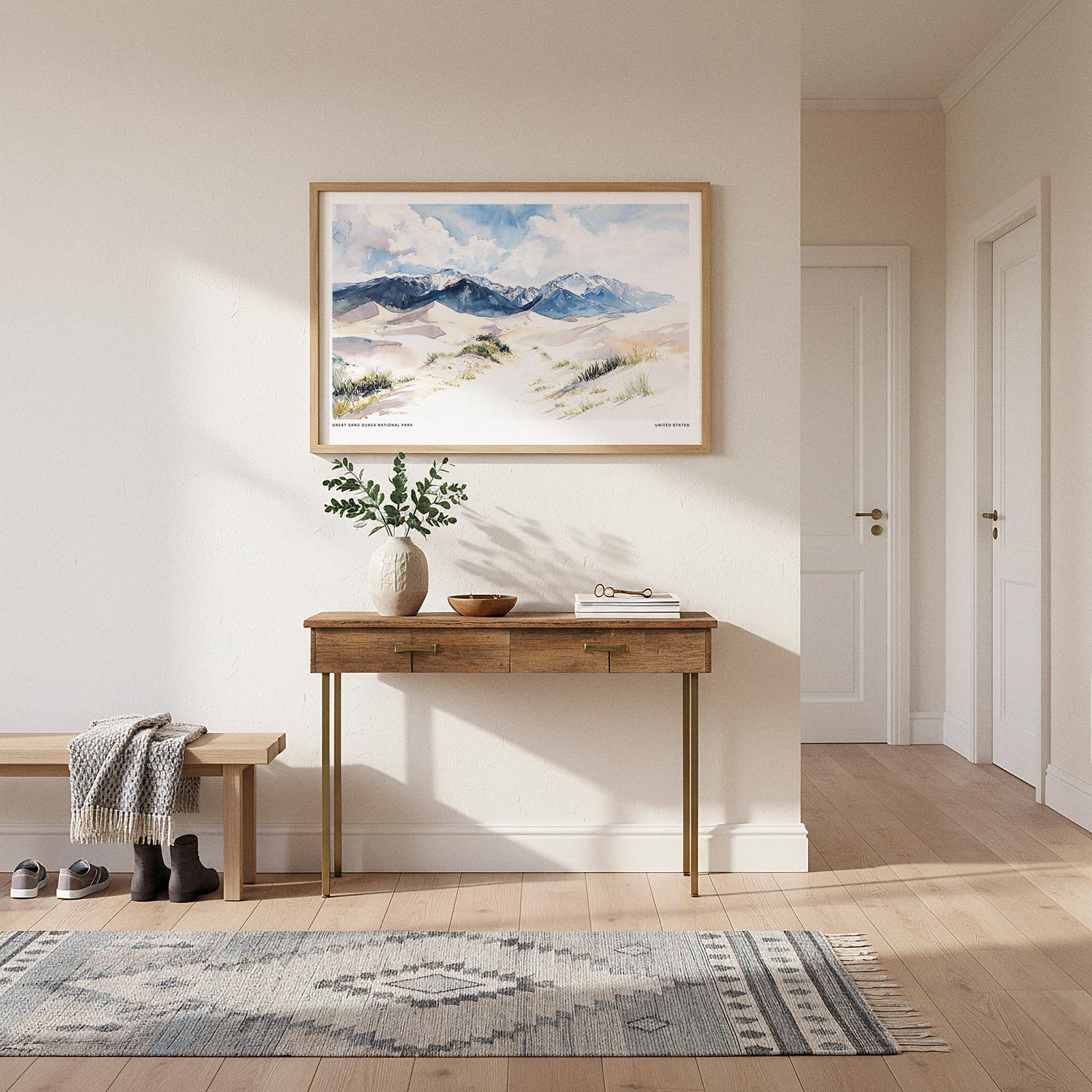 Capture the striking beauty of Great Sand Dunes National Park with this watercolor art print. Ideal for nature lovers and anyone dreaming of expansive landscapes.