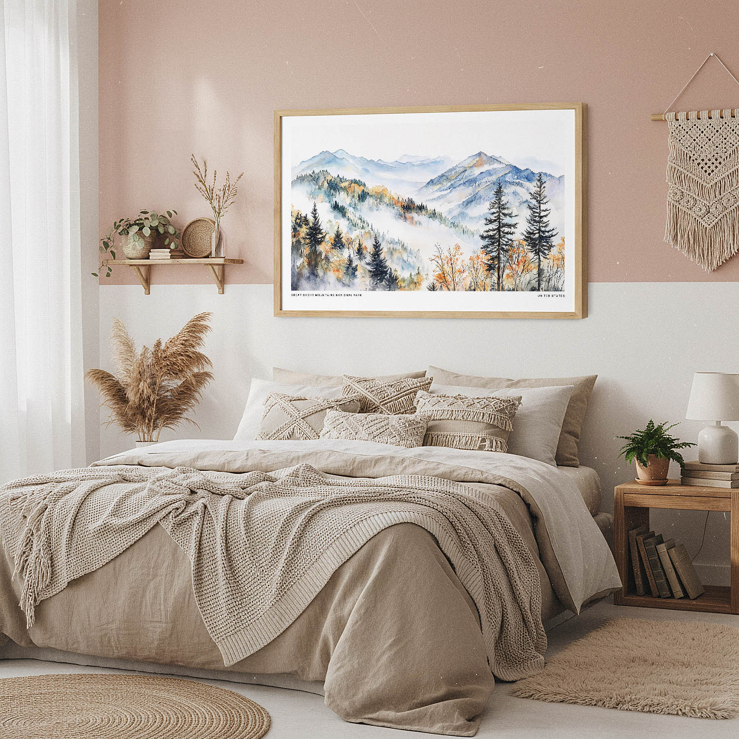 This artwork beautifully depicts the serene landscape of the Great Smoky Mountains, showcasing lush greenery and misty peaks in harmonious colors. The tranquil atmosphere it brings makes it perfect for brightening up a living room or creating a peaceful workspace. Ideal for nature enthusiasts and travelers, this print invites you to escape into the beauty of the mountains. It’s a thoughtful piece to display in your home or gift to a friend.