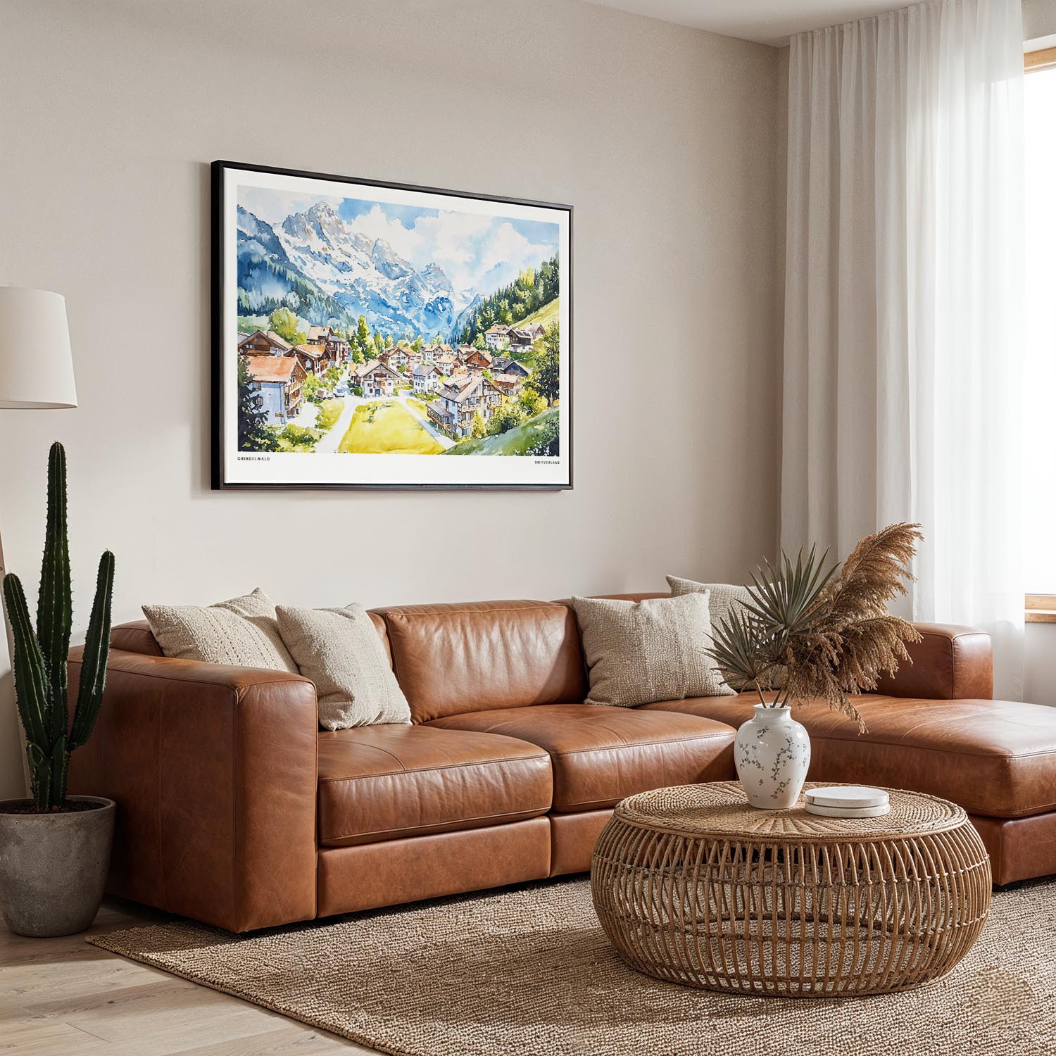 Bring the charm of Grindelwald into your space with this canvas print. Its vibrant depiction of the village against the backdrop of stunning mountains makes it a perfect fit for living rooms, offices, or hallways.