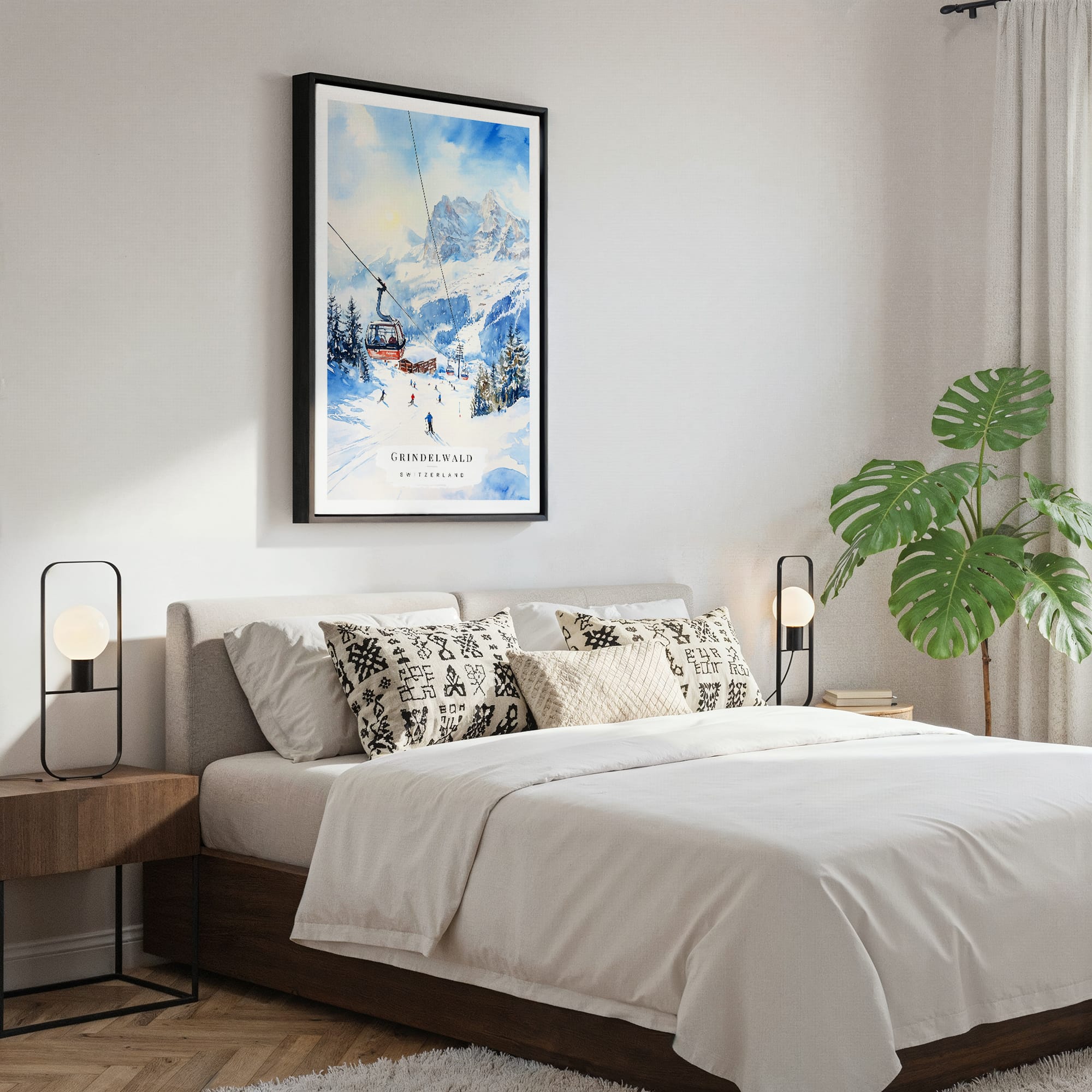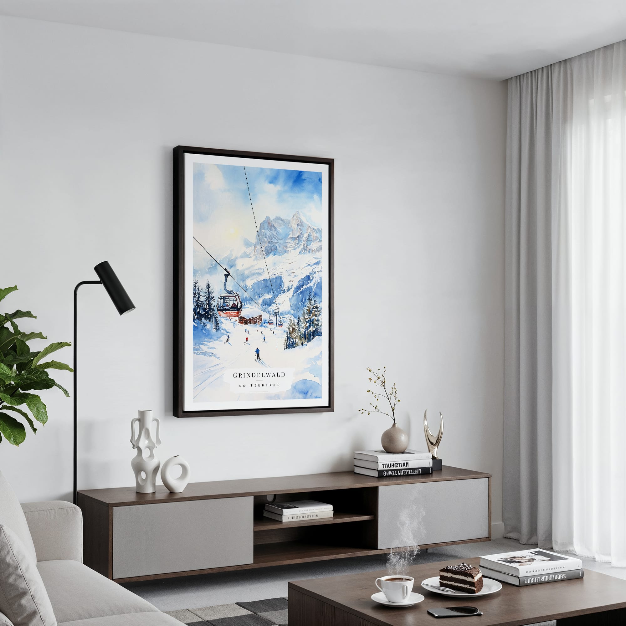 Grindelwald Watercolor Canvas Art Print – Snowy Ski Resort Landscape Wall Art