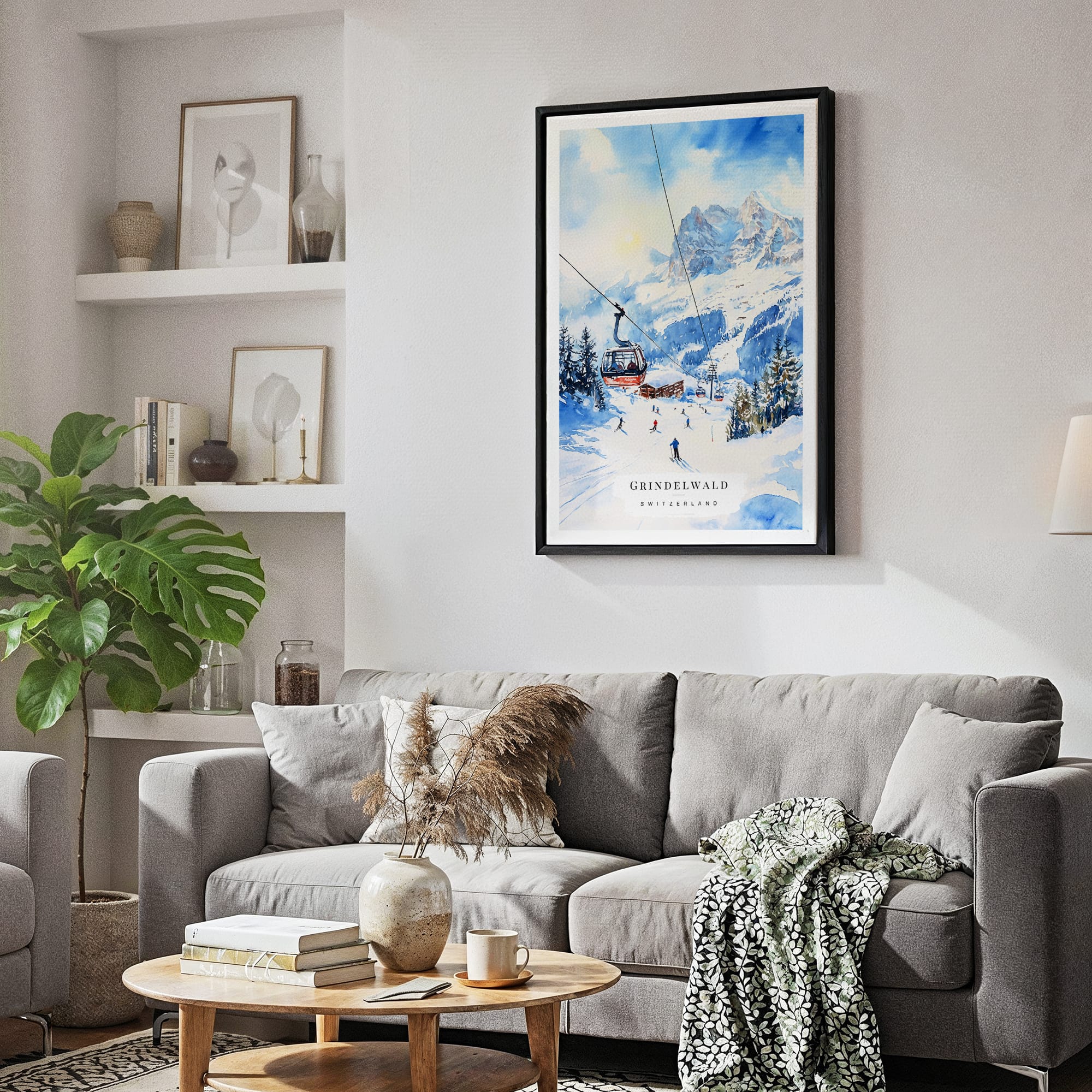 This charming artwork captures the essence of Grindelwald, showcasing skiers and majestic mountains in soft pastel hues. The calming colors create a serene environment, making it a perfect fit for living rooms, offices, or personal getaways. Crafted on a gallery-wrapped canvas with fade-resistant inks, it arrives ready to hang and is suitable for any ski enthusiast or nature lover. A thoughtful way to refresh your decor or gift to someone special.