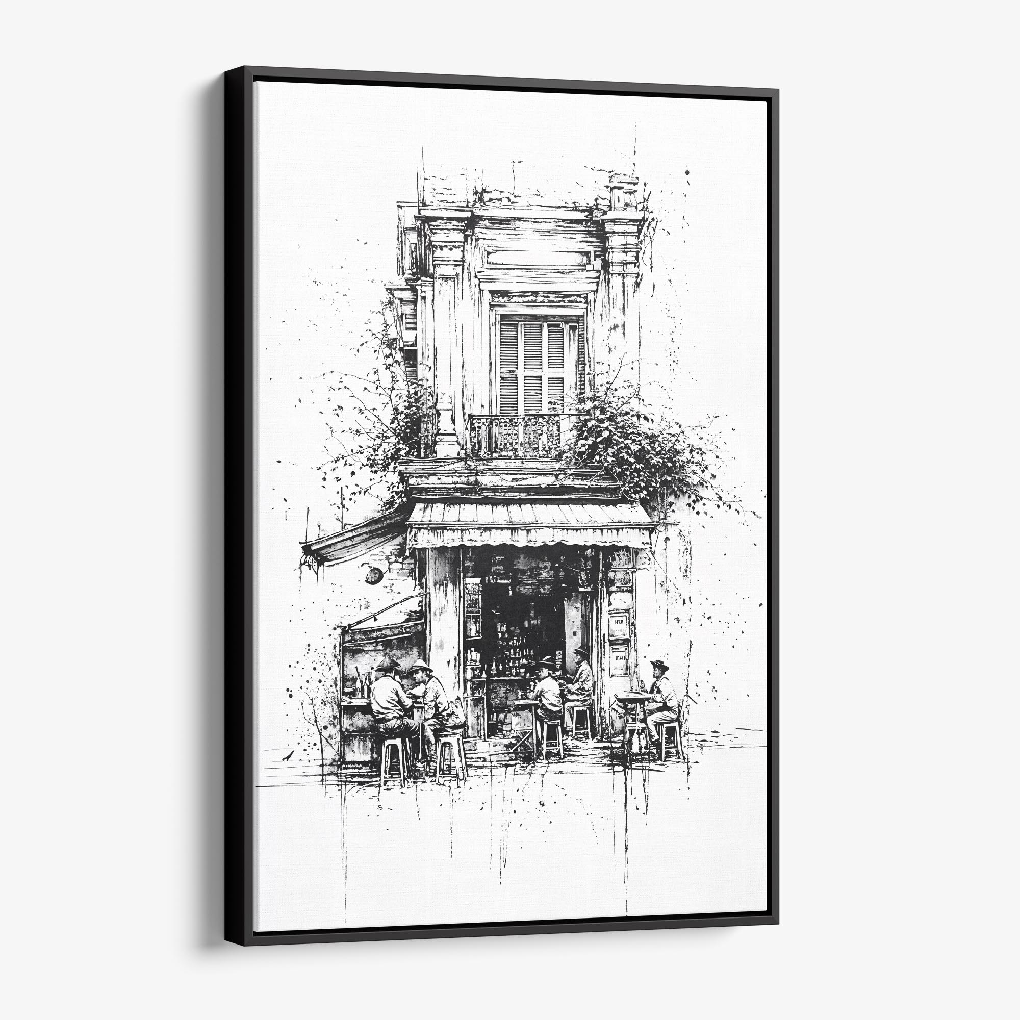 Hanoi Old Quarter Canvas Print – Pencil Art of Vintage Café Scene