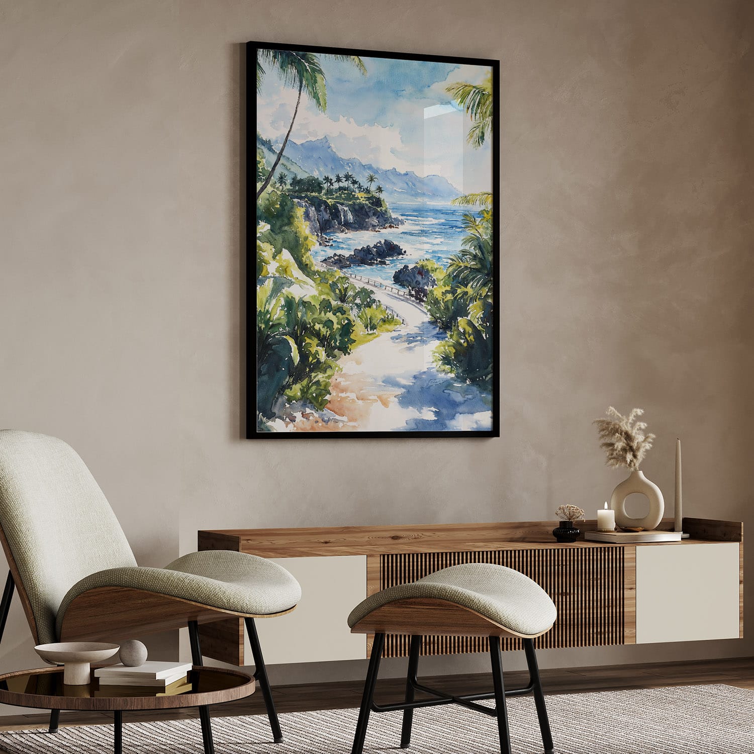 This striking artwork showcases the stunning coastal views of the Road to Hana in Hawaii with vibrant blues and lush greens. The piece brings a fresh and relaxed vibe to any room, making it perfect for spaces like living areas, bedrooms, or offices. Delivered as a high-resolution digital file, it can be printed in a variety of sizes at home or through your favorite print shop. Enjoy instant access to a beautiful slice of paradise that adds a touch of nature to your decor.
