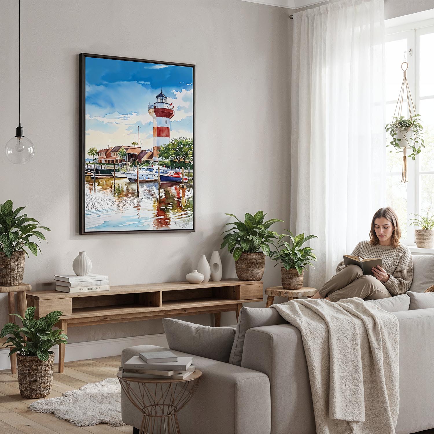This print captures the charm of Hilton Head Island with its vibrant lighthouse and serene harbor reflections. The colorful scene evokes a sense of coastal tranquility, inviting you to feel the gentle sea breeze.