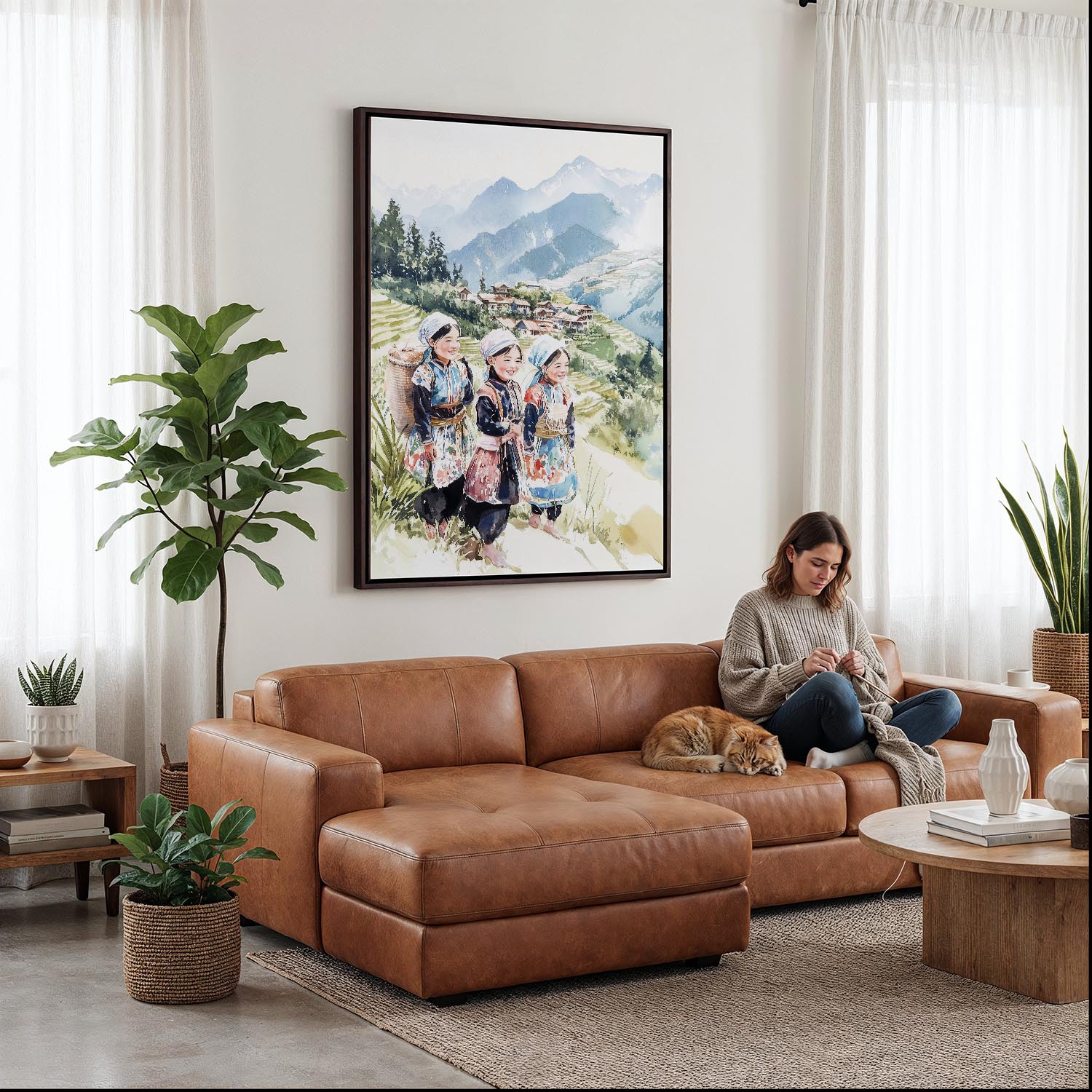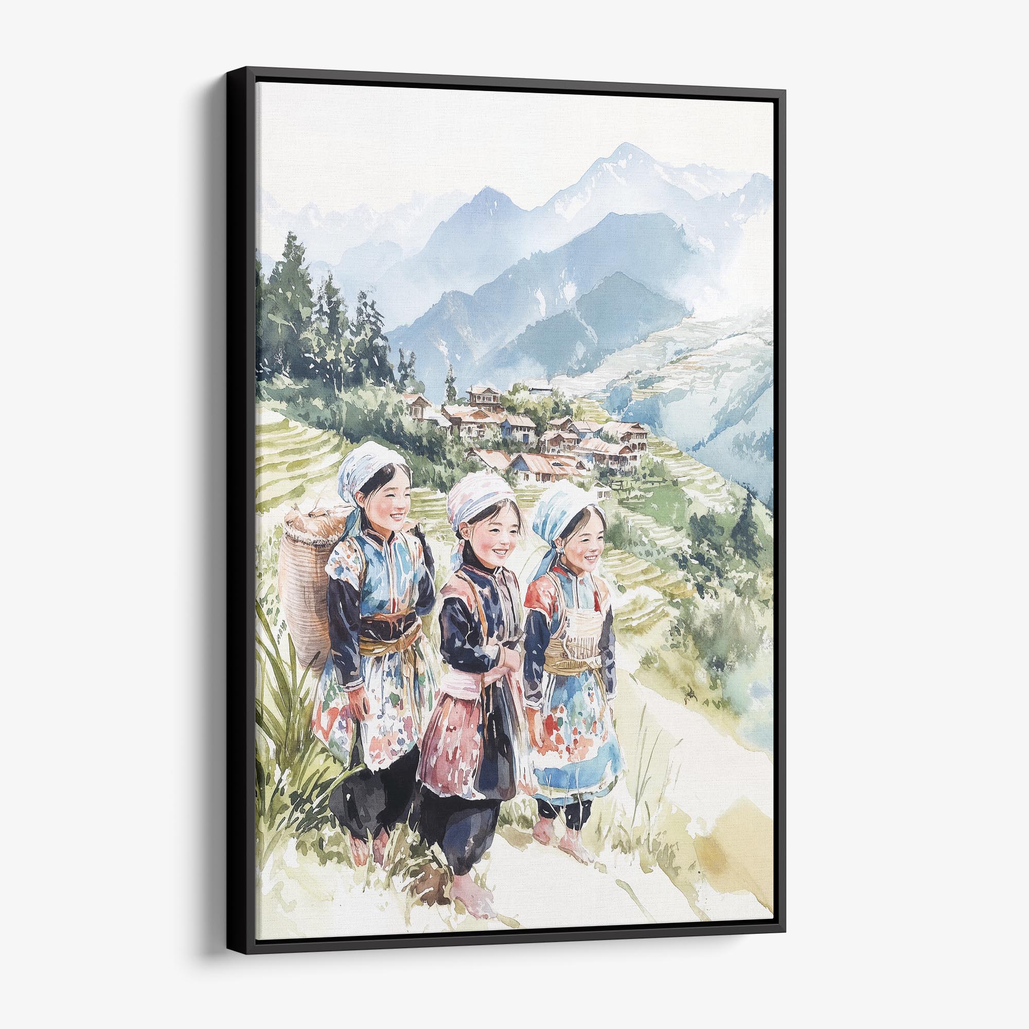 Step into the vibrant culture of Sapa, Vietnam, with this watercolor canvas print capturing beloved Hmong children in a scenic landscape. The artwork showcases rolling hills and traditional homes, creating a warm and inviting atmosphere.
