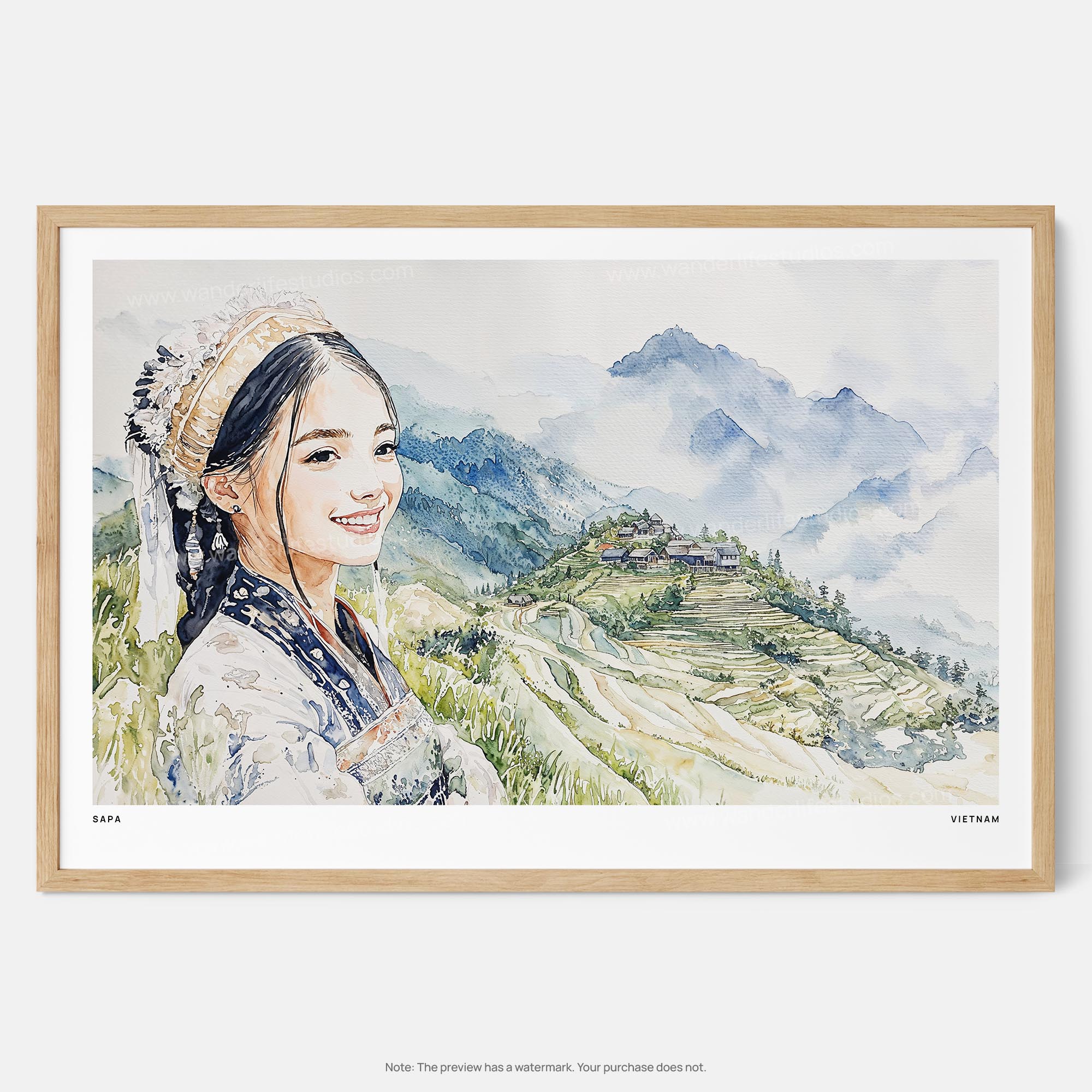 Hmong Woman in Sapa, Vietnam Watercolor Art Print – Captivating Cultural Landscape