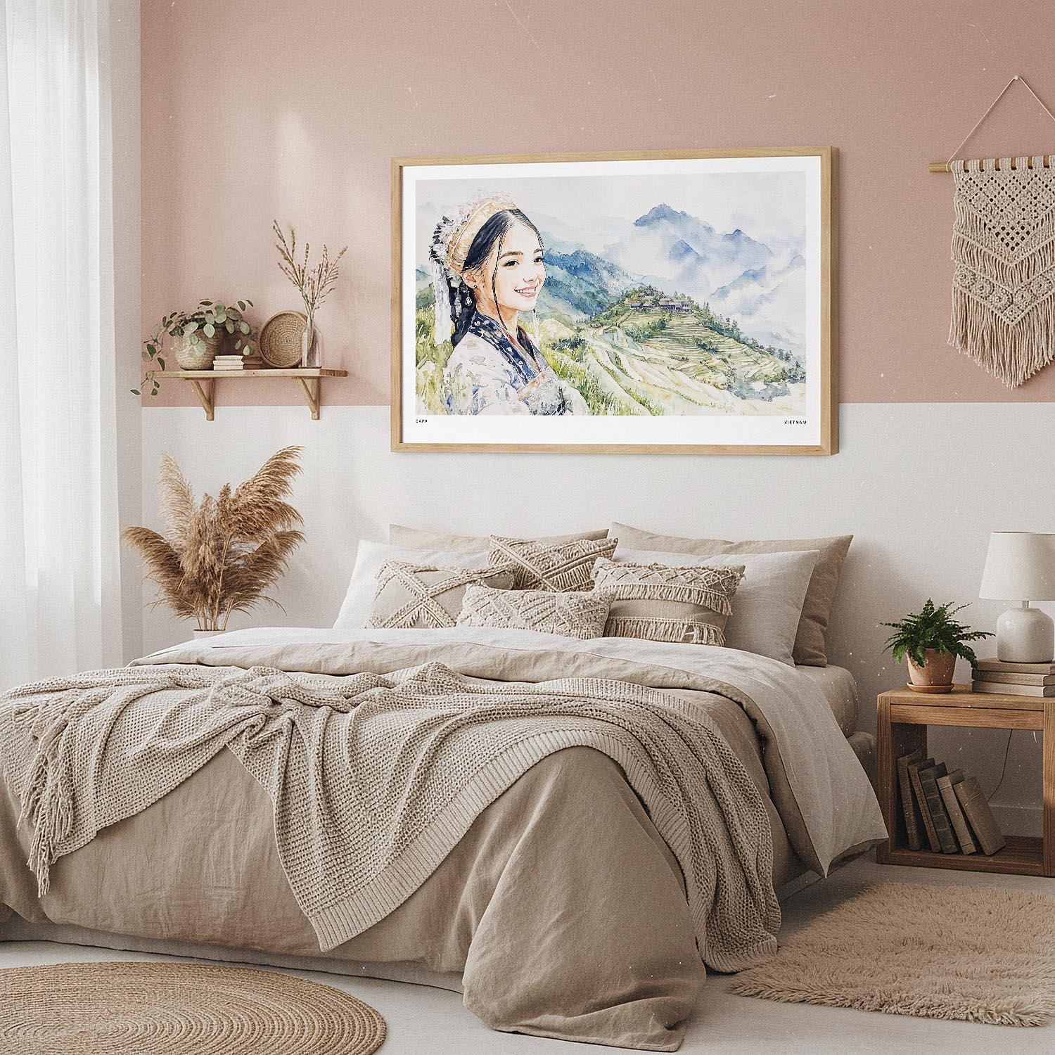 Embrace the charm of Vietnam with this watercolor art print featuring a Hmong woman against the stunning backdrop of Sapa’s terraces. It’s a wonderful addition to any room, bringing warmth to your living space or an office.