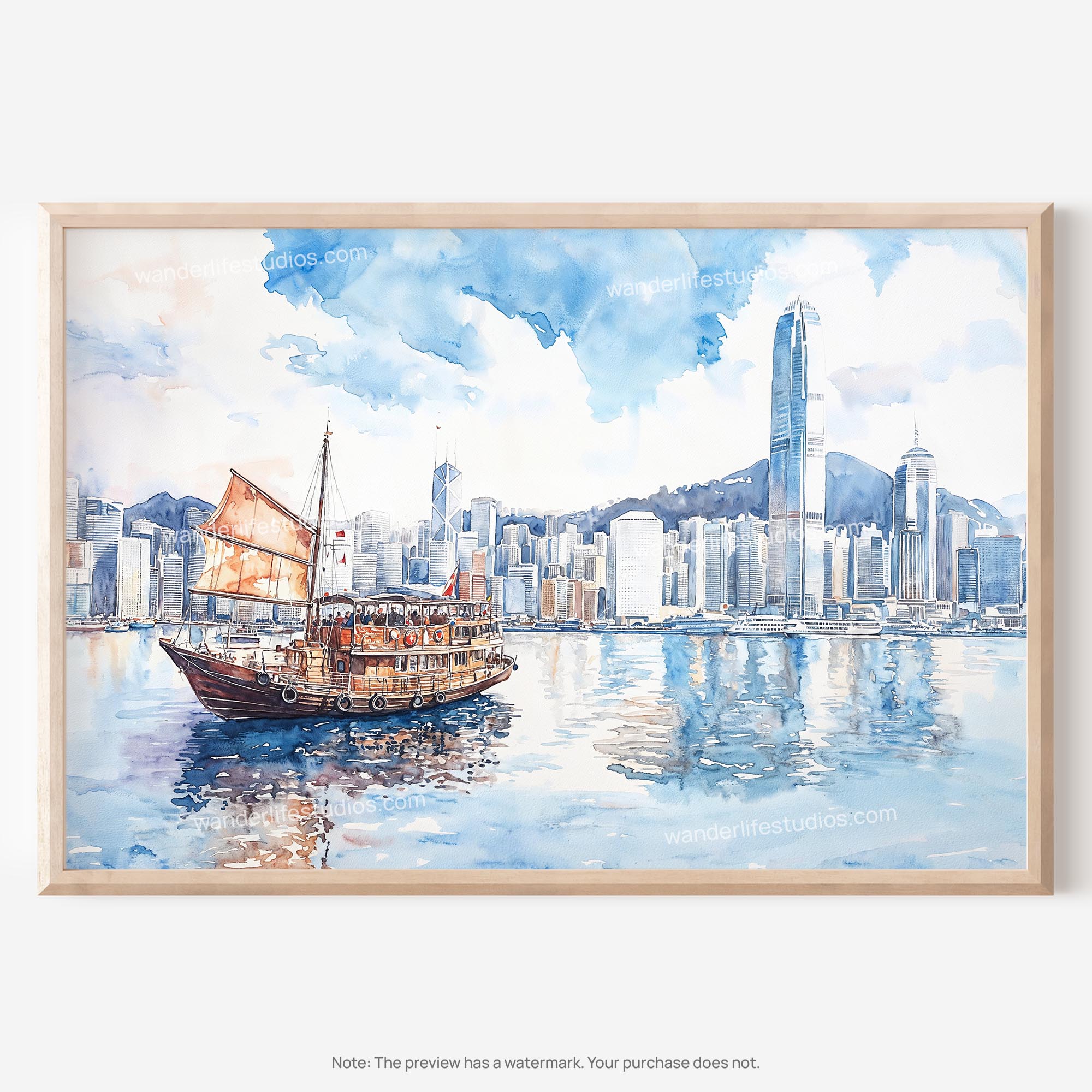 Capture the essence of Hong Kong with this watercolor digital download wall art. Featuring a tranquil junk boat against a vibrant skyline, it’s perfect for instant printing and adding a touch of urban charm to your space.