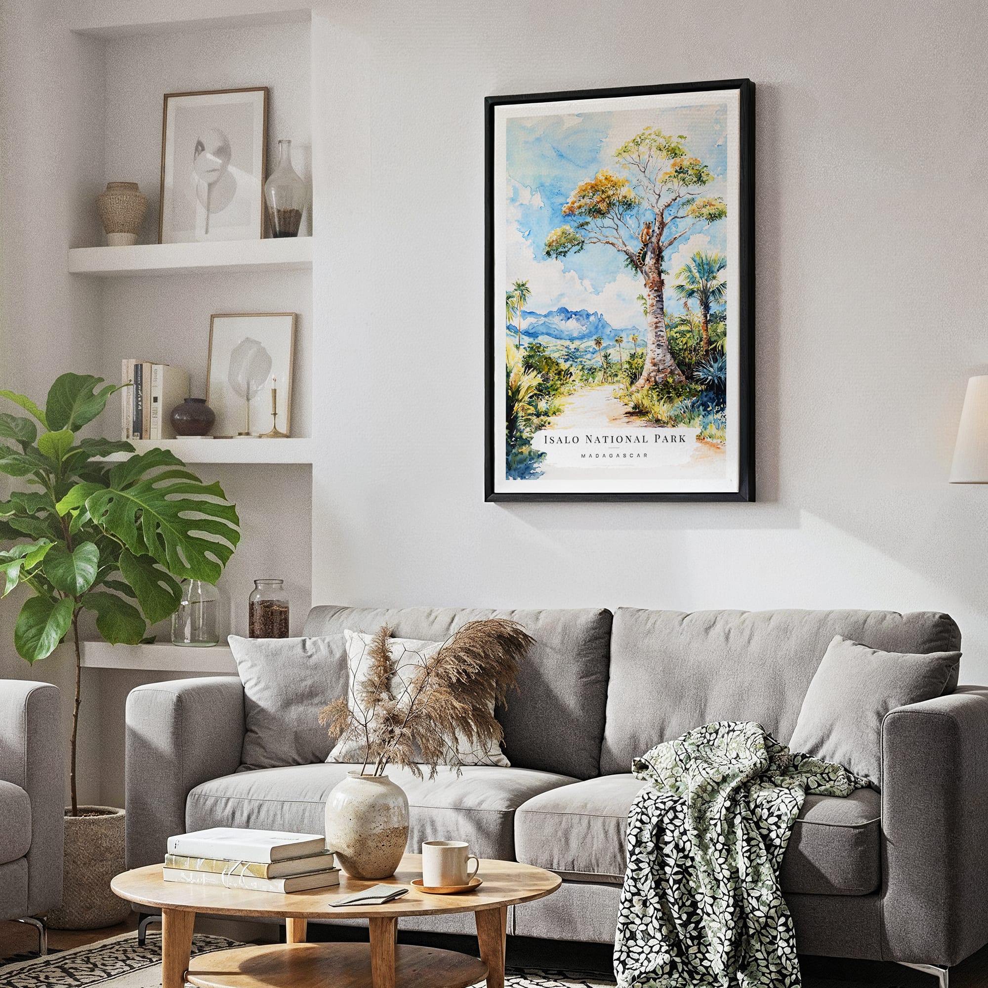 This artwork beautifully captures the rich landscapes of Isalo National Park, showcasing soft greens and vivid blues that breathe life into your wall. Its natural color palette creates a relaxed atmosphere, making it suitable for living rooms, bedrooms, or offices. Crafted from quality canvas and utilizing fade-resistant inks, it arrives ready to hang with a matte finish that maintains color accuracy. Perfect for those who love nature or as a gift for someone special.