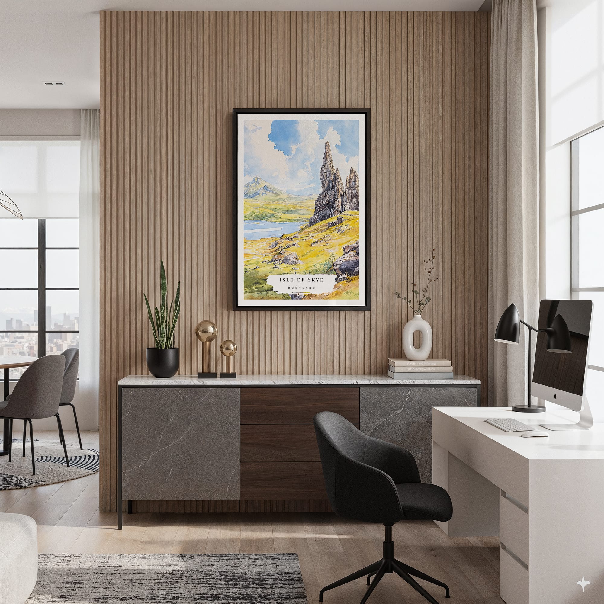 This artwork showcases the stunning Isle of Skye, highlighting its majestic landscapes and vibrant colors. The blend of greens and blues creates a tranquil atmosphere that enhances your living or working space. Printed on high-quality canvas with fade-resistant inks and a matte finish, it arrives ready to hang. Perfect for adding a touch of Scotland to your bedroom, living room, or even an office. This piece not only elevates your decor but also makes for a cherished gift for those who appreciate nature.