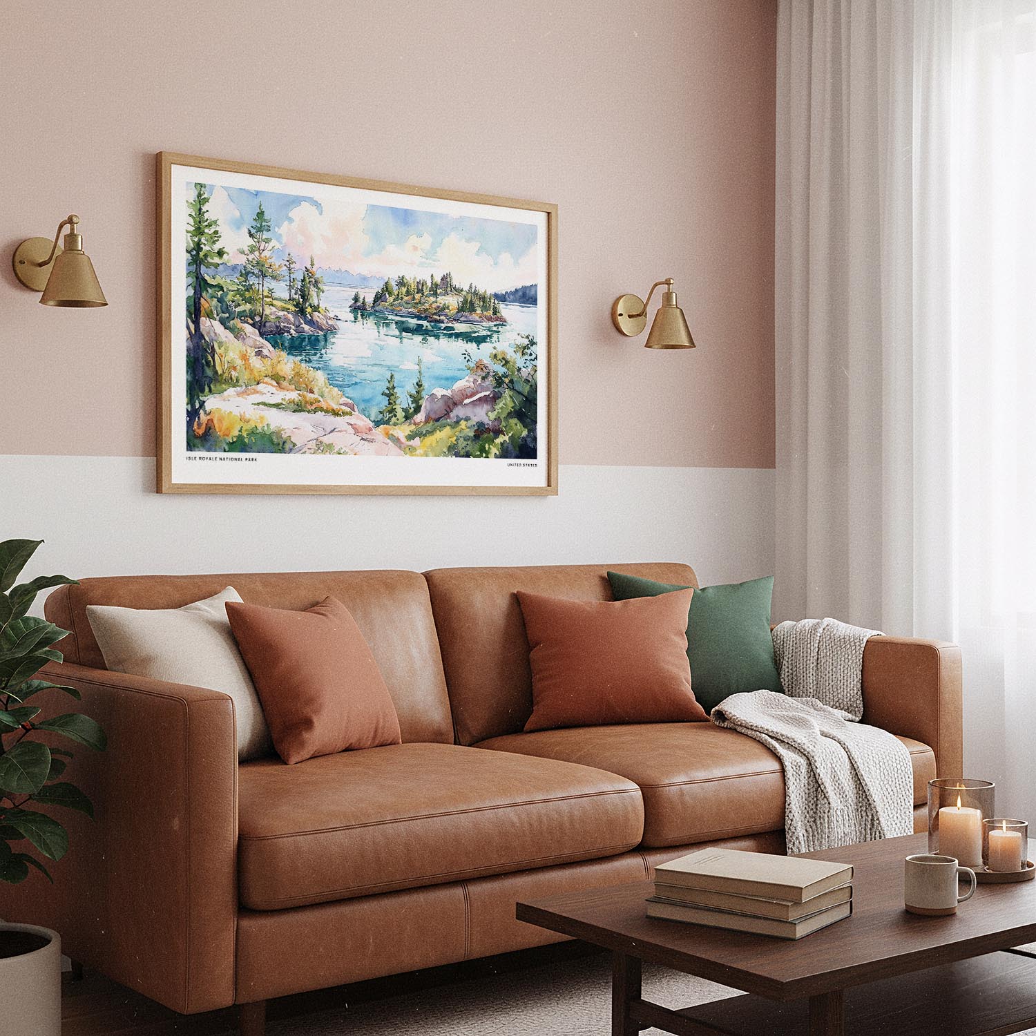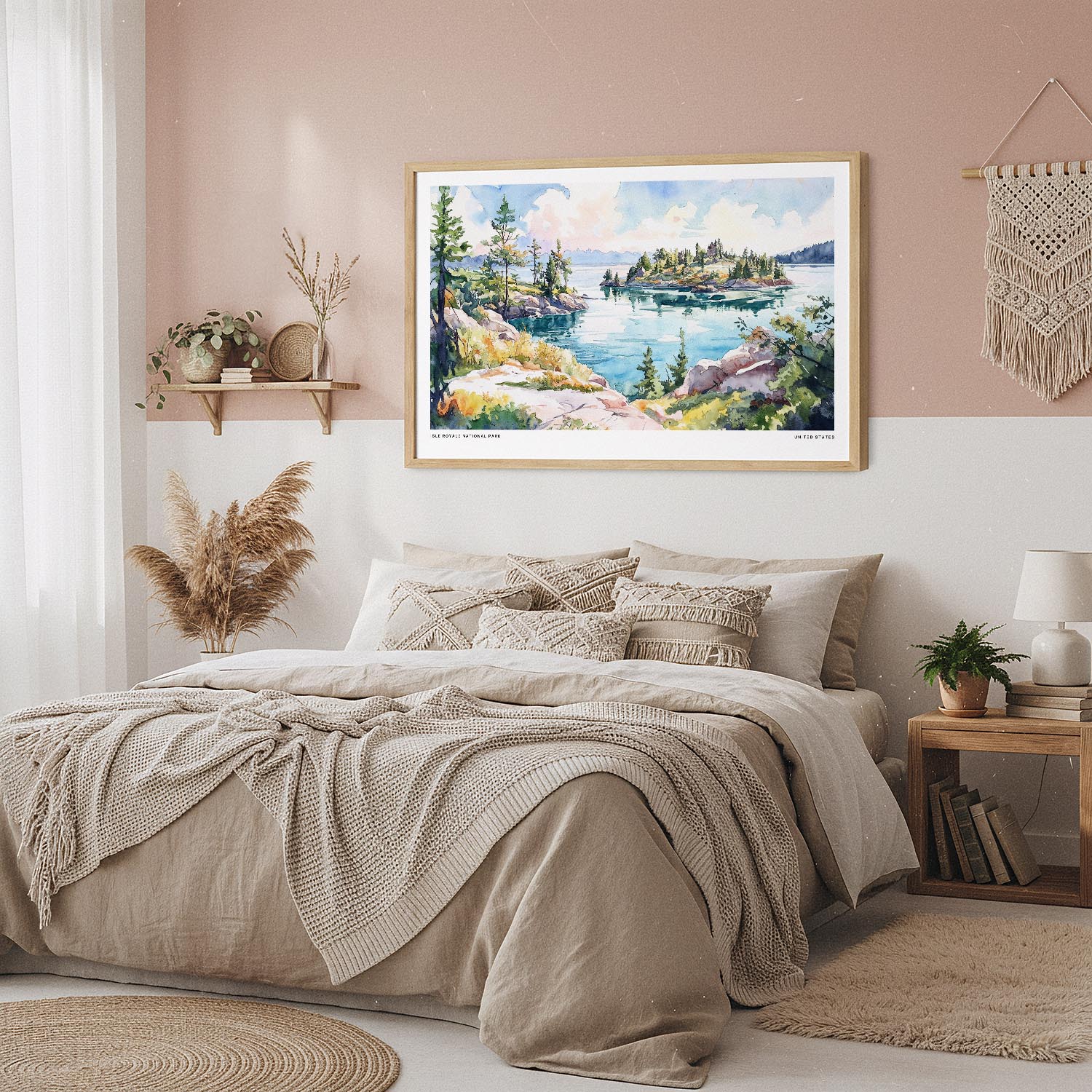 Experience the beauty of Isle Royale National Park with this stunning watercolor print. Its vibrant blues and greens capture the tranquil lakes and lush forests, perfect for nature lovers and those dreaming of serene escapes.