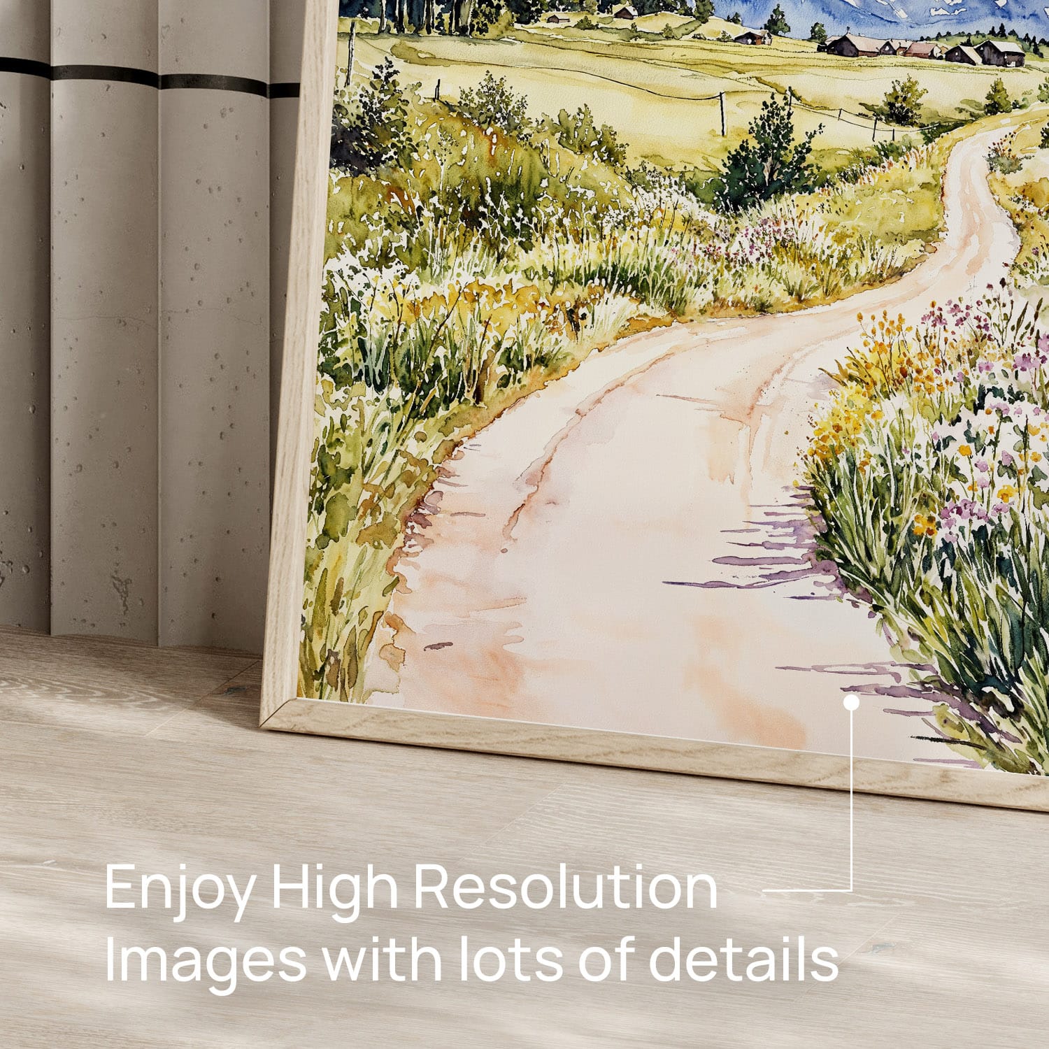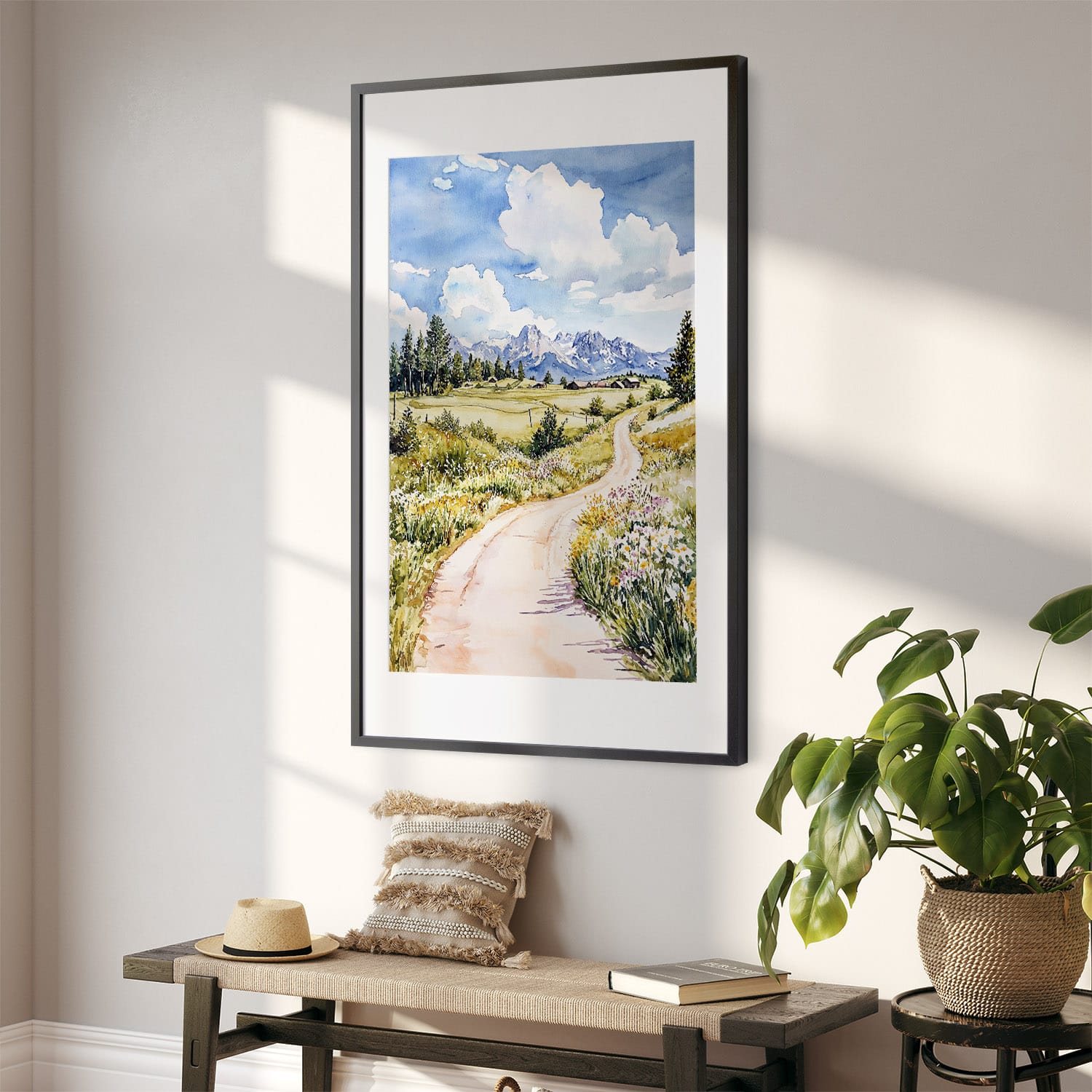 Enhance your space with this Jackson Hole watercolor landscape digital download. Featuring vibrant greens and blues, this artwork is easy to print and display in any setting, allowing for immediate enjoyment.