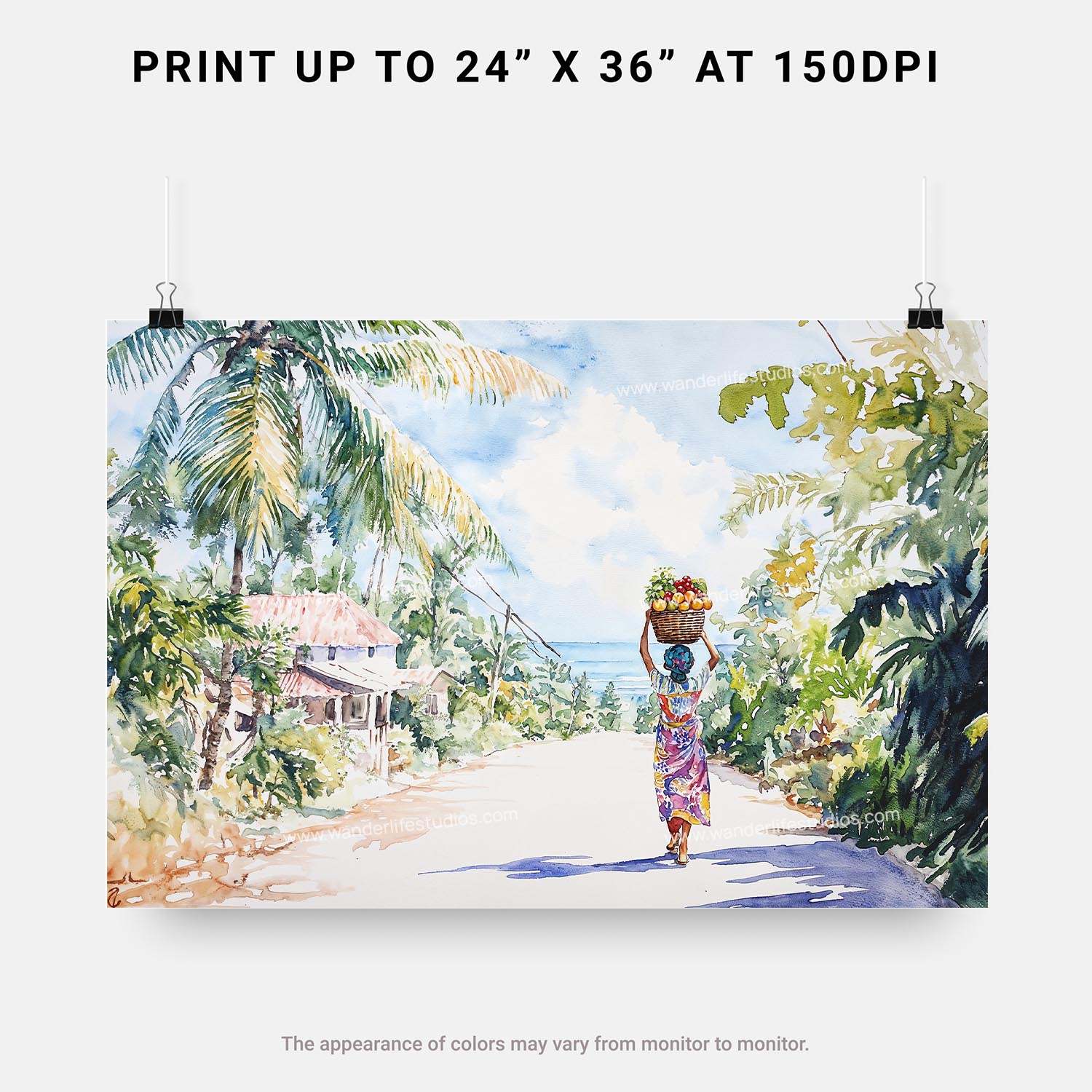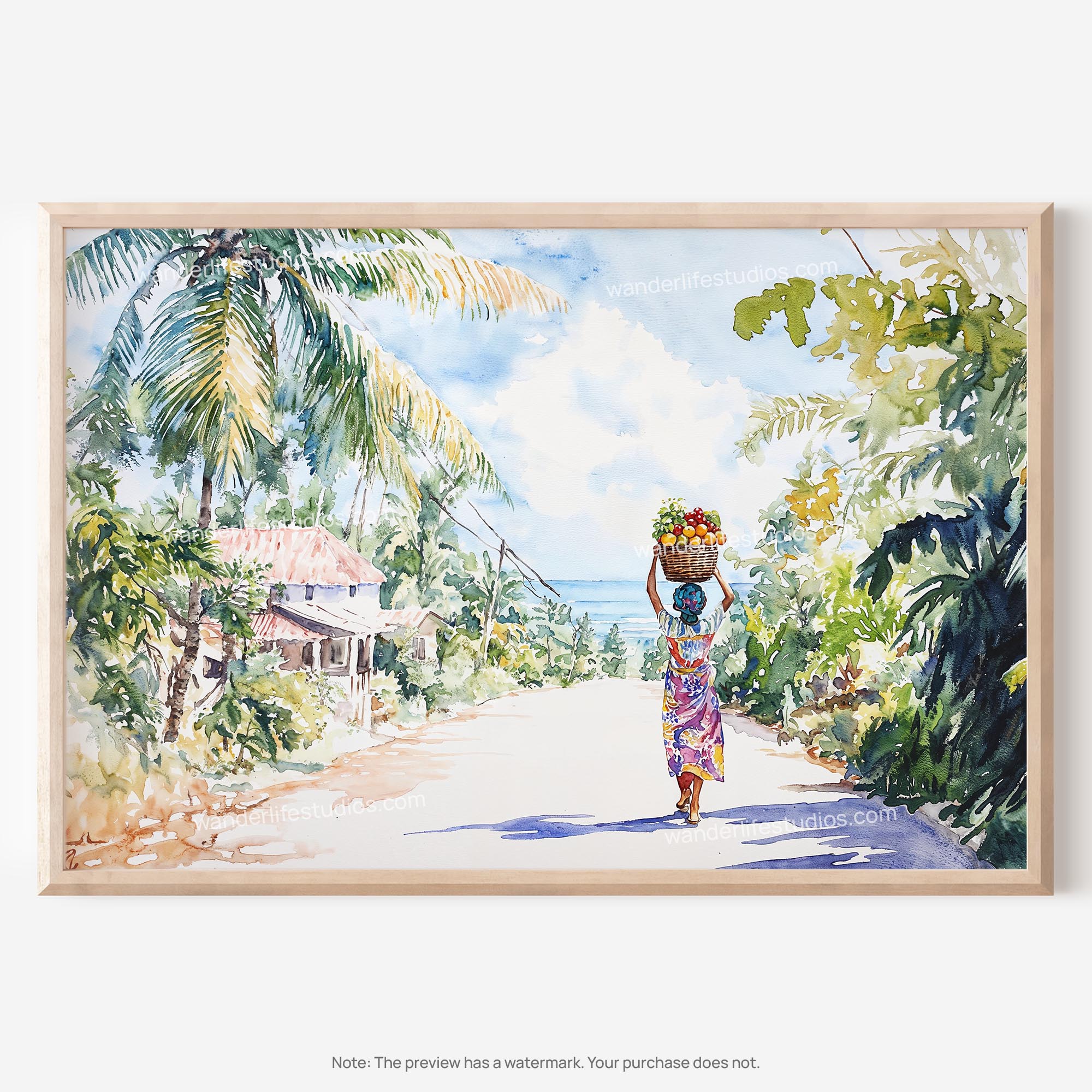 Experience the serene beauty of Jamaica with this vibrant watercolor art print. A woman carrying a basket of fresh fruit walks along a sun-drenched road, framed by palm trees and the blue ocean in the distance. The artwork captures the lively colors and warm atmosphere that define this tropical paradise.