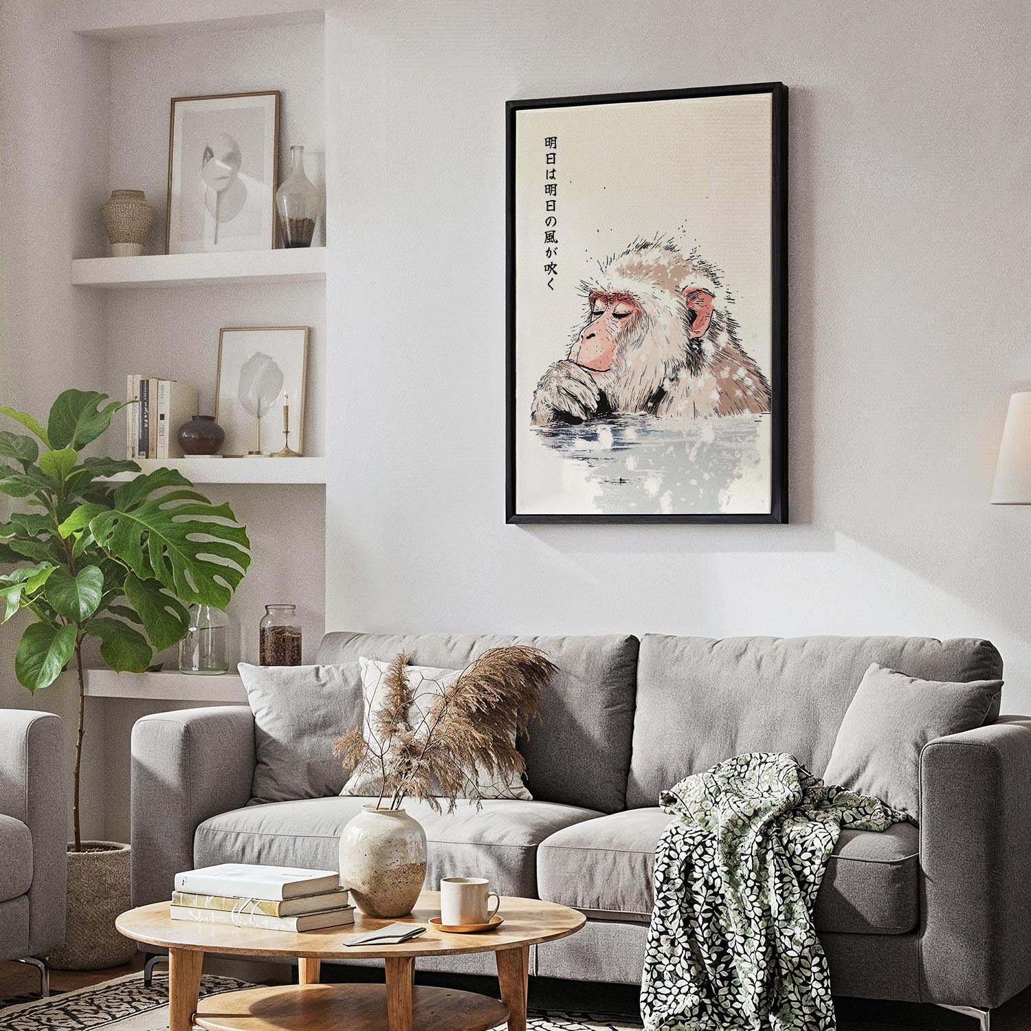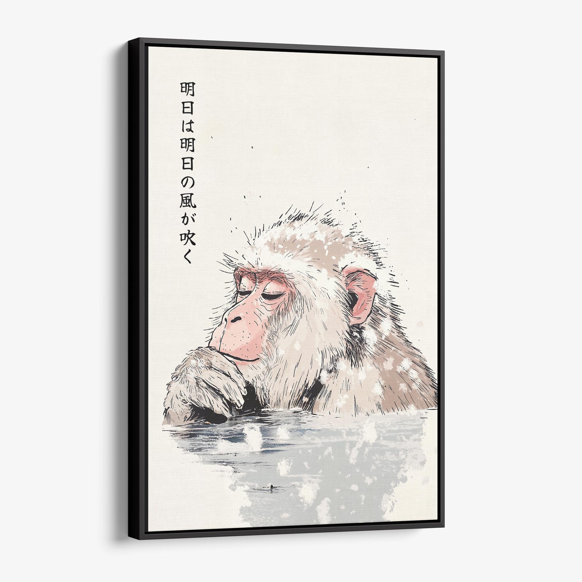 This canvas print features a tranquil Japanese macaque relaxing in an onsen. Its vintage illustration style adds an inviting touch, perfect for enhancing the atmosphere in living rooms, bedrooms, or offices. The print also features a japanese phrase: 明日は明日の風が吹く- (Ashita wa ashita no kaze ga fuku) which means: ‘Tomorrow’s wind will blow tomorrow.’ It means to take one day at a time and not worry too much about the future.