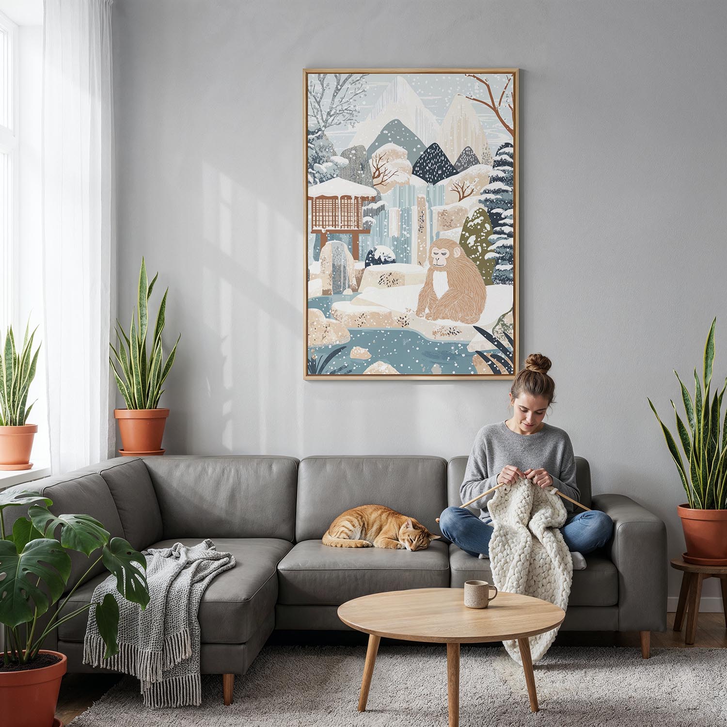 Capture the serene beauty of winter with this captivating canvas print. It depicts a peaceful scene featuring a Japanese macaque amidst soft snow-covered rocks and gentle waterfalls. The cool blue, soft browns, and snowy whites create a calming atmosphere that invites relaxation.