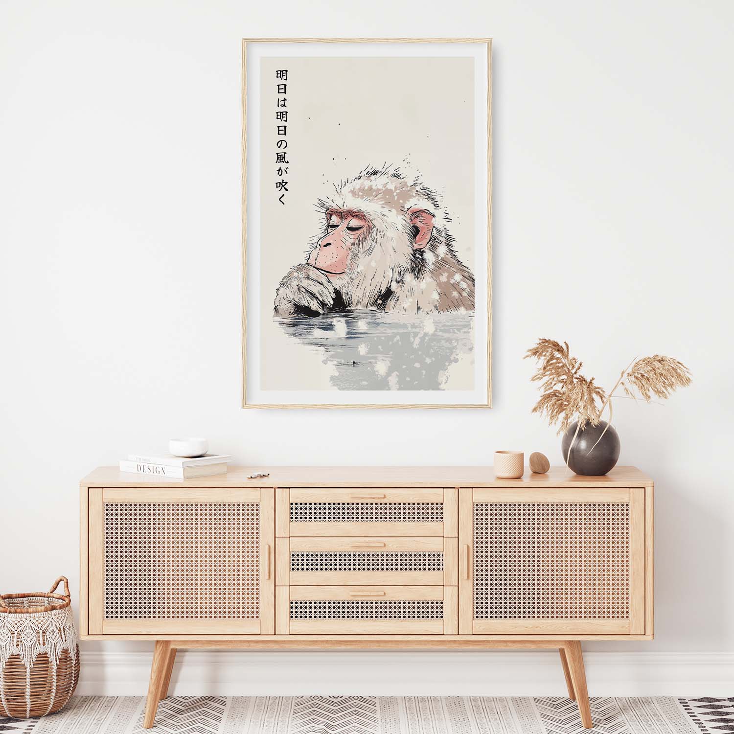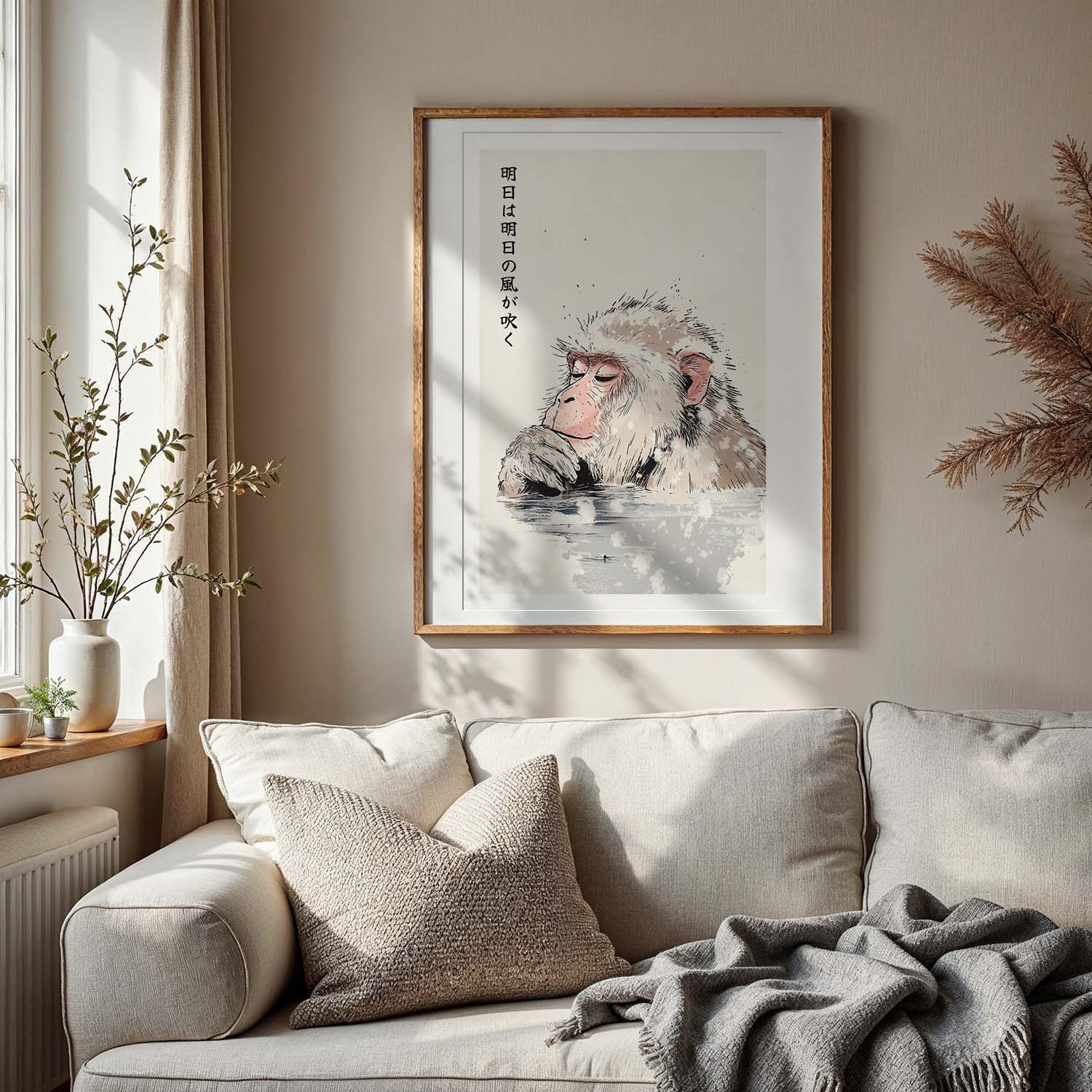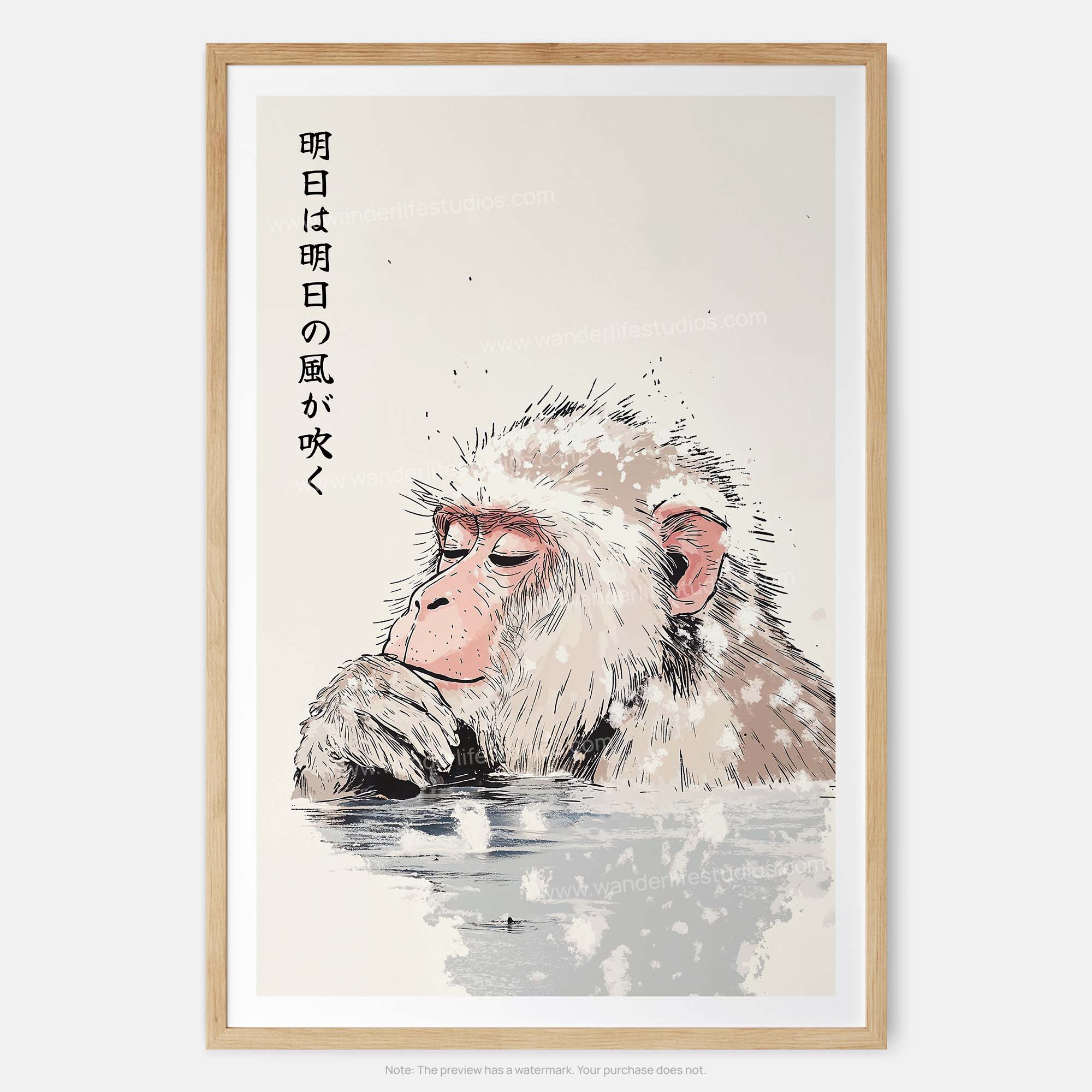 Capture the essence of tranquility with this art print featuring a Japanese macaque relaxing in an onsen. Perfect for adding a soothing touch to your living room or office. The print also features a japanese phrase: 明日は明日の風が吹く- (Ashita wa ashita no kaze ga fuku) which means: ‘Tomorrow’s wind will blow tomorrow.’ It means to take one day at a time and not worry too much about the future.