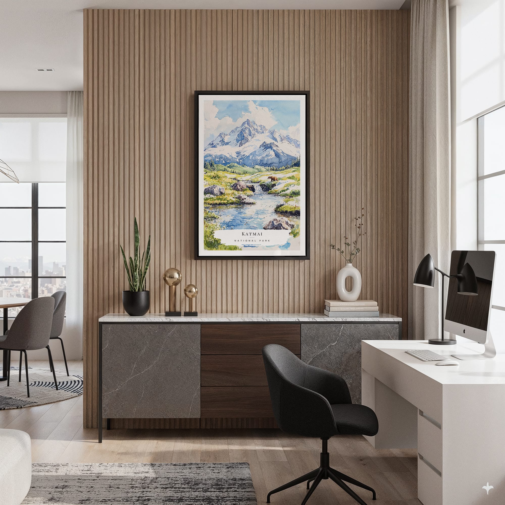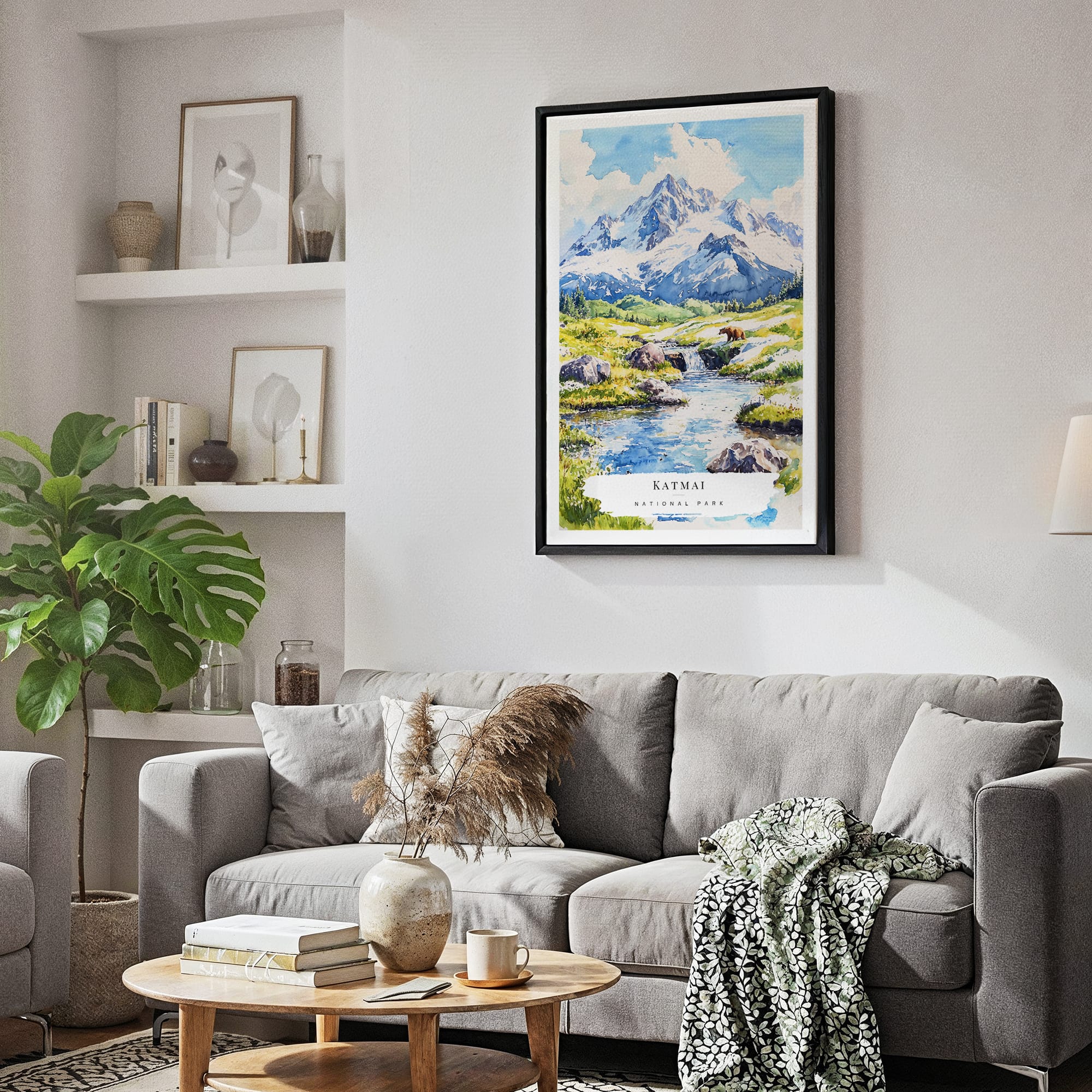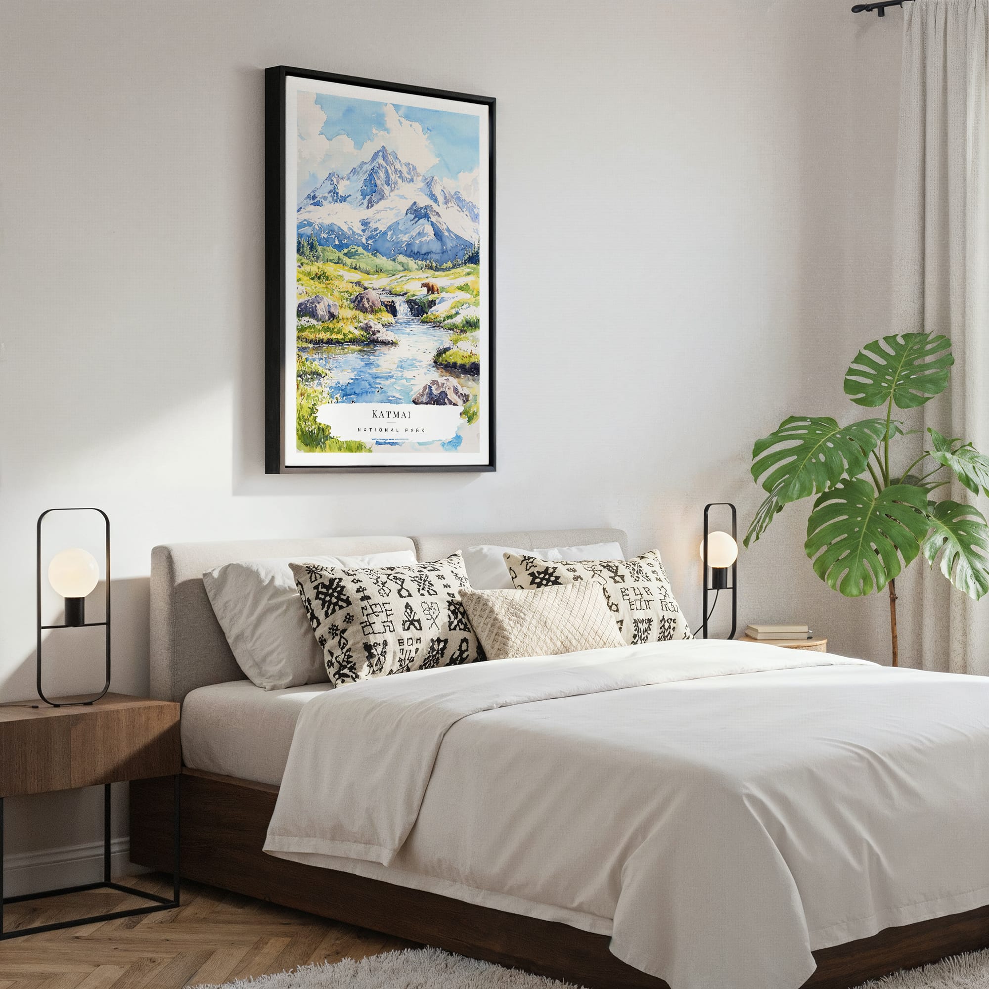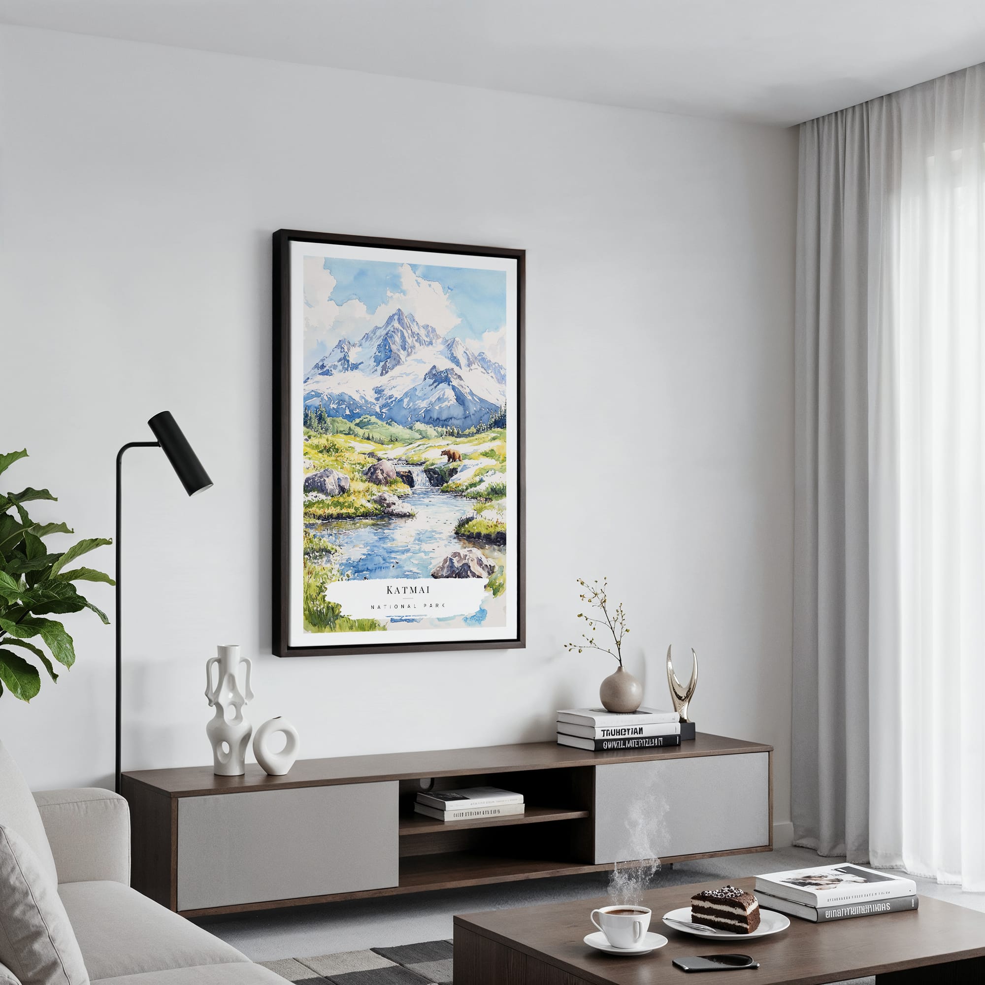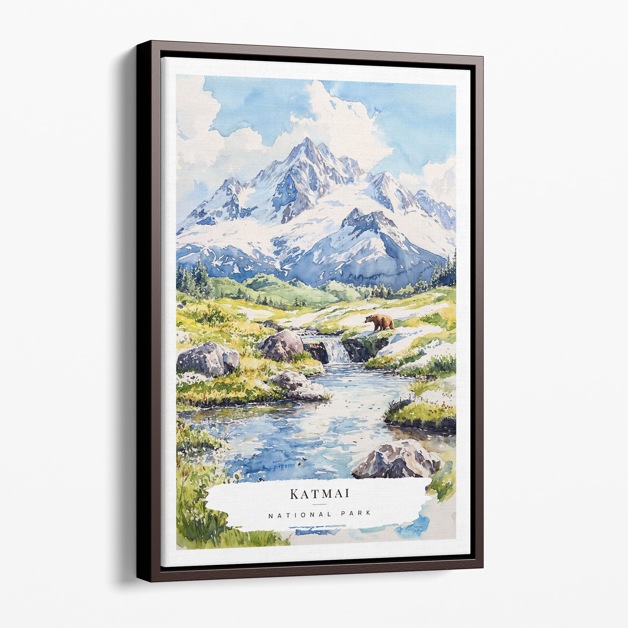 This artwork captures the essence of Katmai National Park, highlighting majestic mountains and a bear by a serene stream. The calming colors create a refreshing atmosphere in any room. Printed on durable canvas with fade-resistant inks and a matte finish, it is ready to hang right out of the box. Perfect for living rooms, bedrooms, or offices, this piece invites the beauty of the outdoors into your home and makes a lovely gift for outdoor enthusiasts.