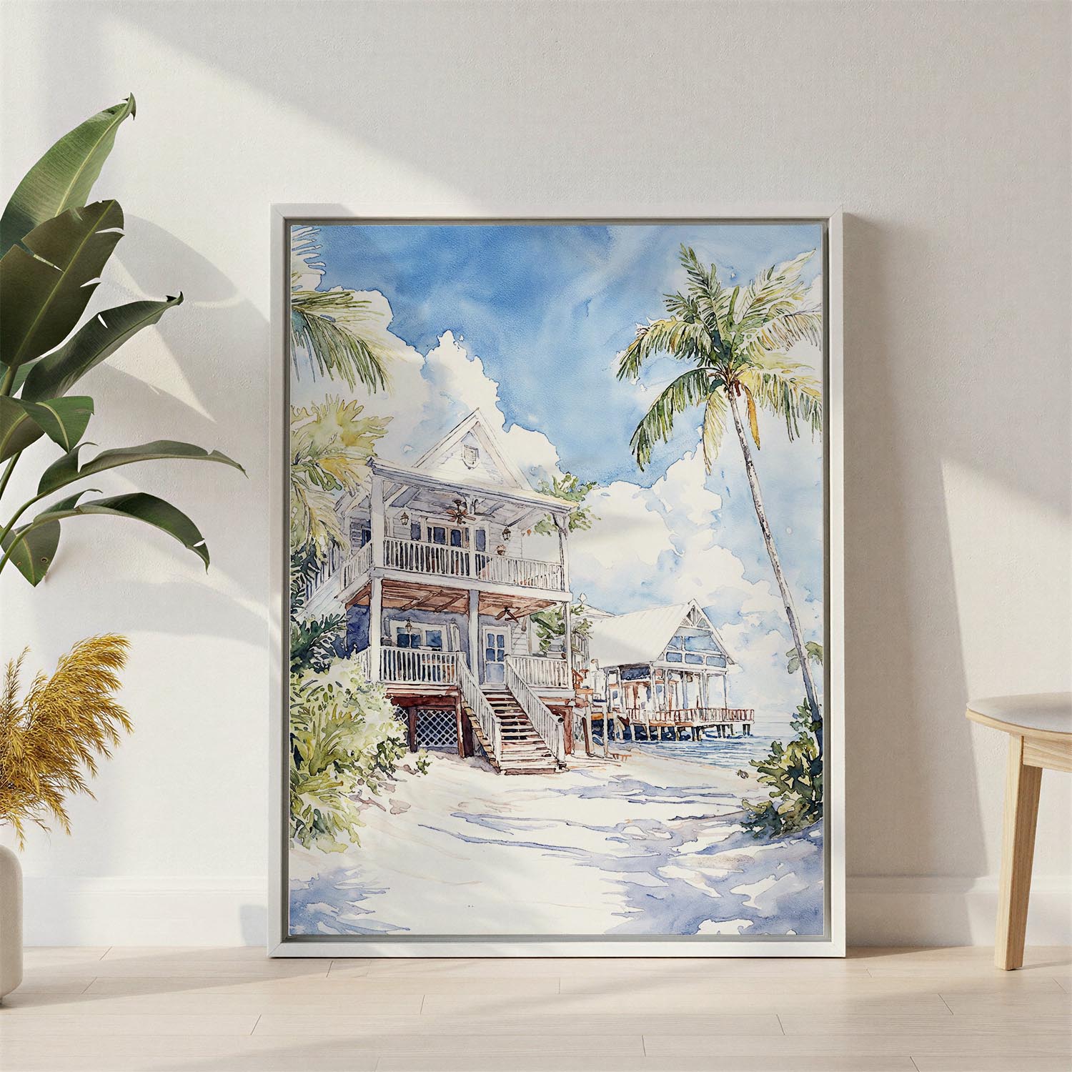 Step into the sunny ambiance of Key West with this watercolor canvas print. It captures the essence of coastal living, showcasing charming beach houses surrounded by swaying palms and bright skies. Each print is available in various finishes, including unframed or with a floater frame, allowing you to customize your decor.