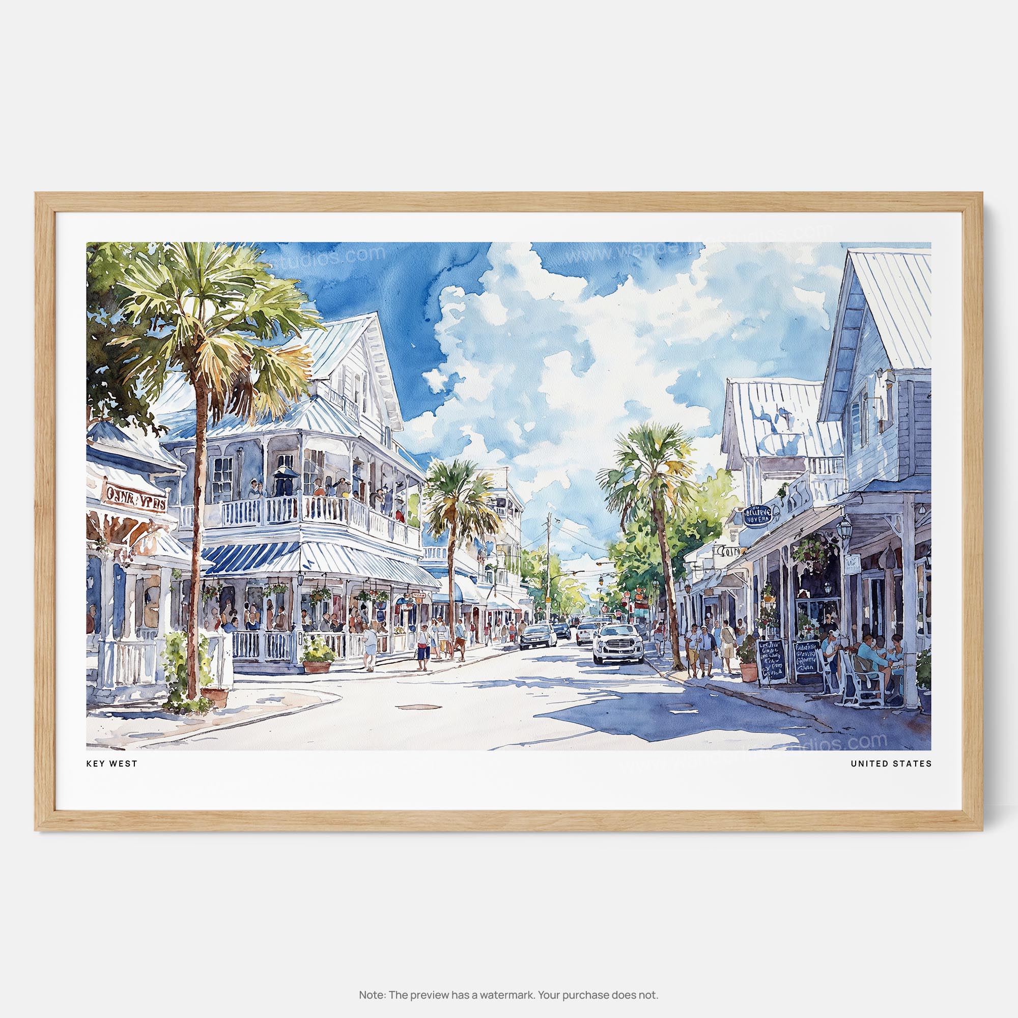 Key West Florida Duval Street Watercolor Art Print – Charming Coastal Scene for Home Decor
