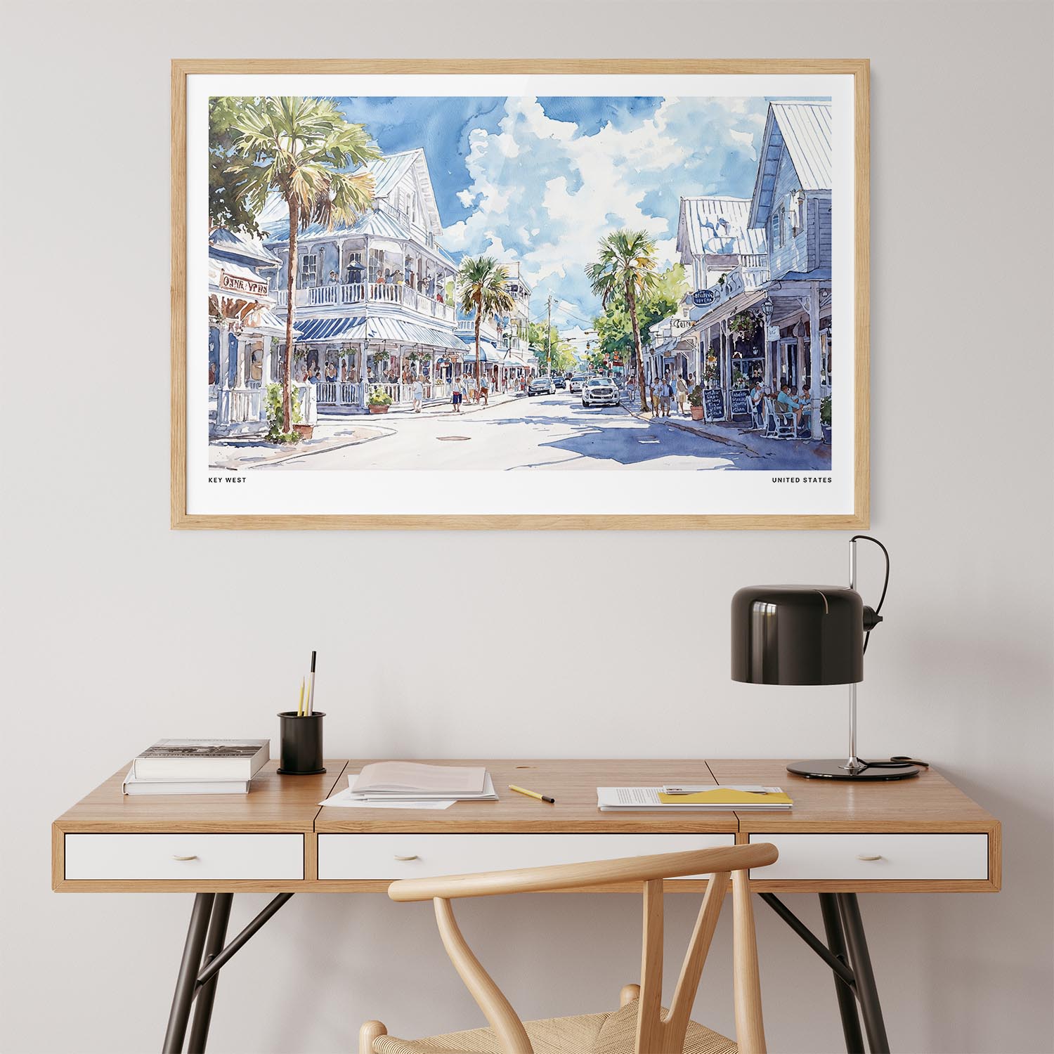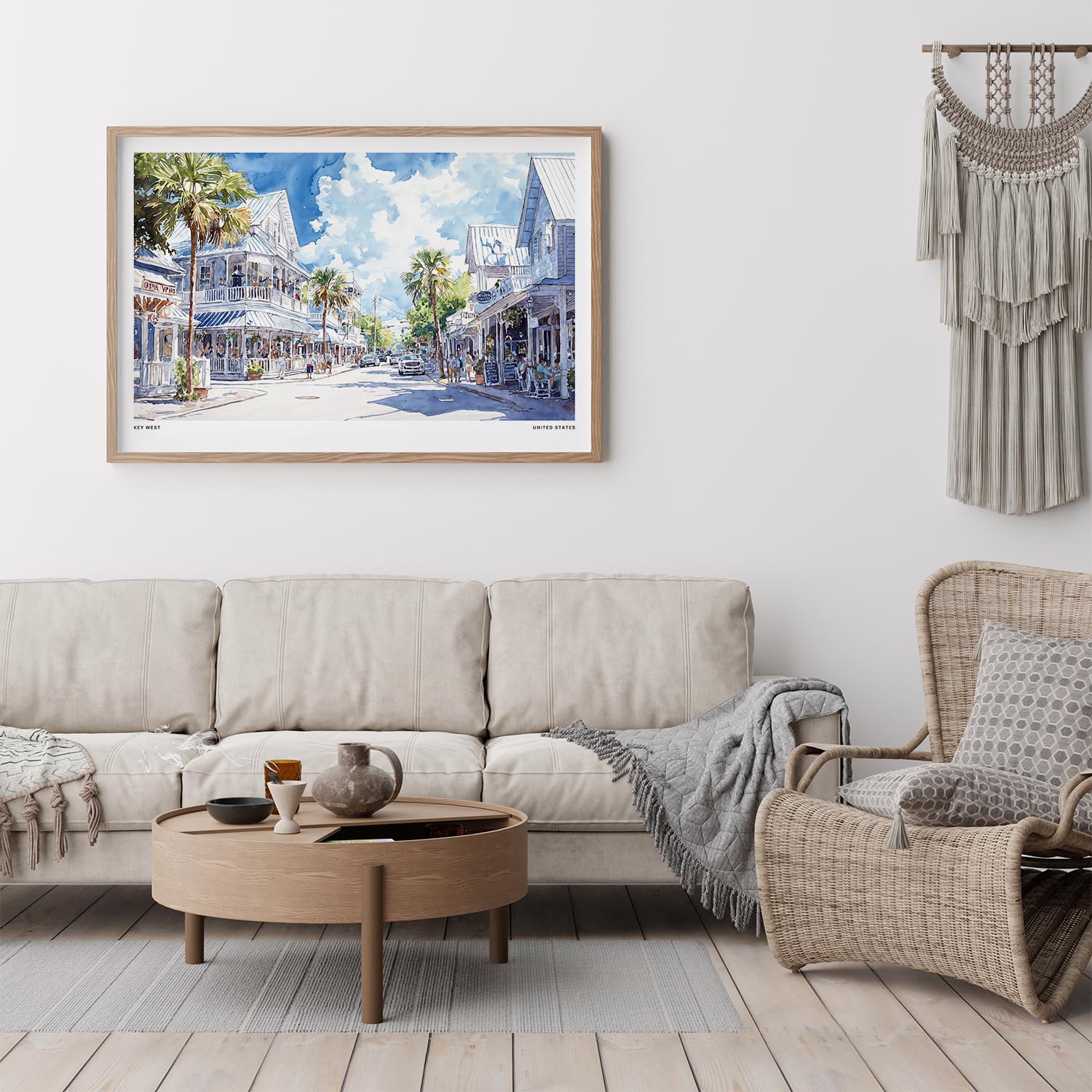 Capture the lively spirit of Duval Street with this watercolor art print from Key West, Florida. Perfect for brightening up your living room or office, it brings a touch of coastal charm to any space.