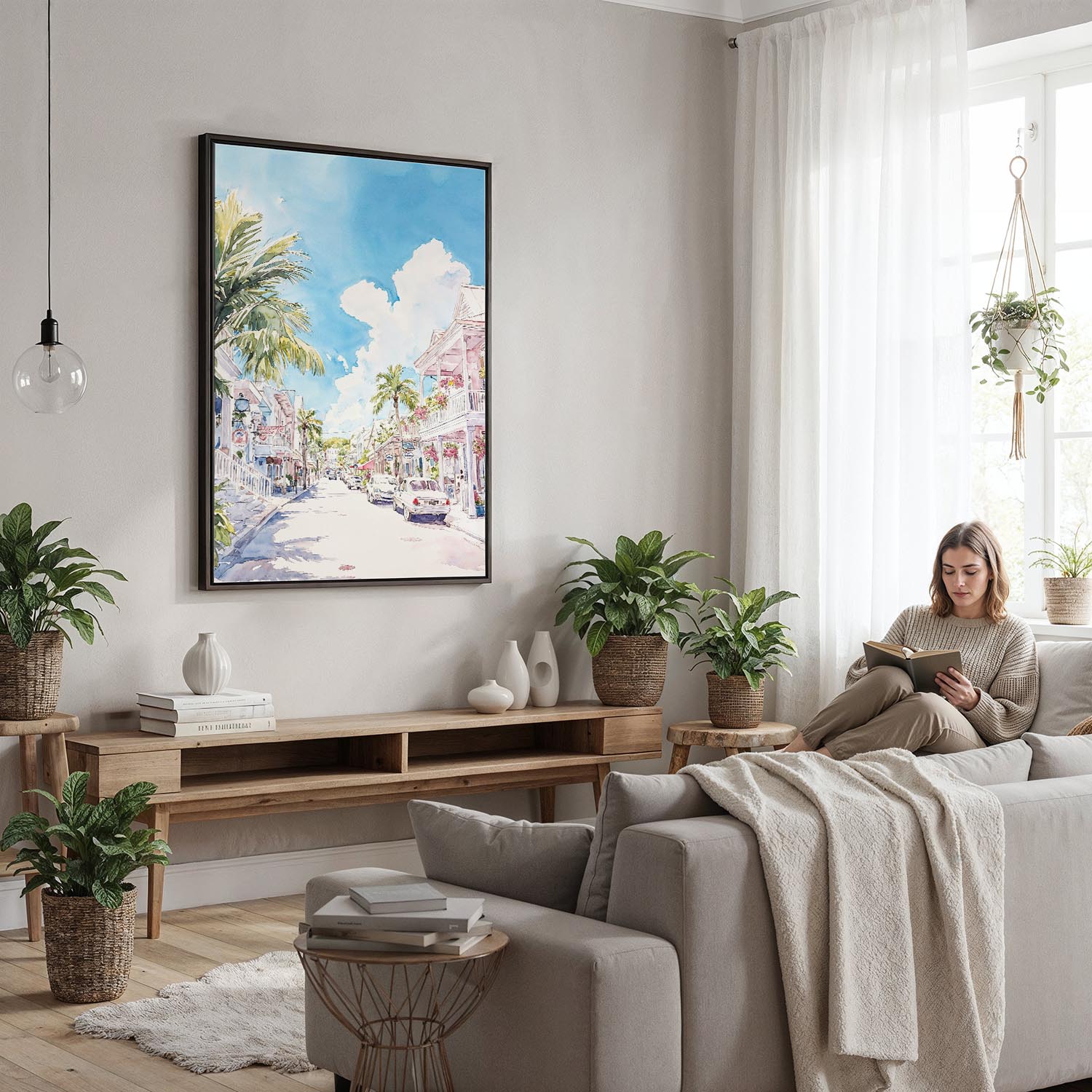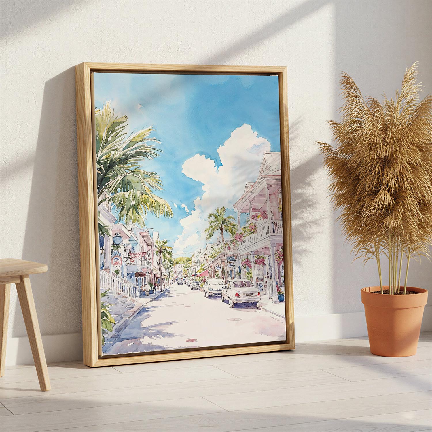 Experience the vibrant atmosphere of Key West through this beautiful watercolor canvas print. It captures a sunlit street lined with palm trees and charming homes, creating a warm and inviting scene that transports you to this tropical paradise.