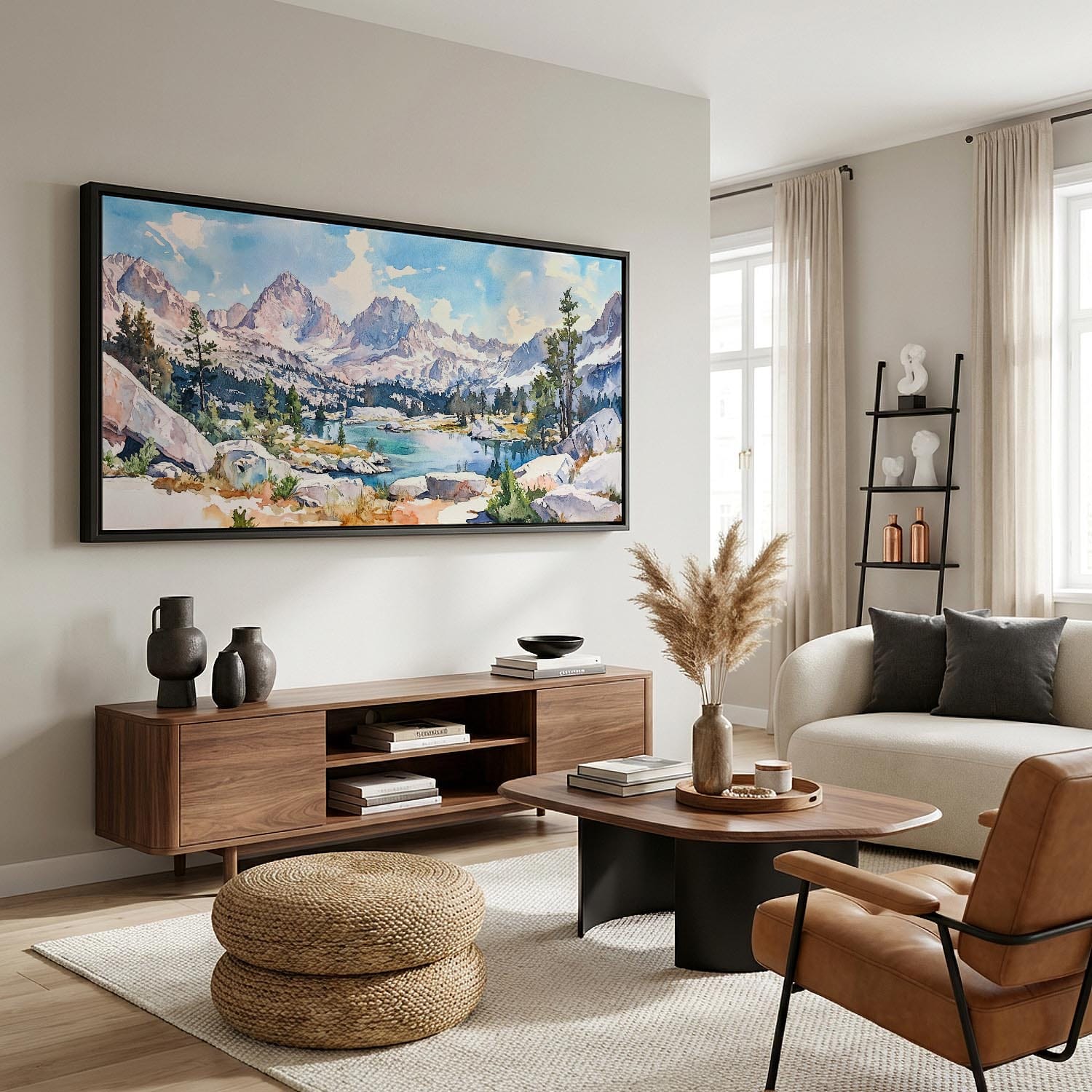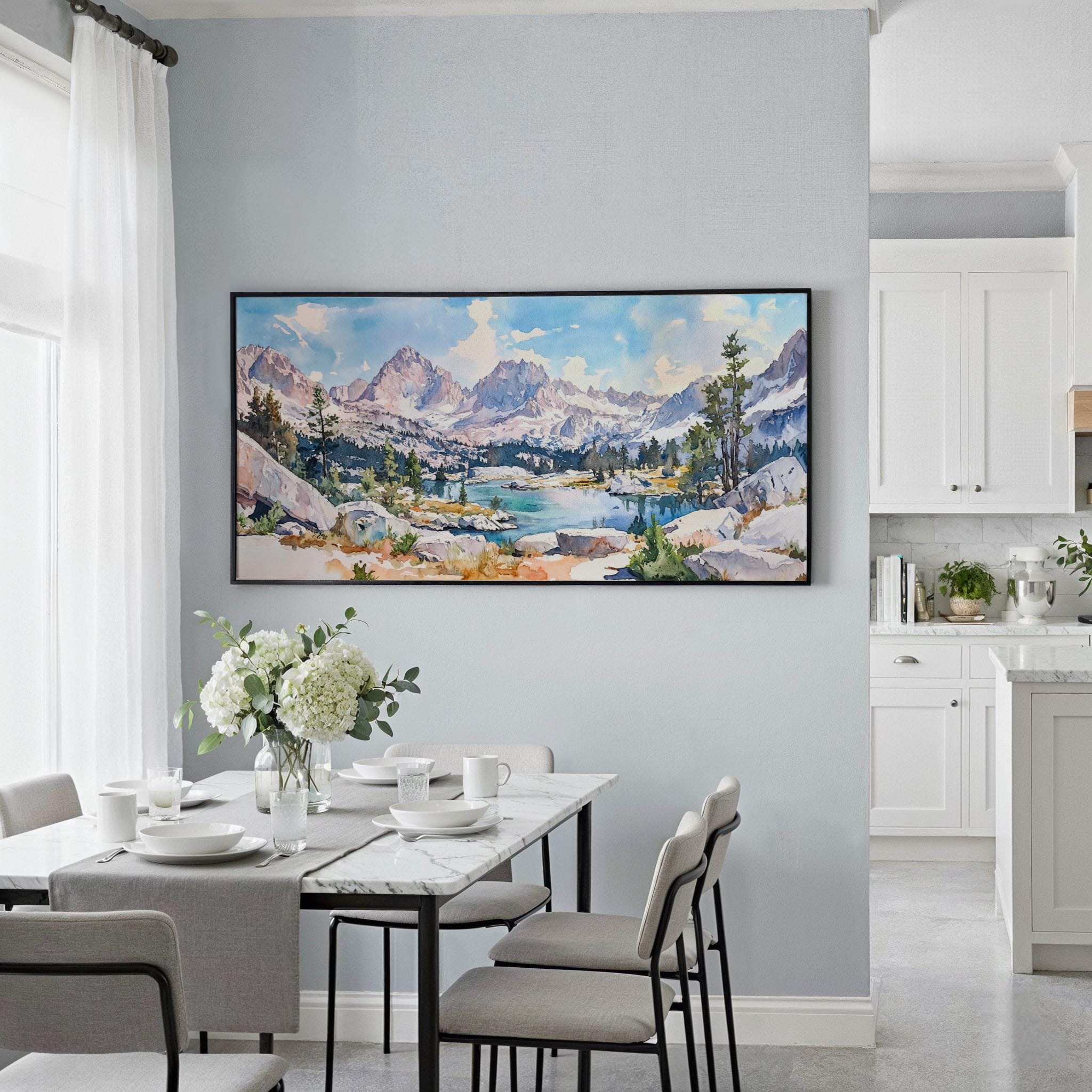 This artwork beautifully captures the breathtaking natural beauty of King Canyons National Park, featuring majestic mountains and serene waters against a vibrant sky. The wide 2:1 aspect ratio enhances your wall, offering depth and a sense of openness to any room. Crafted with high-quality materials, including hand-stretched canvas and fade-resistant inks, this piece is both ready to hang and made with sustainable practices in mind. It fits effortlessly above sofas or in hallways, making it an ideal accent for your home or a thoughtful gift for nature enthusiasts.