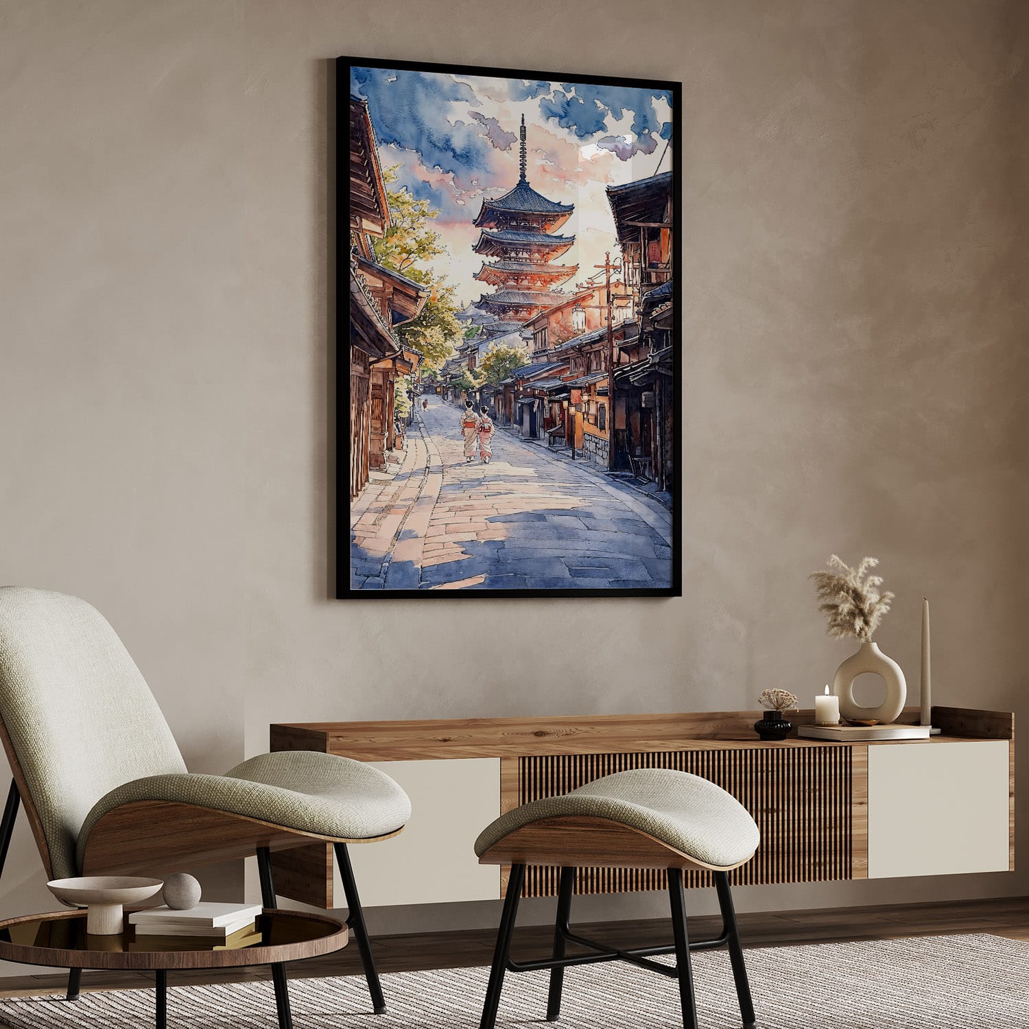Capture the essence of Kyoto with this watercolor digital download wall art. Featuring a charming pagoda at sunset, it offers a simple way to print and add a cultural touch to your space instantly.