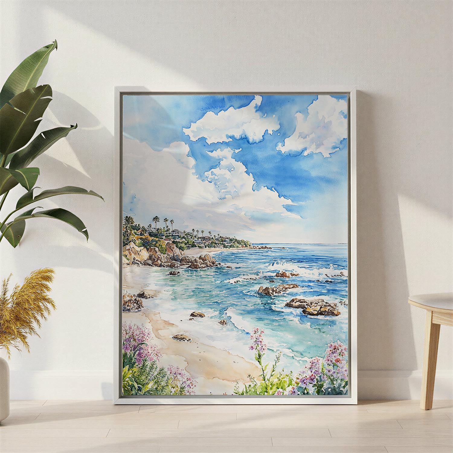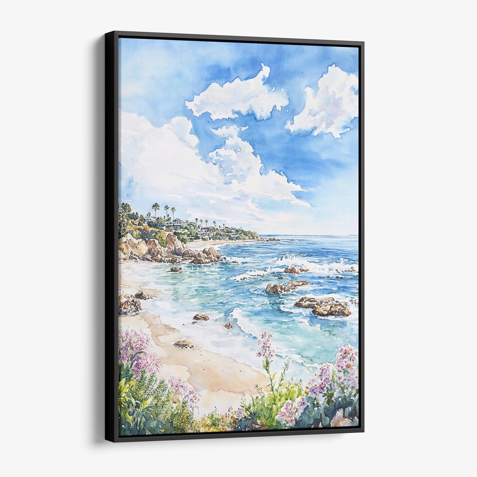 Celebrate the beauty of California’s coastline with this delightful watercolor canvas print of Laguna Beach. The artwork captures the shimmering waves, rugged rocks, and lush coastal flora, encapsulating the lively spirit of this iconic beach.