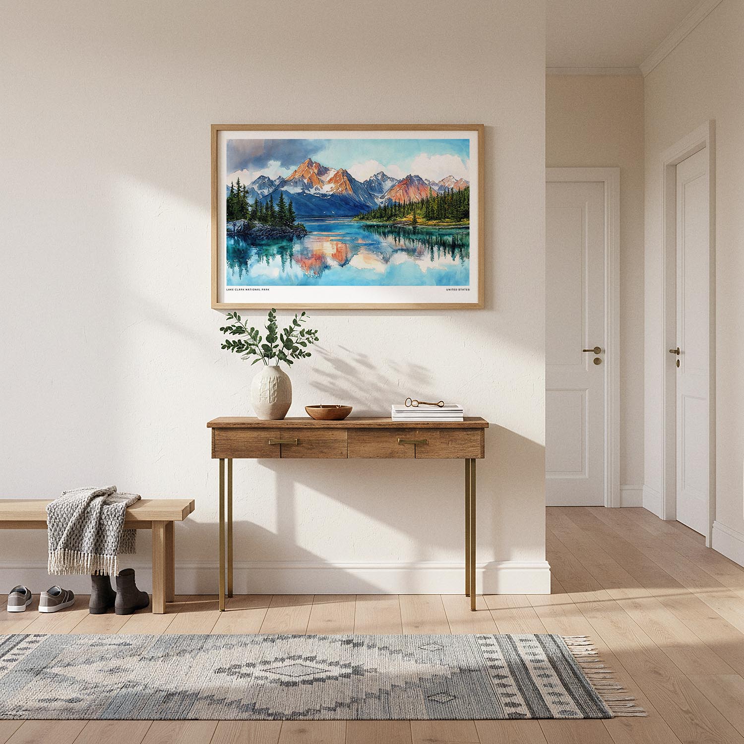 Capture the essence of Lake Clark National Park with this watercolor art print. It showcases the striking mountains and serene reflections of the lake, perfect for travel enthusiasts and lovers of nature.
