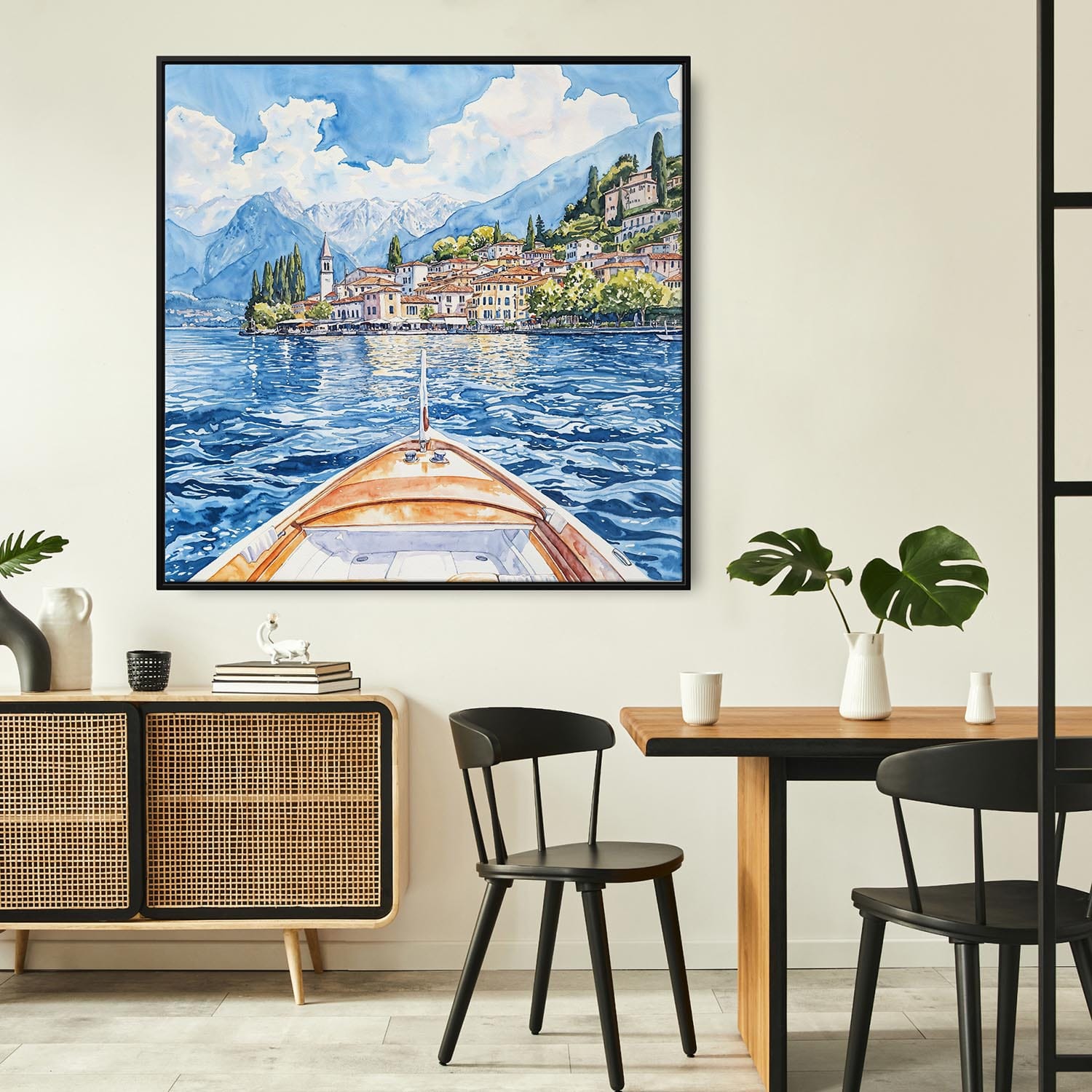 Transform your space with this Lake Como square canvas print. The vibrant watercolor depiction of the charming waterfront makes it an ideal addition to living rooms, offices, or as a statement piece on a gallery wall.