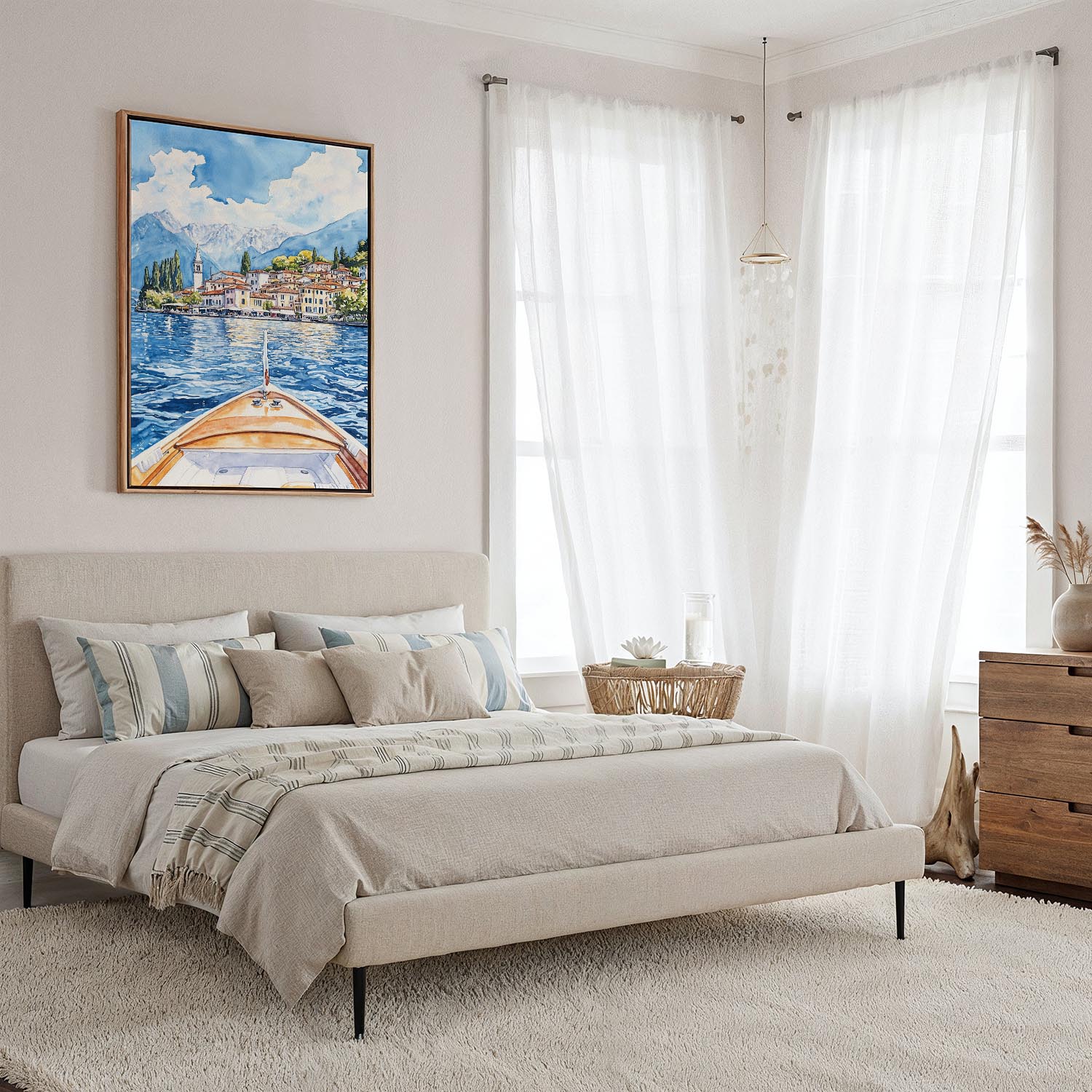 Embrace the elegance of Lake Como with this vibrant watercolor canvas print. It captures a breathtaking boat view, framed by stunning mountains and charming lakeside villas, creating a tranquil atmosphere that transports you to this idyllic location. Available in various finishes, including unframed or with a floater frame, this piece is crafted with hand-stretched canvas and solid wood stretcher bars, ensuring durability. The fade-resistant inks and matte finish keep the colors alive and fresh.