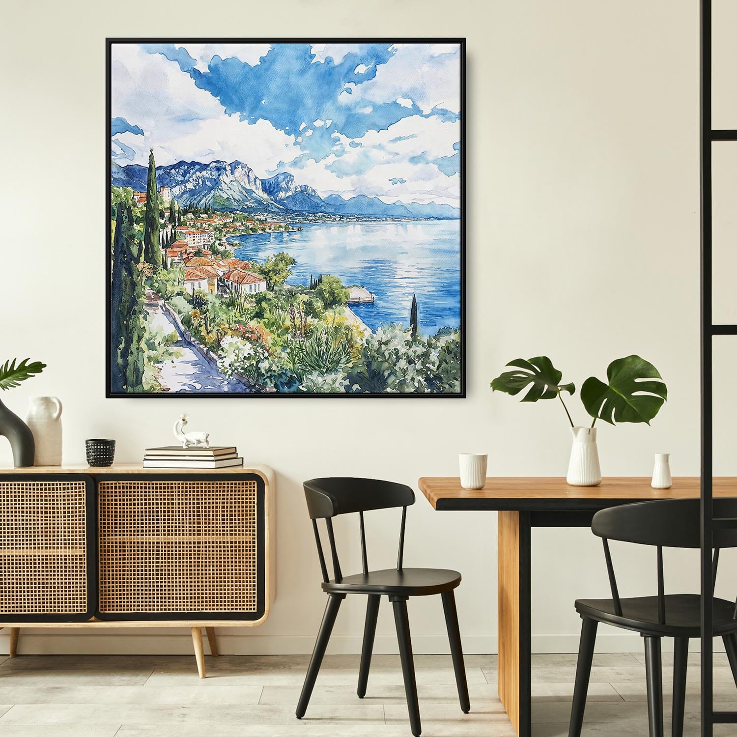 Lake Garda Italy Square Canvas Print | Scenic Waterfront Landscape in Watercolor Style