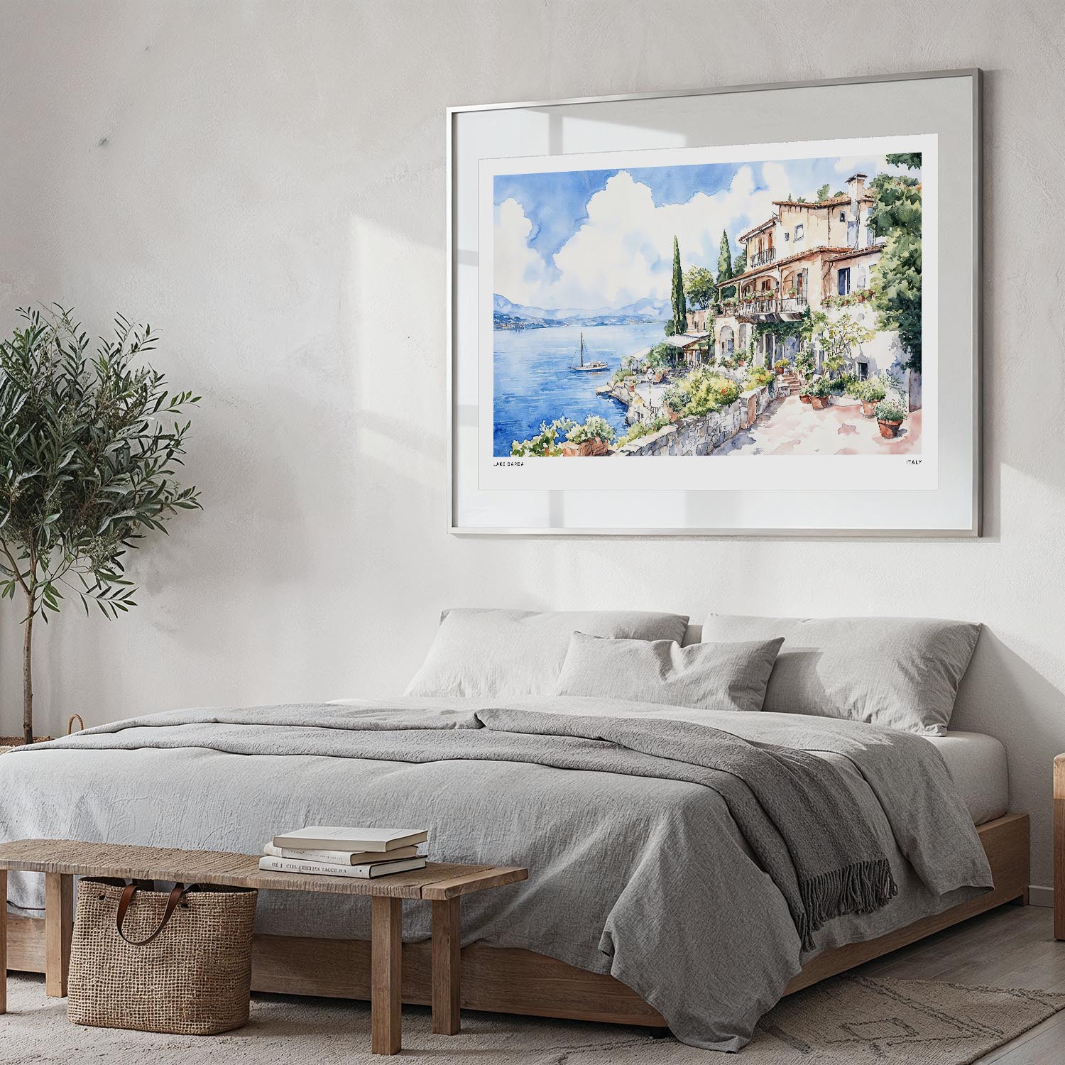 Capture the charm of Italy with this watercolor art print of a lakeside village at Lake Garda. Perfect for adding a warm touch to your living room or home office, and ready to hang.