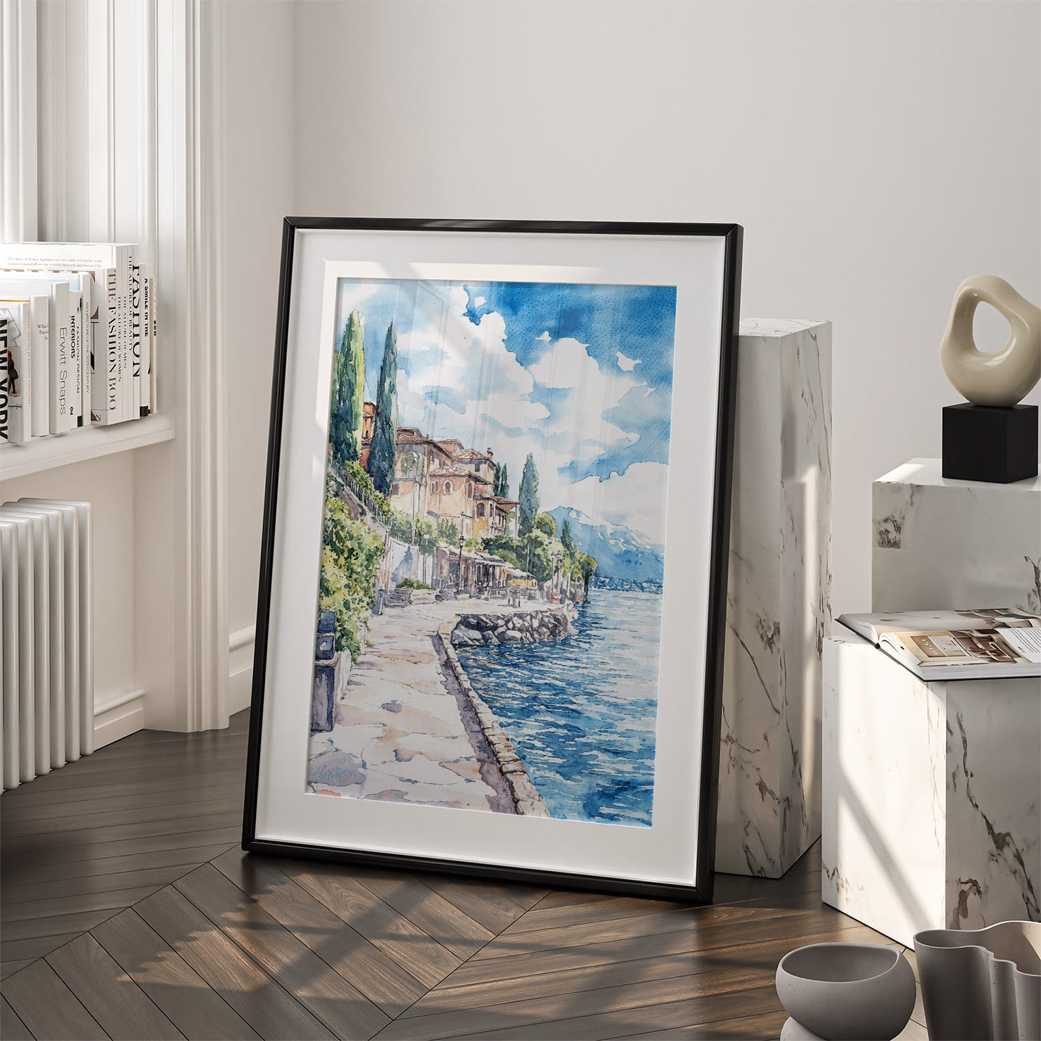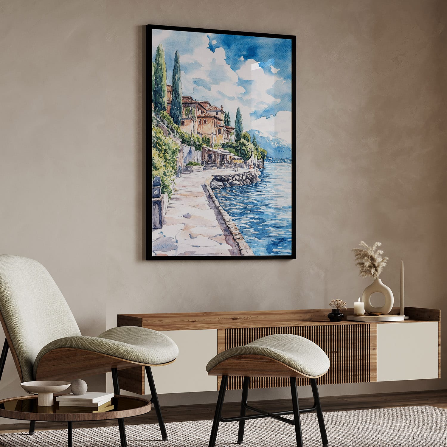 This artwork beautifully captures the lakeside beauty of Lake Garda with its flowing waters and charming architecture. The soft hues and inviting scenery create a relaxed atmosphere in any space. Provided as a high-resolution digital file, it can be printed at home or through a local service in various sizes. Ideal for living rooms, offices, or personal retreats, this piece offers the flexibility of instant access, making it a lovely addition to your decor.