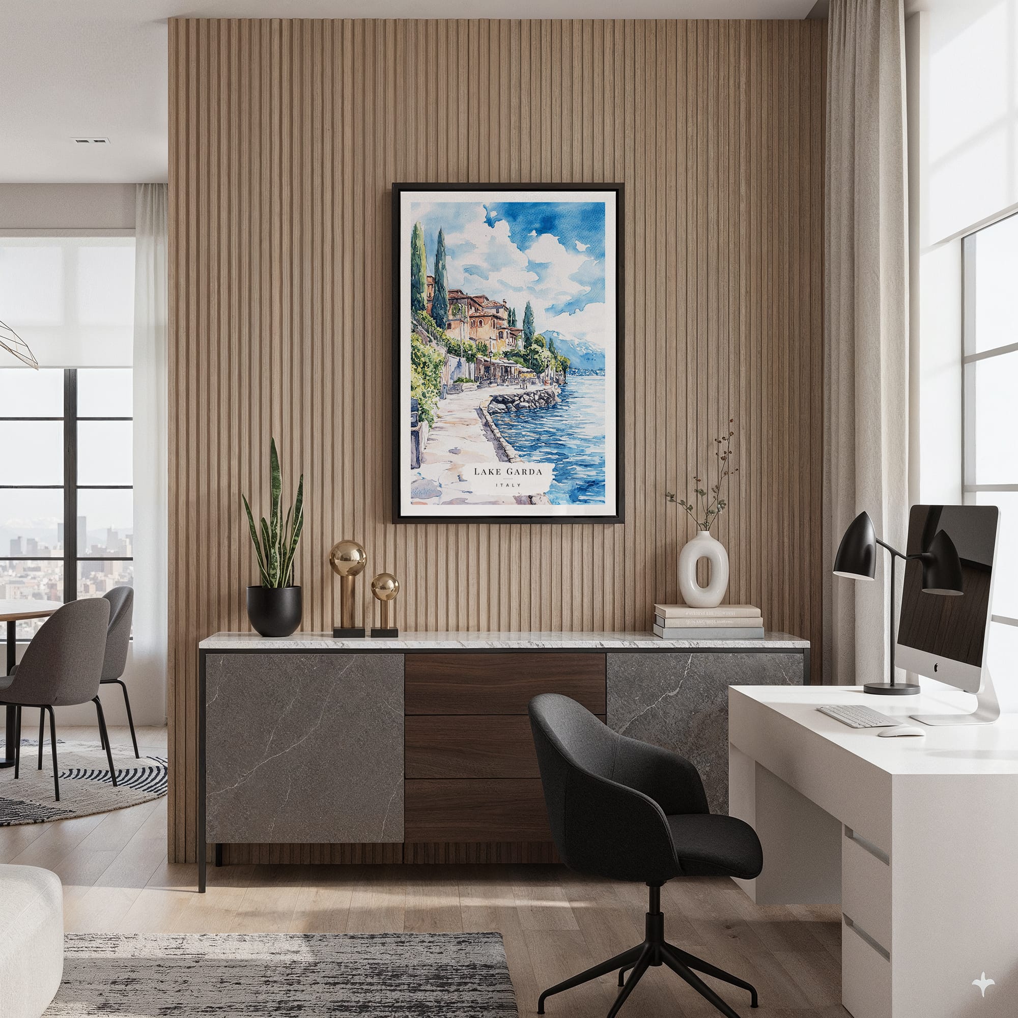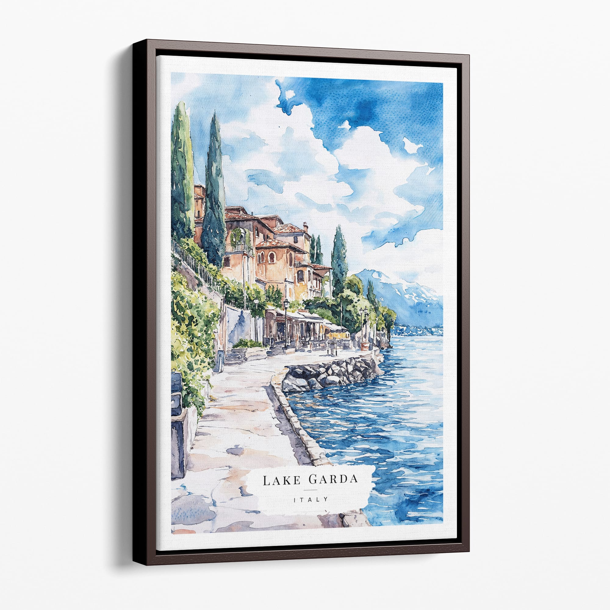 Capture the charm of Italy with this Lake Garda watercolor canvas print, showcasing serene blues and warm earthy hues. The artwork brings a relaxed and inviting feel to your space, ideal for living rooms or bedrooms. Made with high-quality, fade-resistant inks on gallery-wrapped canvas, it arrives ready to hang. This piece is perfect for those who love travel or want to add a touch of tranquility to their home.
