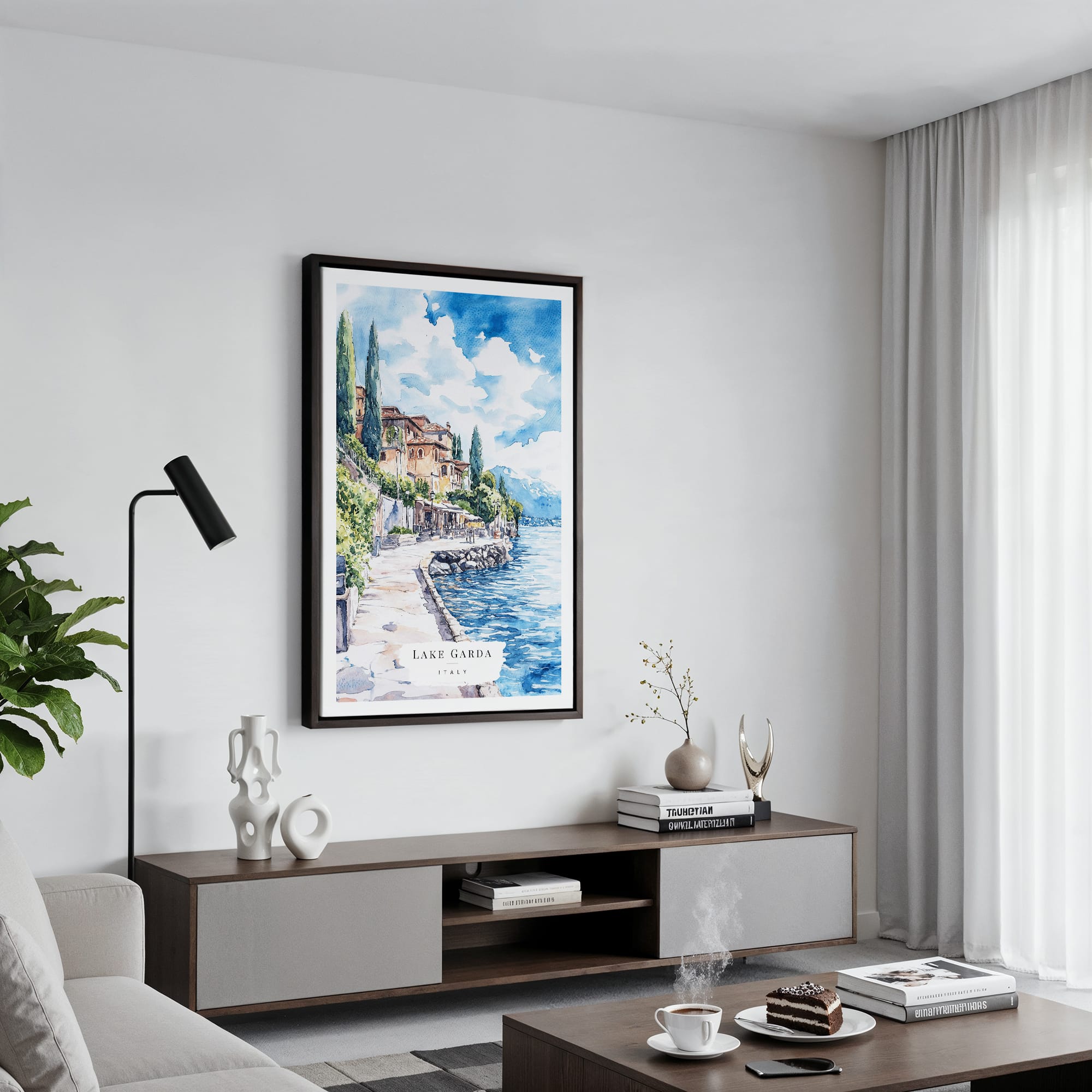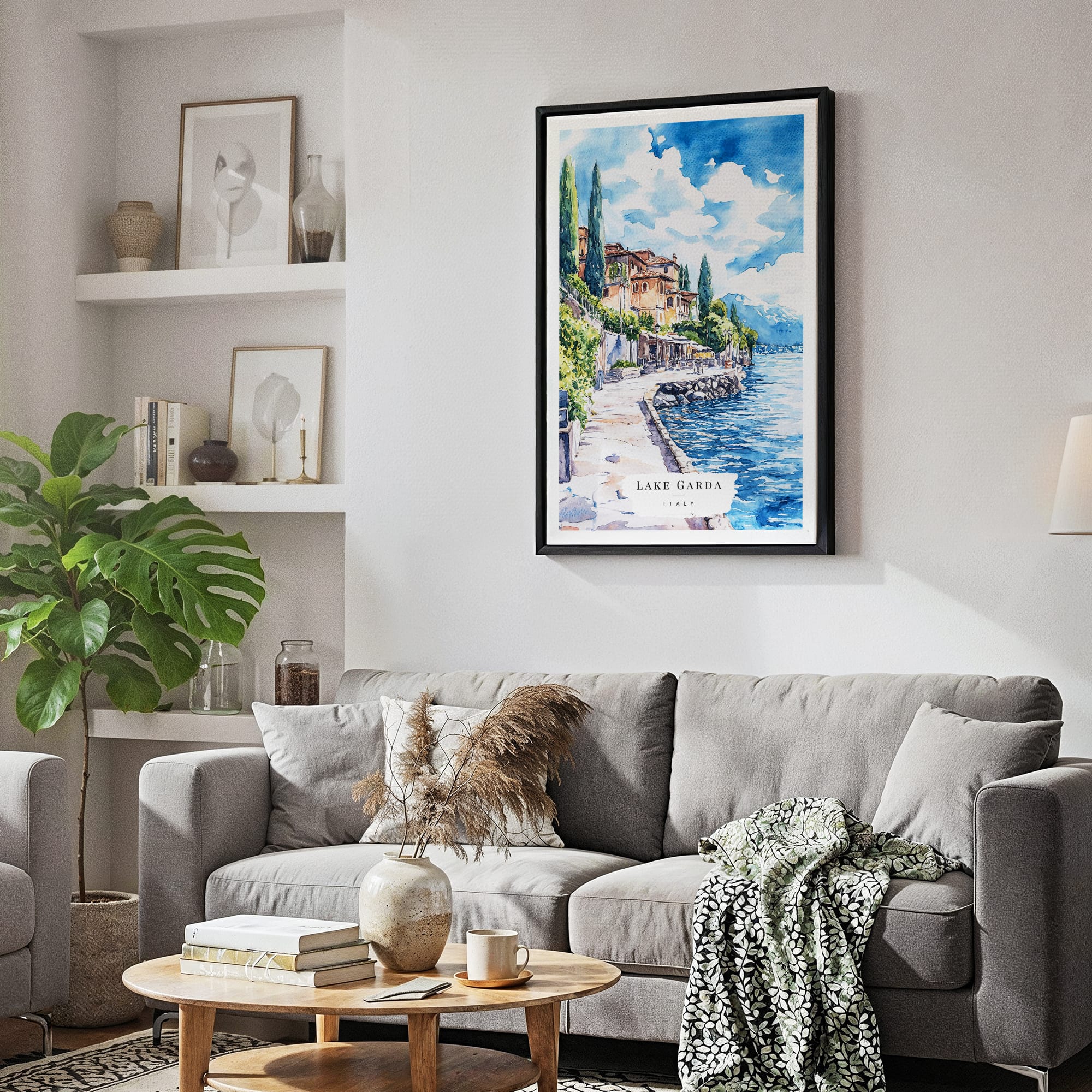 This Lake Garda canvas art print features a tranquil lakeside view with soft blues and earthy tones. It effortlessly enhances any room, making it a lovely choice for your living space or a thoughtful gift.