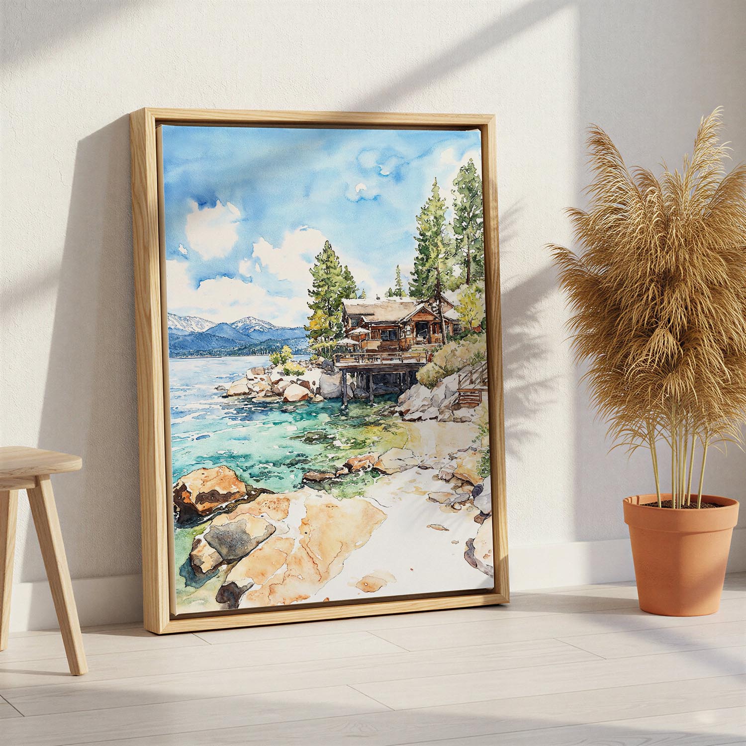 Lake Tahoe Cabin Canvas Print – Watercolor Landscape Wall Art