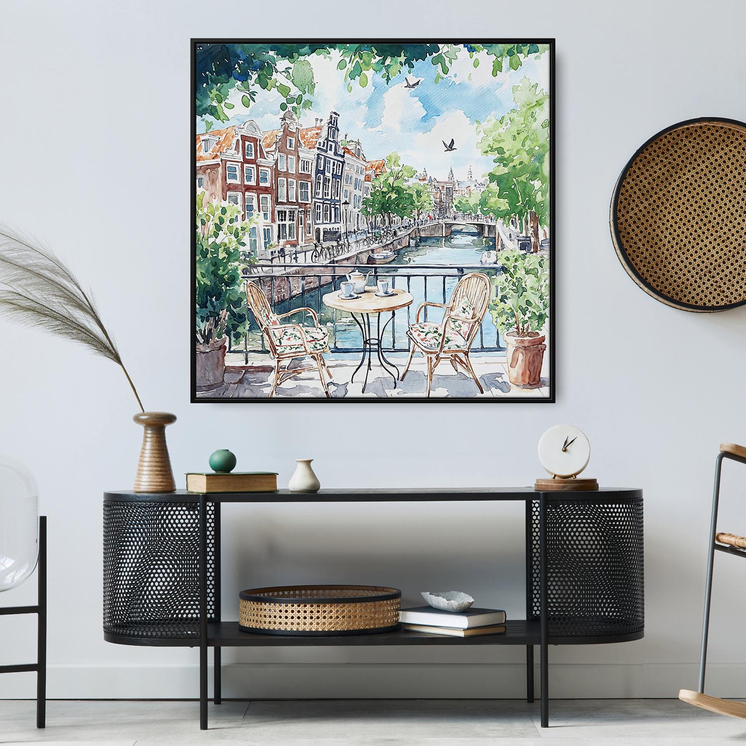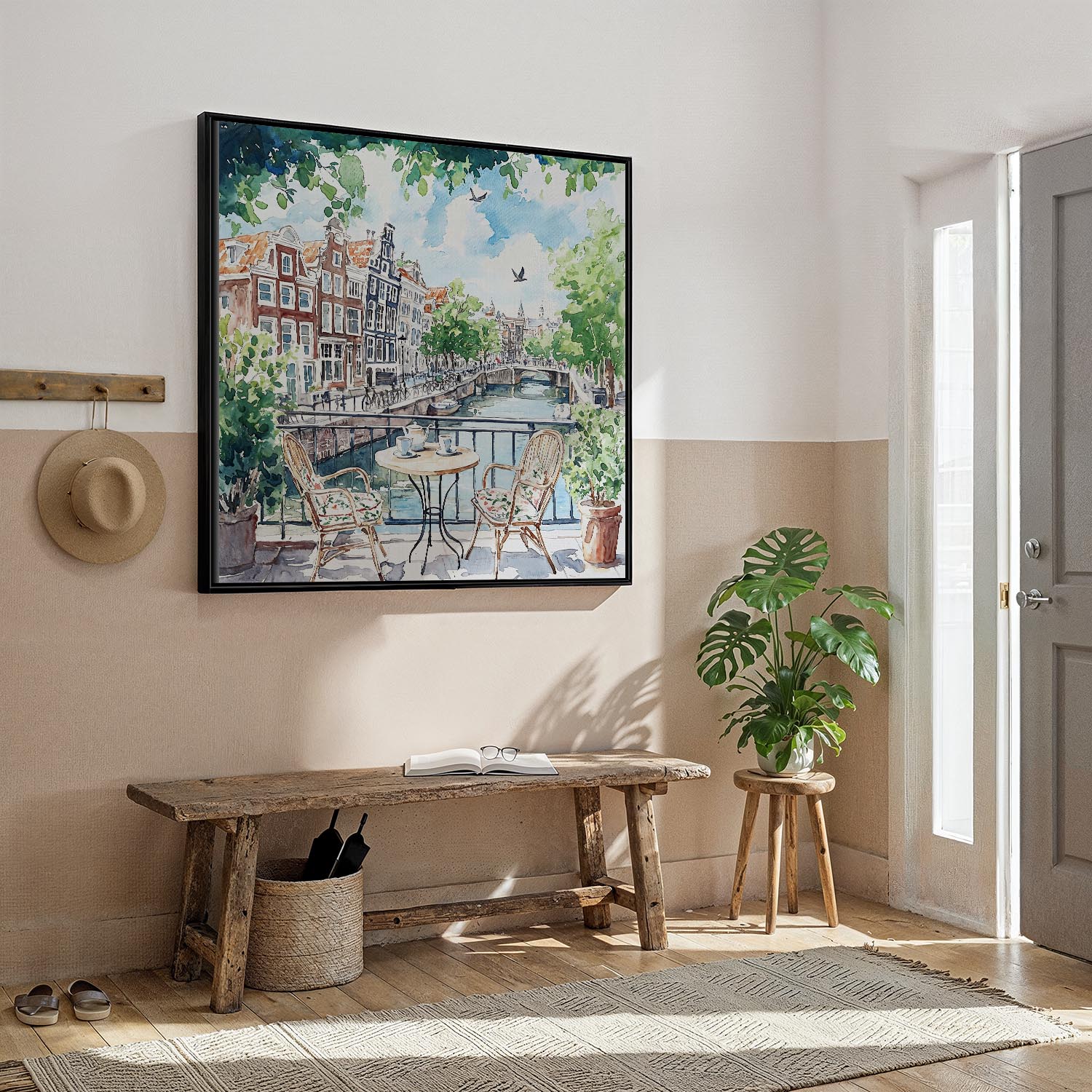 Transform your space with this Amsterdam Canal square canvas print. Featuring vibrant waterways and cozy architecture, its balanced square format enhances living rooms, offices, or any wall needing a touch of charm.