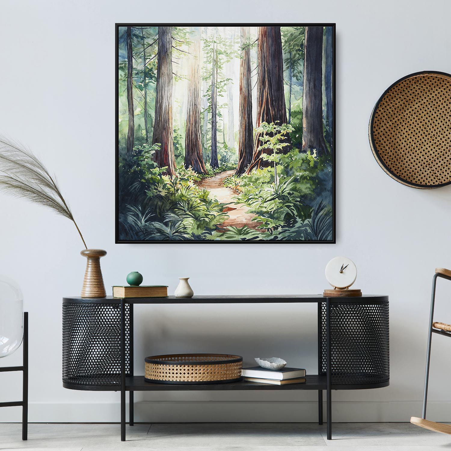 Large Redwoods National Park Watercolor Canvas Print | Square Wall Art of Enchanted Forest Path