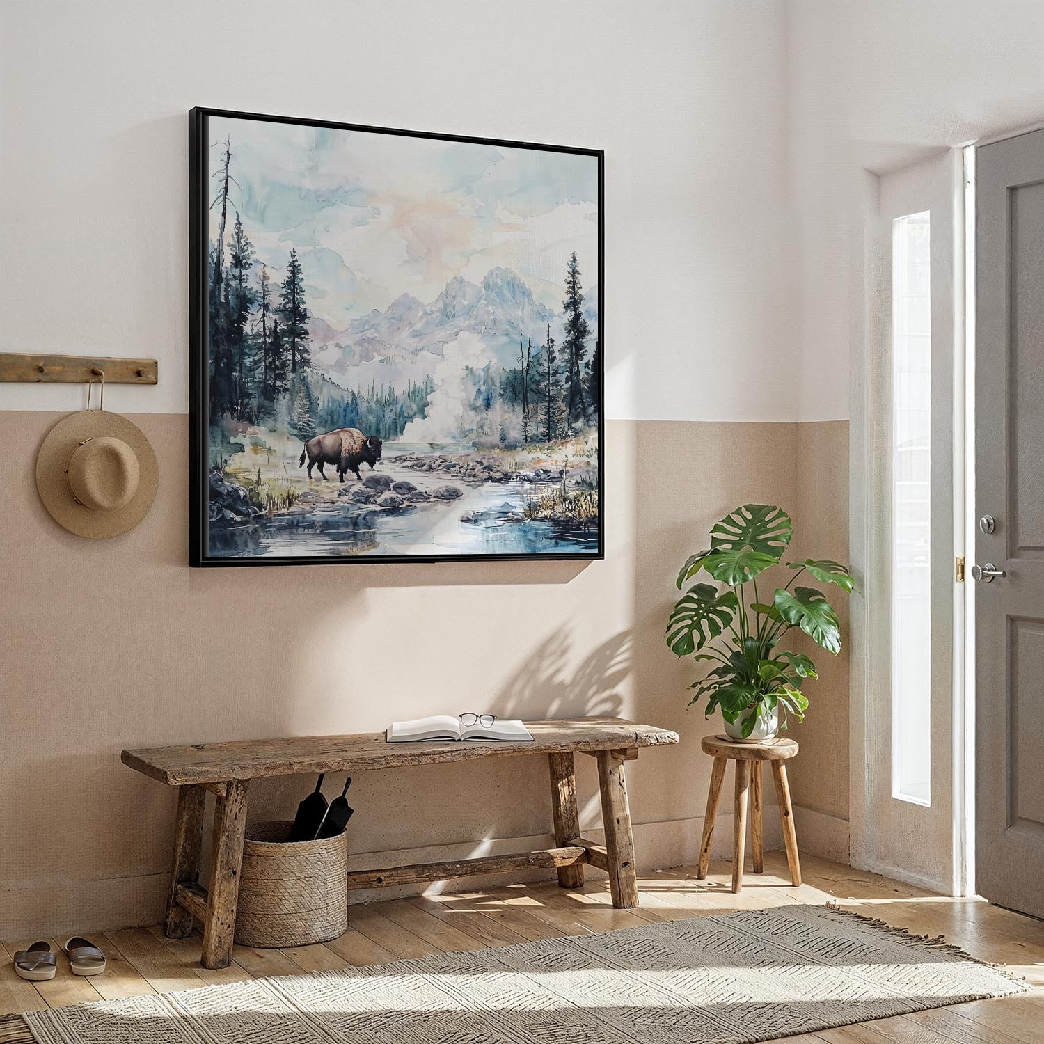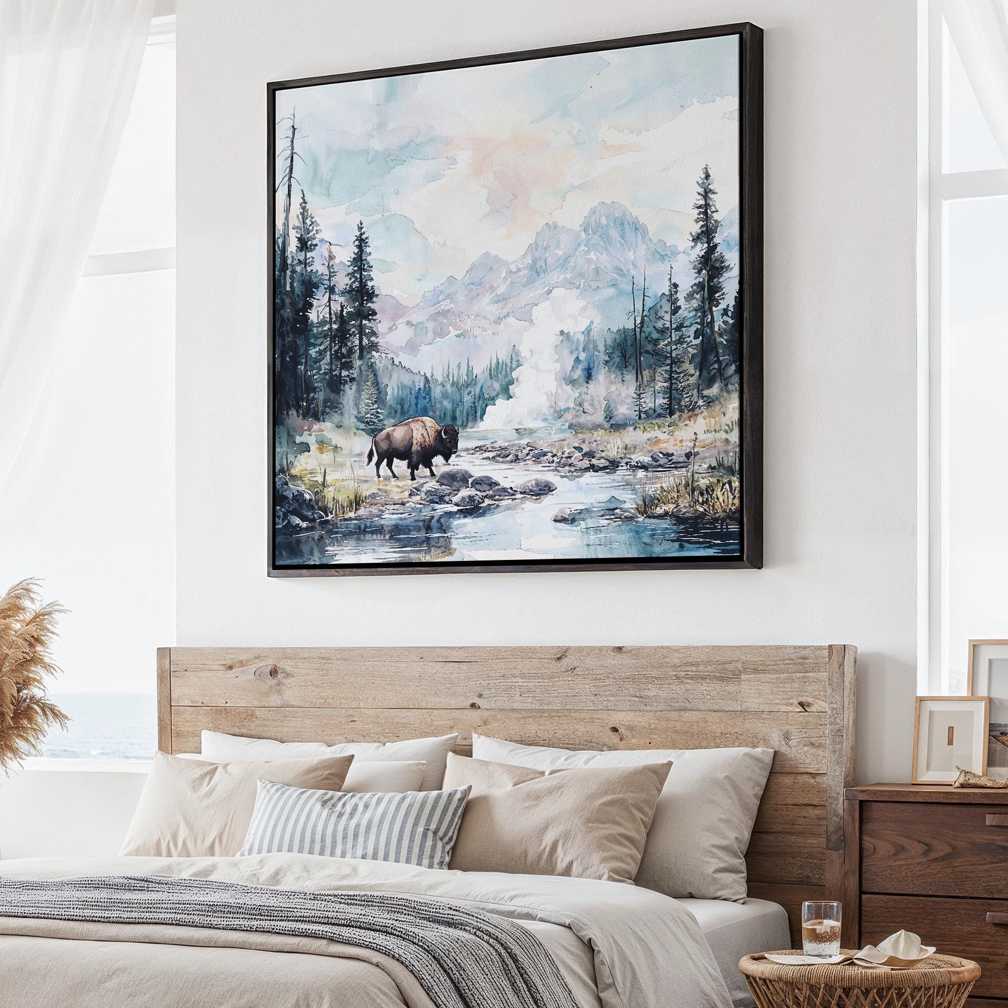 This square canvas print captures the breathtaking landscapes of Yellowstone National Park, showcasing majestic mountains and roaming bison in a soft watercolor style. The unique 1:1 format enhances the artwork’s impact, making it a captivating focal point in any room. Printed on high-quality canvas using fade-resistant inks, it arrives ready to hang with solid wood stretcher bars. Ideal for living rooms, hallways, or even workspaces, it brings a touch of nature indoors, making it a thoughtful gift or a treasured addition to your home decor.