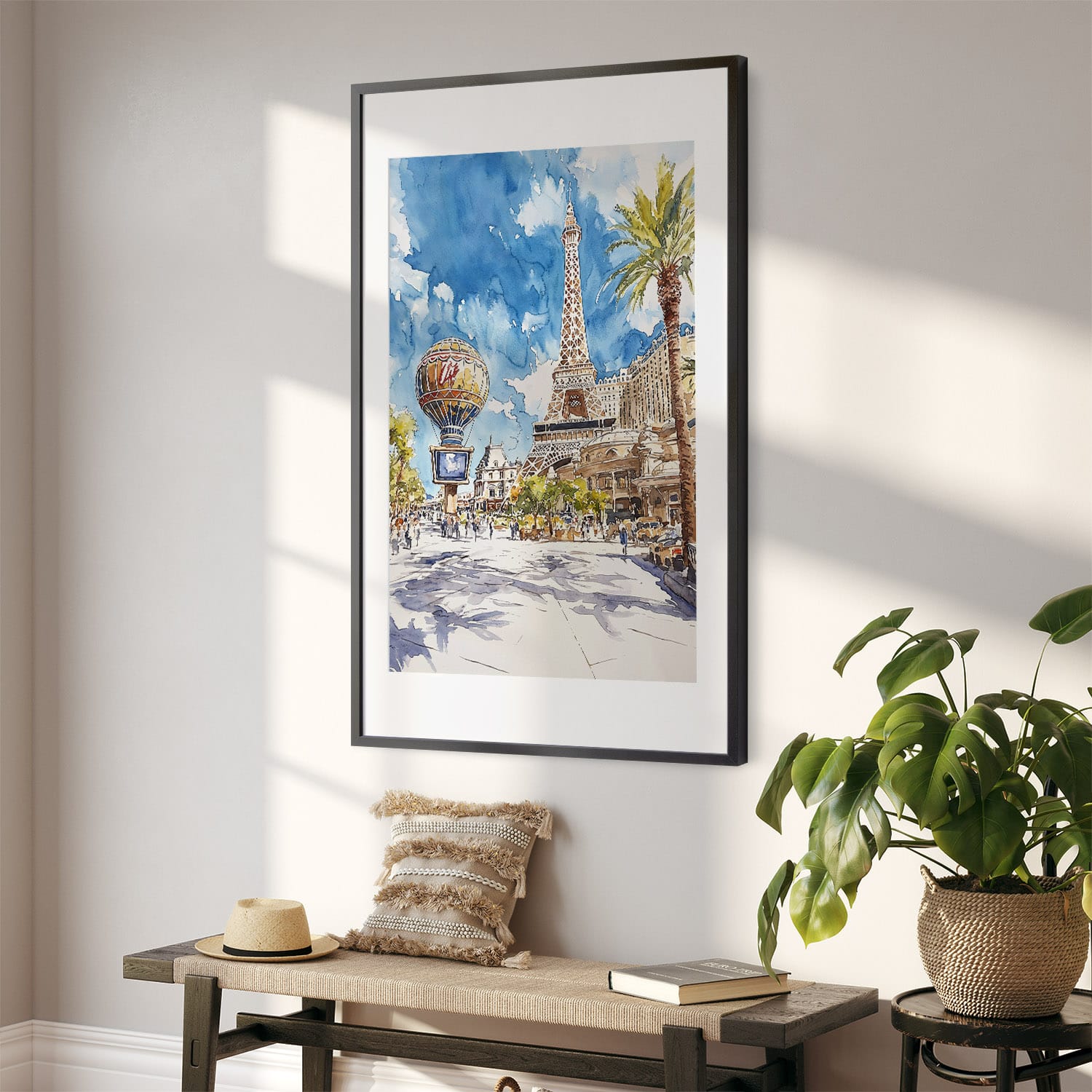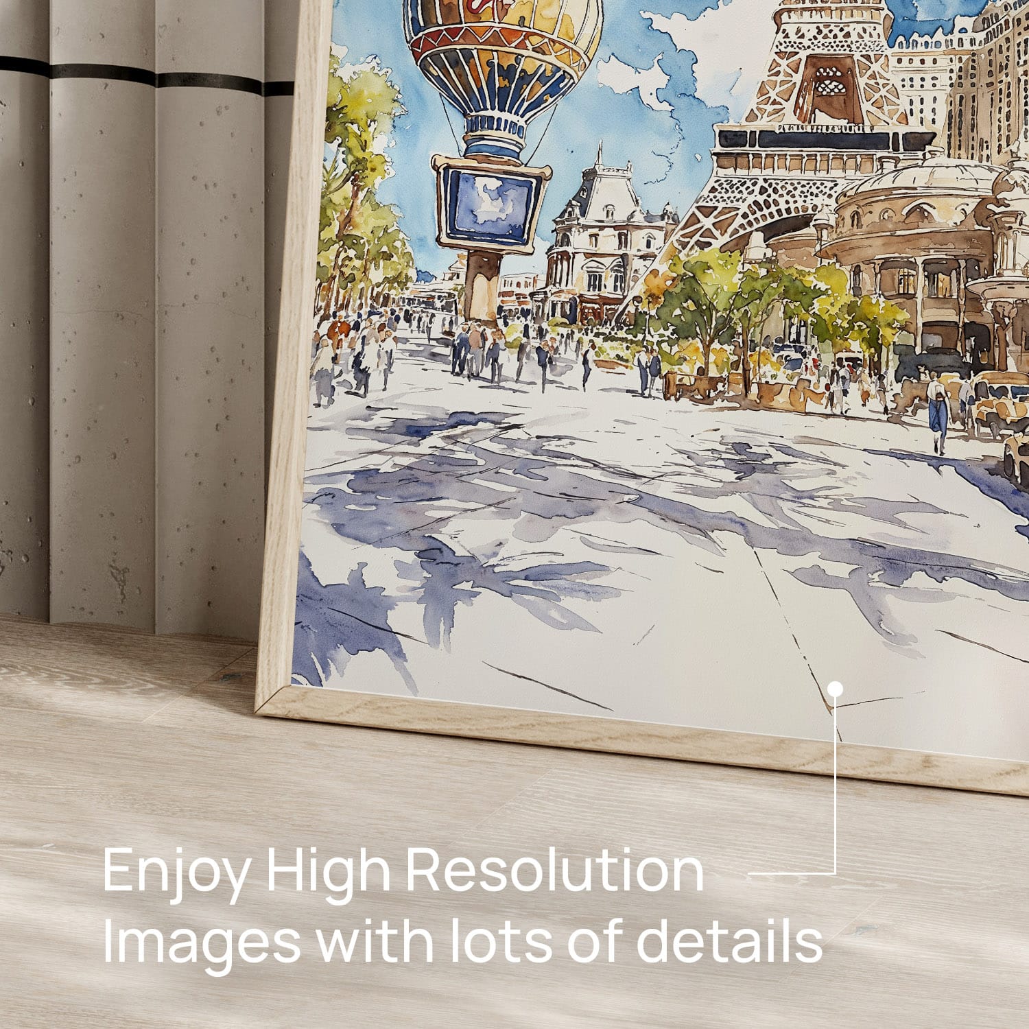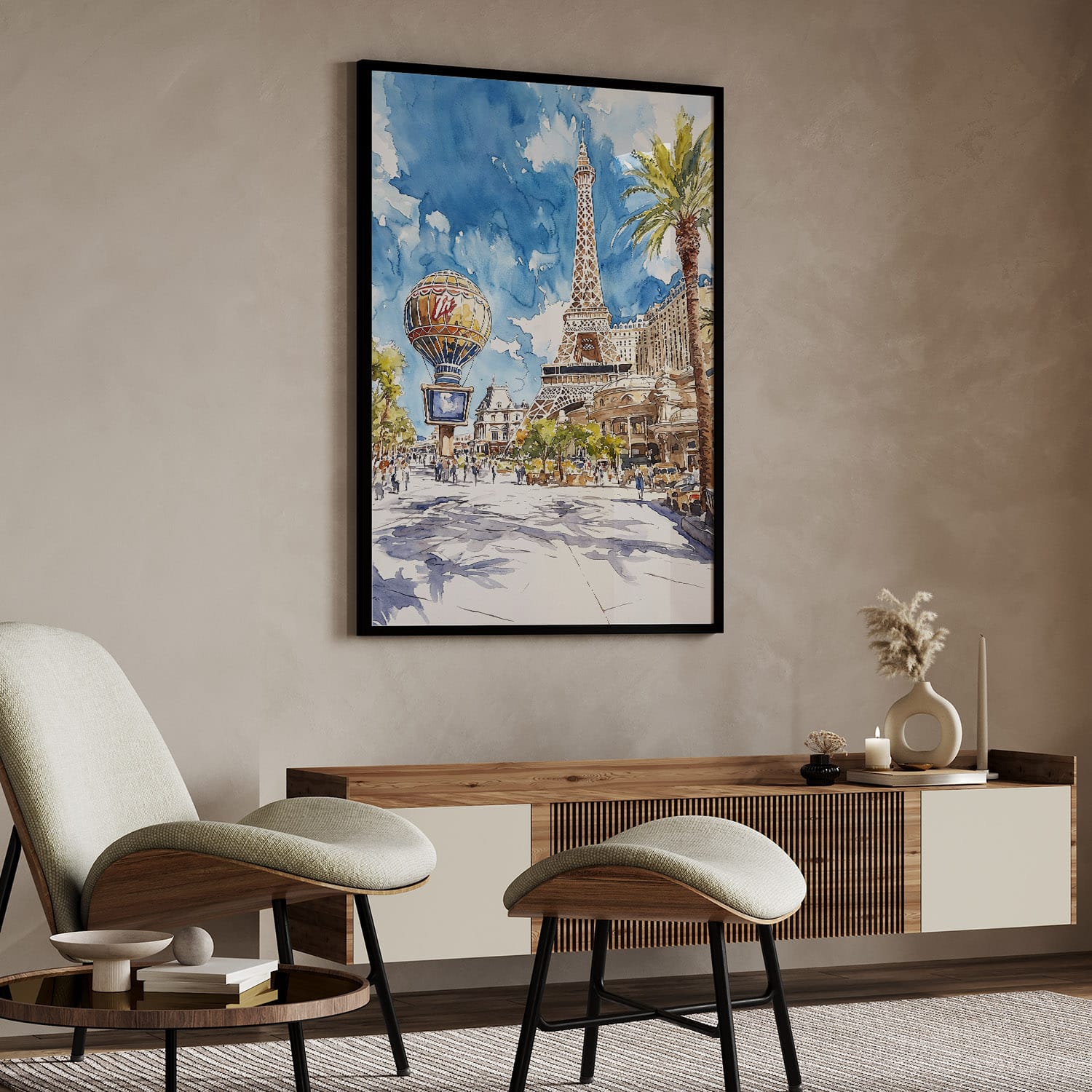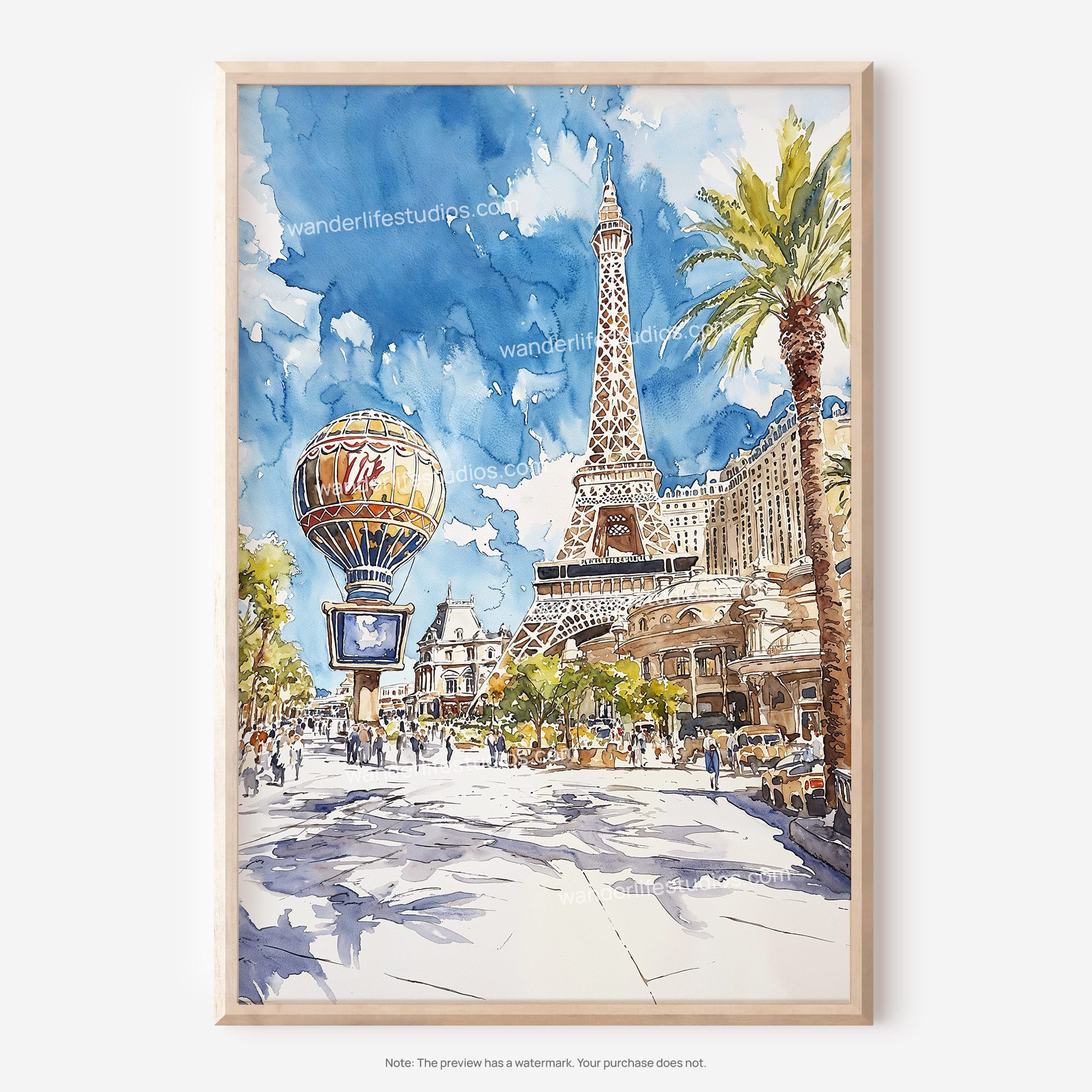 This artwork showcases the vibrant atmosphere of Las Vegas, featuring the Eiffel Tower and a hot air balloon against a bright blue sky. Its lively colors bring a sense of excitement to any room, making it perfect for modern spaces. Delivered as a high-resolution digital file, it can be printed in various sizes at home or via your favorite print shop. Ideal for living rooms, bedrooms, or offices, this piece adds a personal touch to your décor. Enjoy the flexibility of instant access and elevate your walls effortlessly.