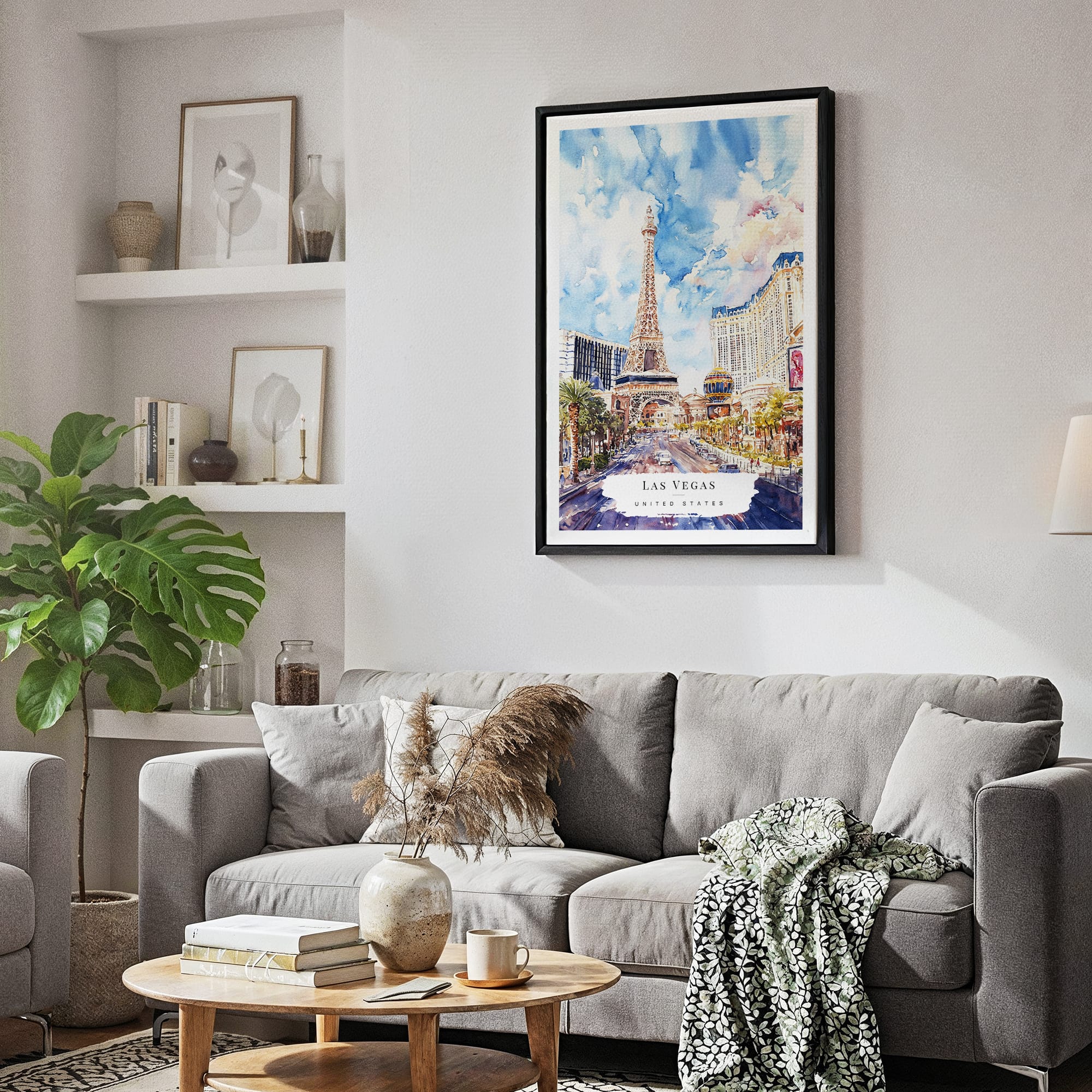 Capture the vibrant energy of Las Vegas with this watercolor canvas art print featuring the iconic Eiffel Tower. Its lively colors and busy scene are perfect for adding a touch of excitement to living rooms or offices, making it an easy decor choice.