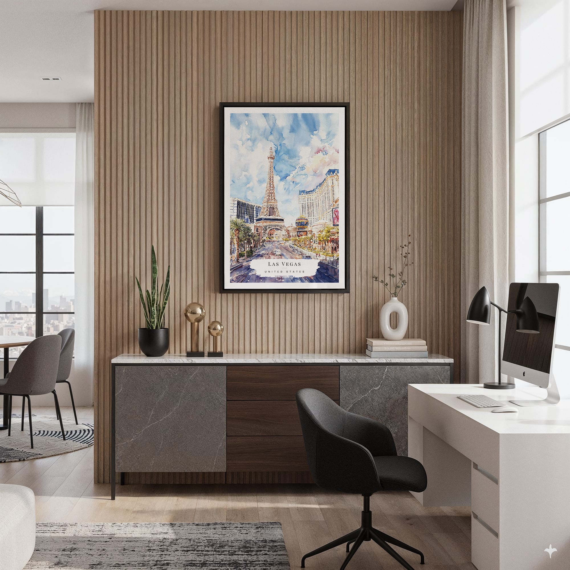 This artwork beautifully illustrates the lively Las Vegas Strip, featuring the Eiffel Tower and a bustling street scene. The mix of bright colors and soft blues creates an energetic yet inviting atmosphere. Printed on high-quality canvas using fade-resistant inks, it arrives ready to hang, making it suitable for various spaces, including living rooms, offices, or entertainment areas. Ideal for those who love travel or the charm of city life, this piece can refresh your decor or serve as a thoughtful gift.