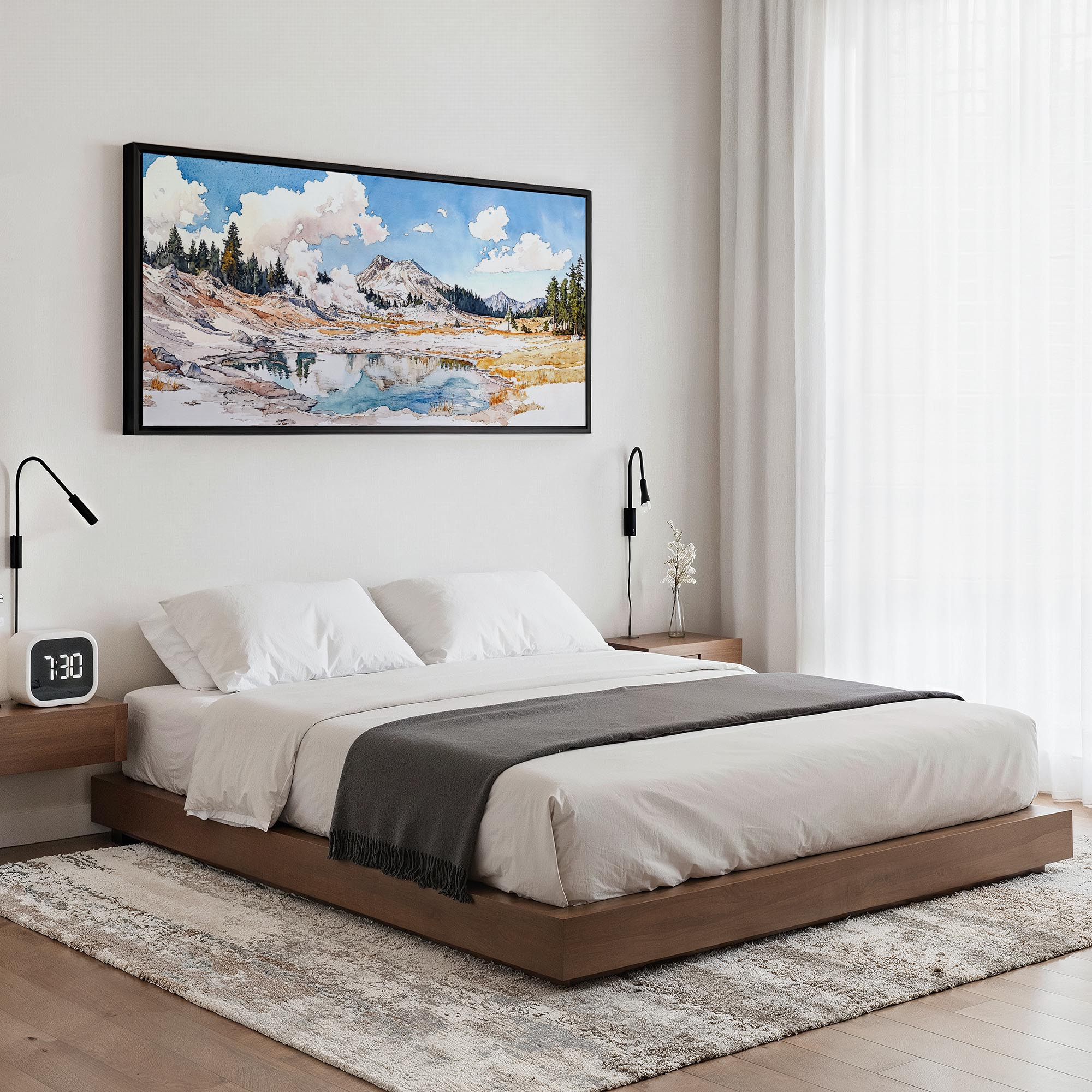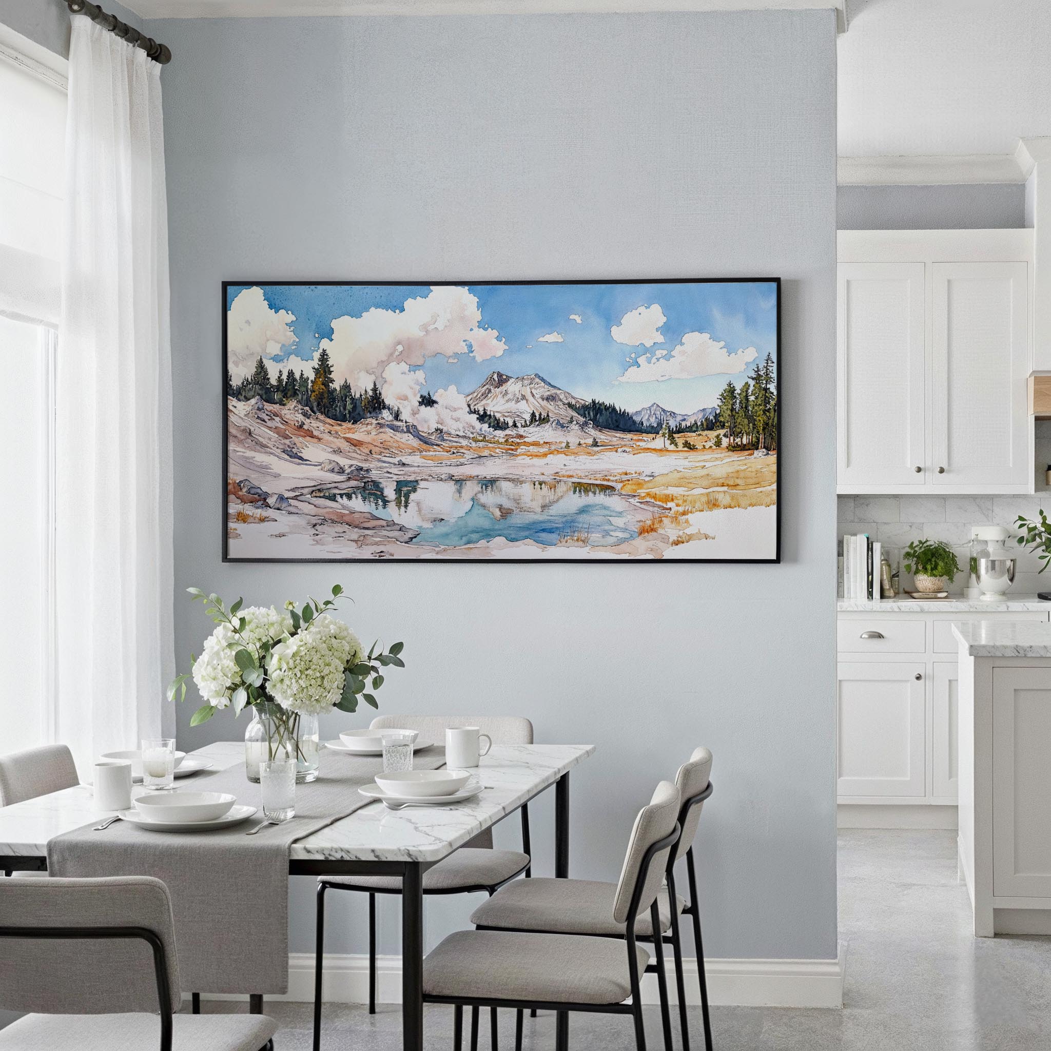 This artwork captures the unique beauty of Lassen Volcanic National Park, highlighting the mountains and peaceful lake in a lively watercolor style. The wide 2:1 aspect ratio enhances the room’s depth and openness. Crafted on premium hand-stretched canvas with fade-resistant inks and solid wood stretcher bars, it arrives ready to hang and has a matte finish for a refined look. Perfect over sofas, in hallways, or in workspaces, it serves as a thoughtful gift or a personal addition for nature lovers.