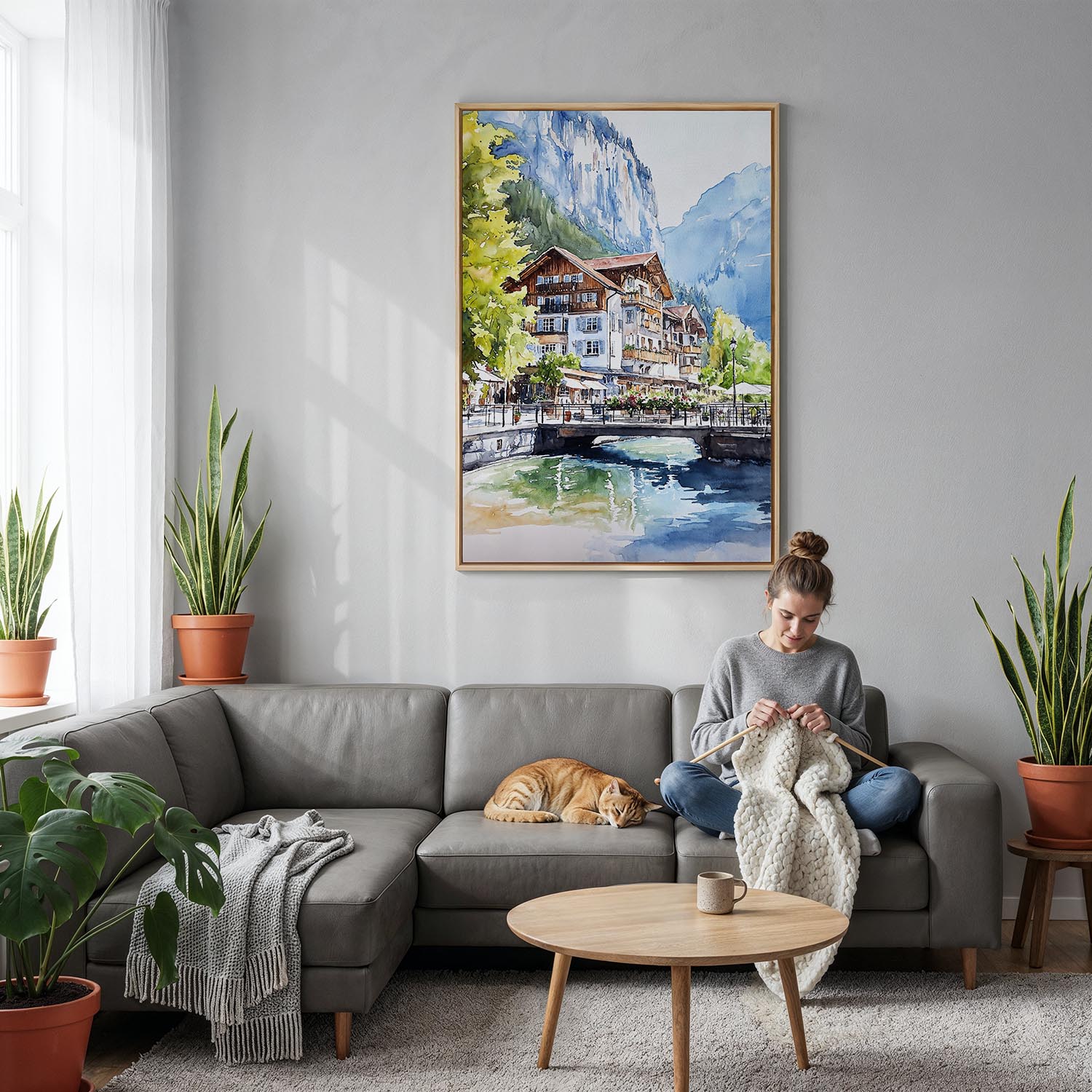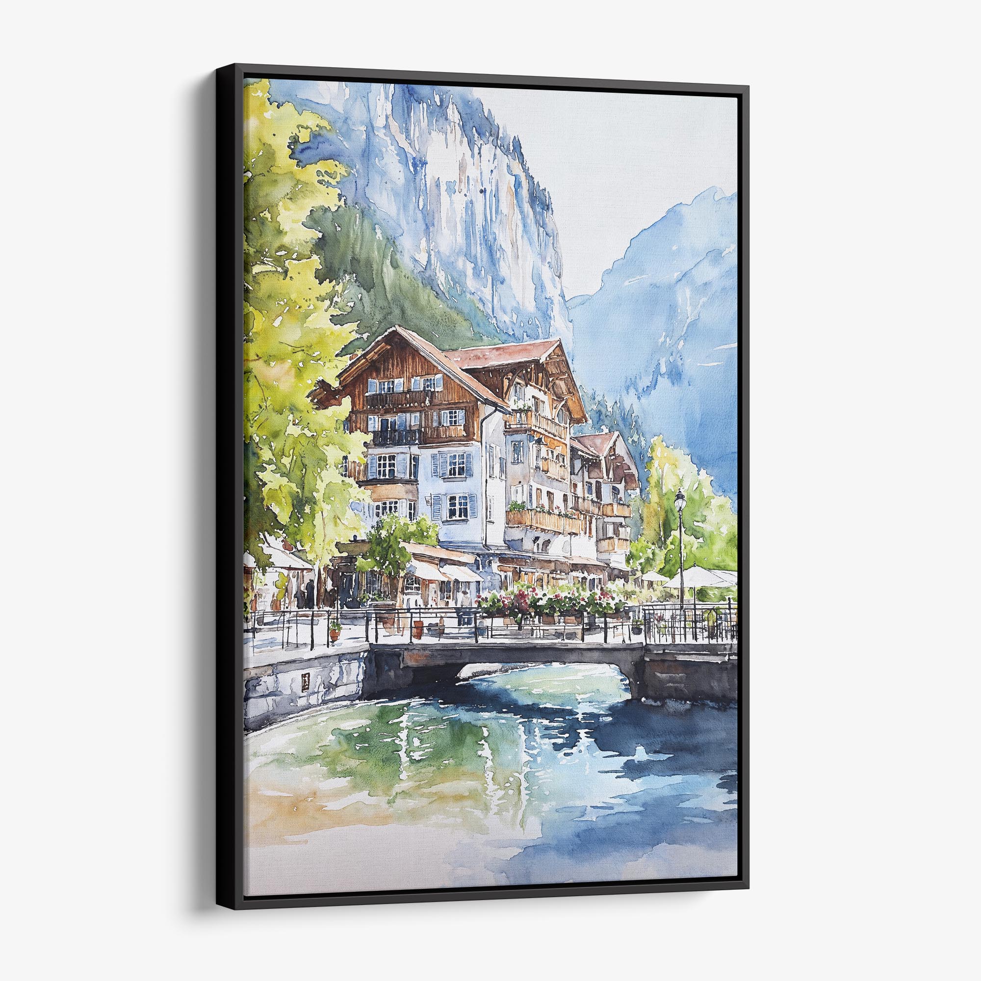 Bring the beauty of Lauterbrunnen into your space with this watercolor canvas print. Featuring picturesque houses and lush greenery, it’s perfect for your living room, office, or bedroom.