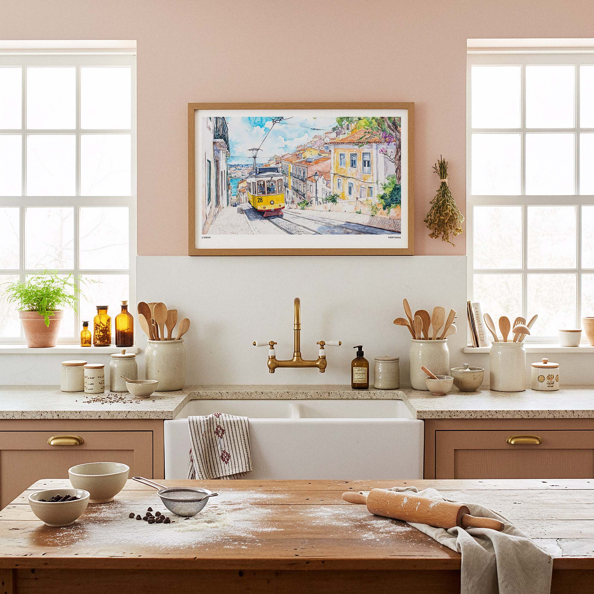 Capture the essence of Lisbon with this watercolor art print featuring the iconic yellow tram gliding through charming streets. Ideal for travel enthusiasts and art lovers alike.