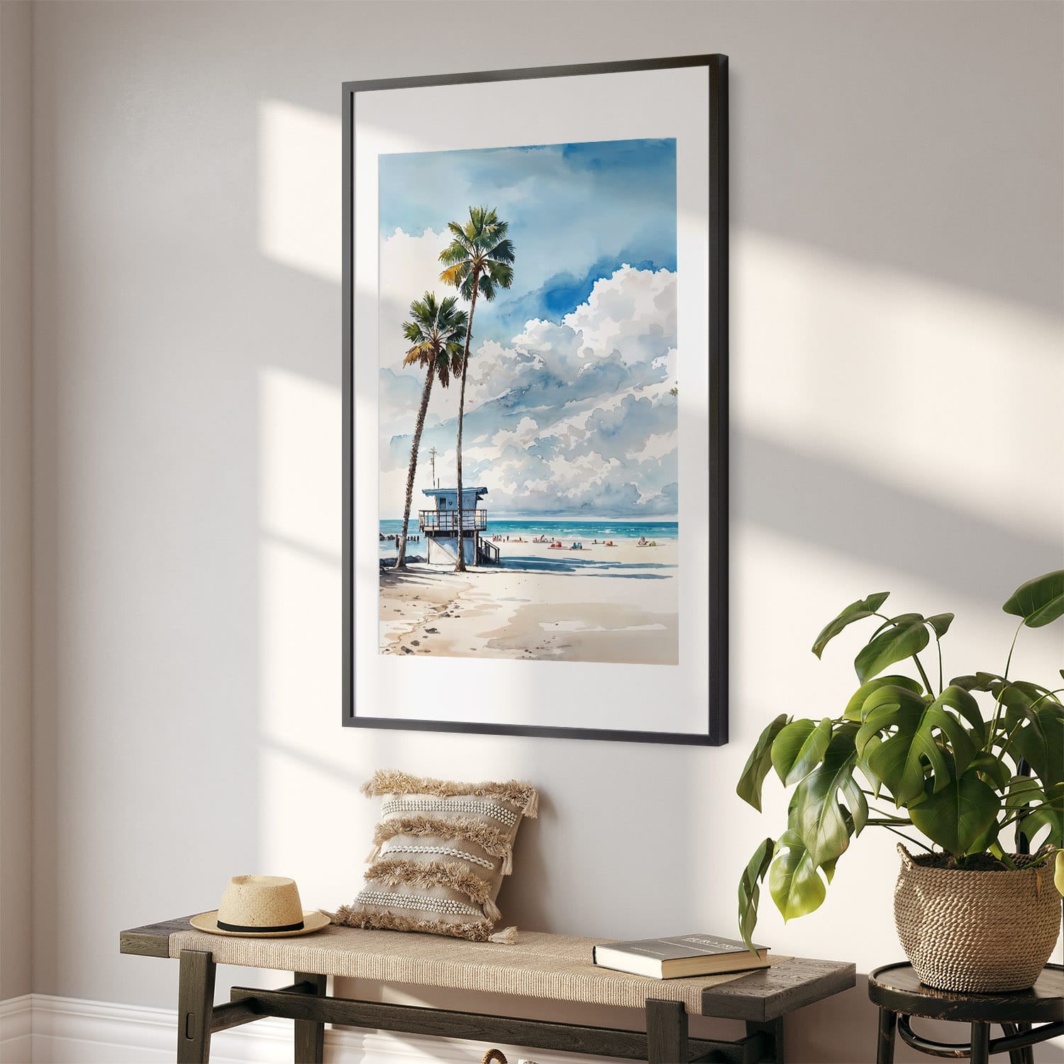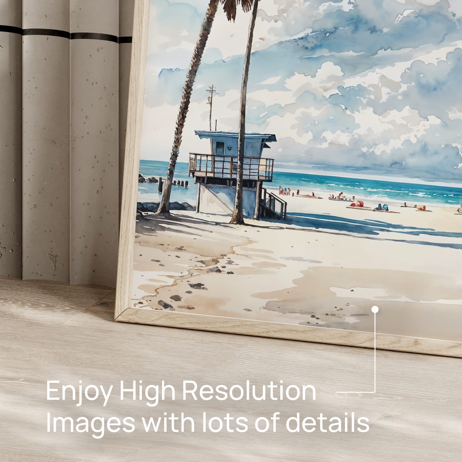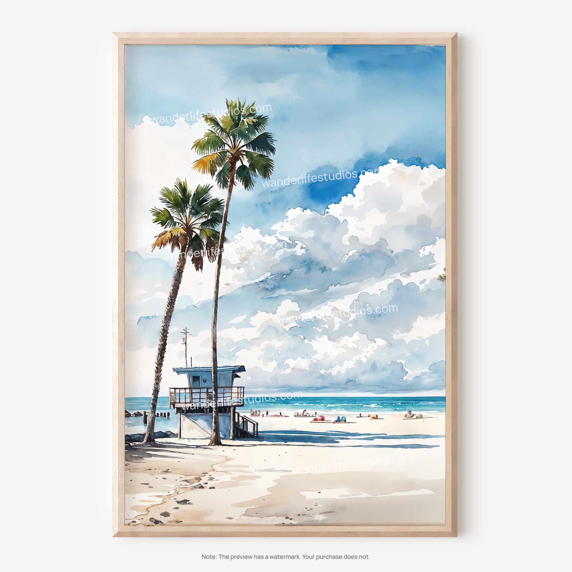 This artwork highlights a bright lifeguard tower surrounded by palm trees and soft sand, embodying the relaxed beach vibe of Los Angeles. The watercolor technique adds a touch of warmth and fluidity, making it a perfect addition to any room. Available as a high-resolution digital file, you can easily print this design in various sizes at home or through a local print shop. Suitable for living rooms, bedrooms, or even offices, it brings a piece of the coast to your everyday life. Enjoy immediate access and refresh your decor effortlessly.
